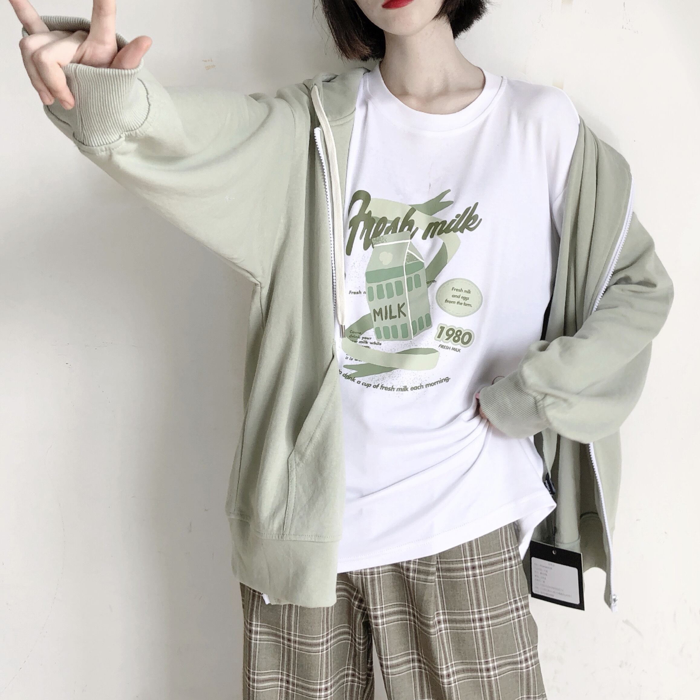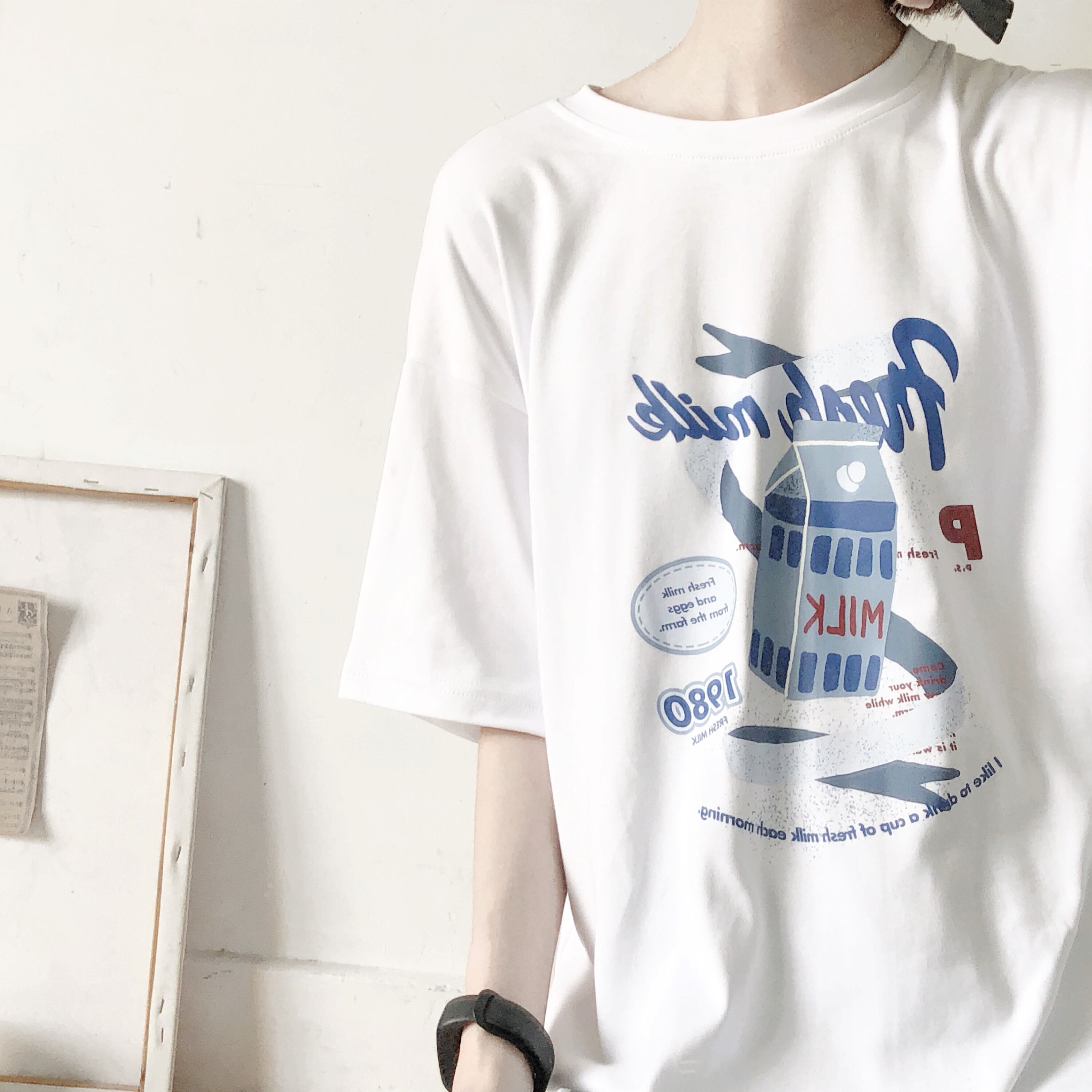 pinksavior青と緑の夢のようなミルクプリントオデルストレッチ半袖白Tシャツ女性の夏の新鮮な色 ホワイト ブルー サマー 夏物 グリーン PSTB34239568058