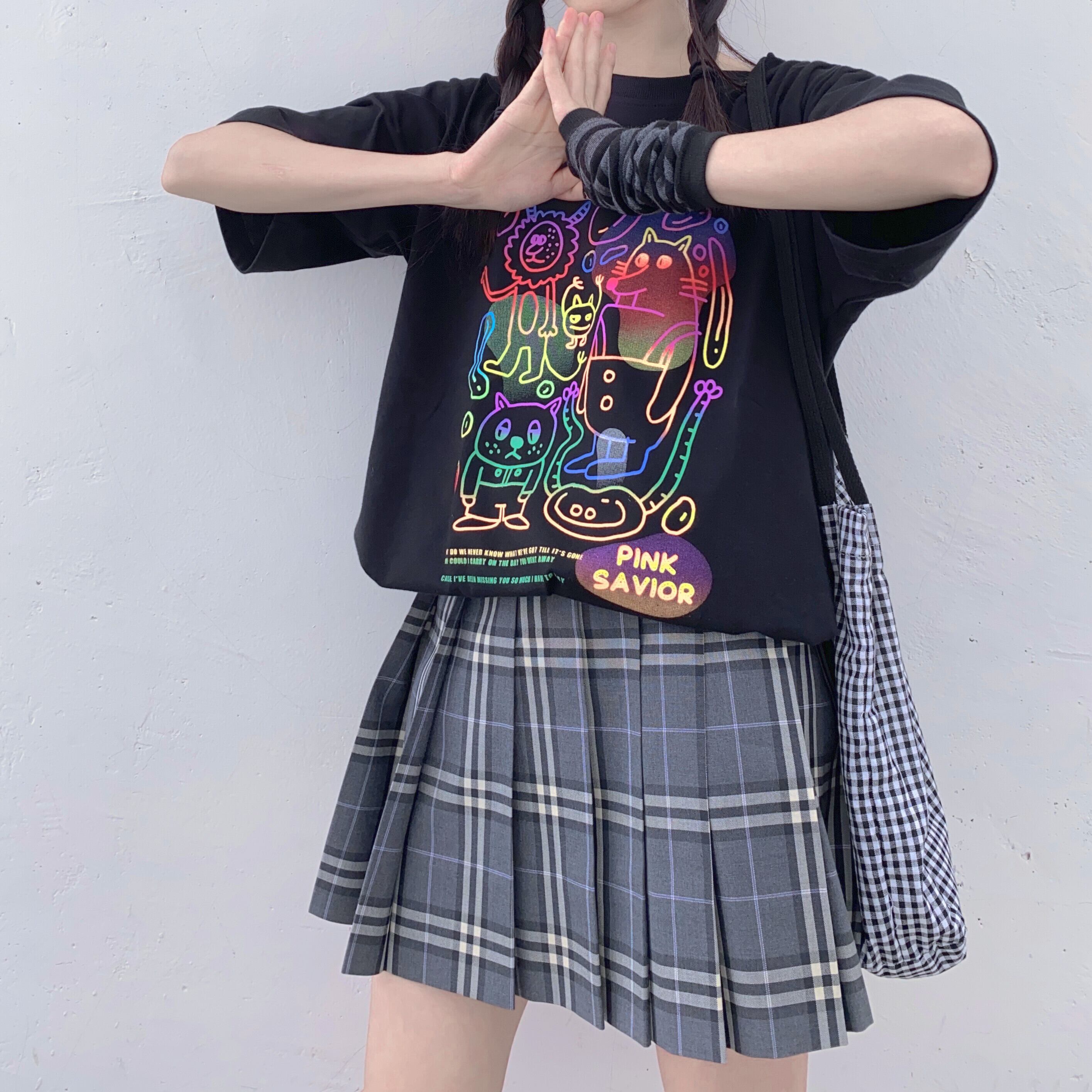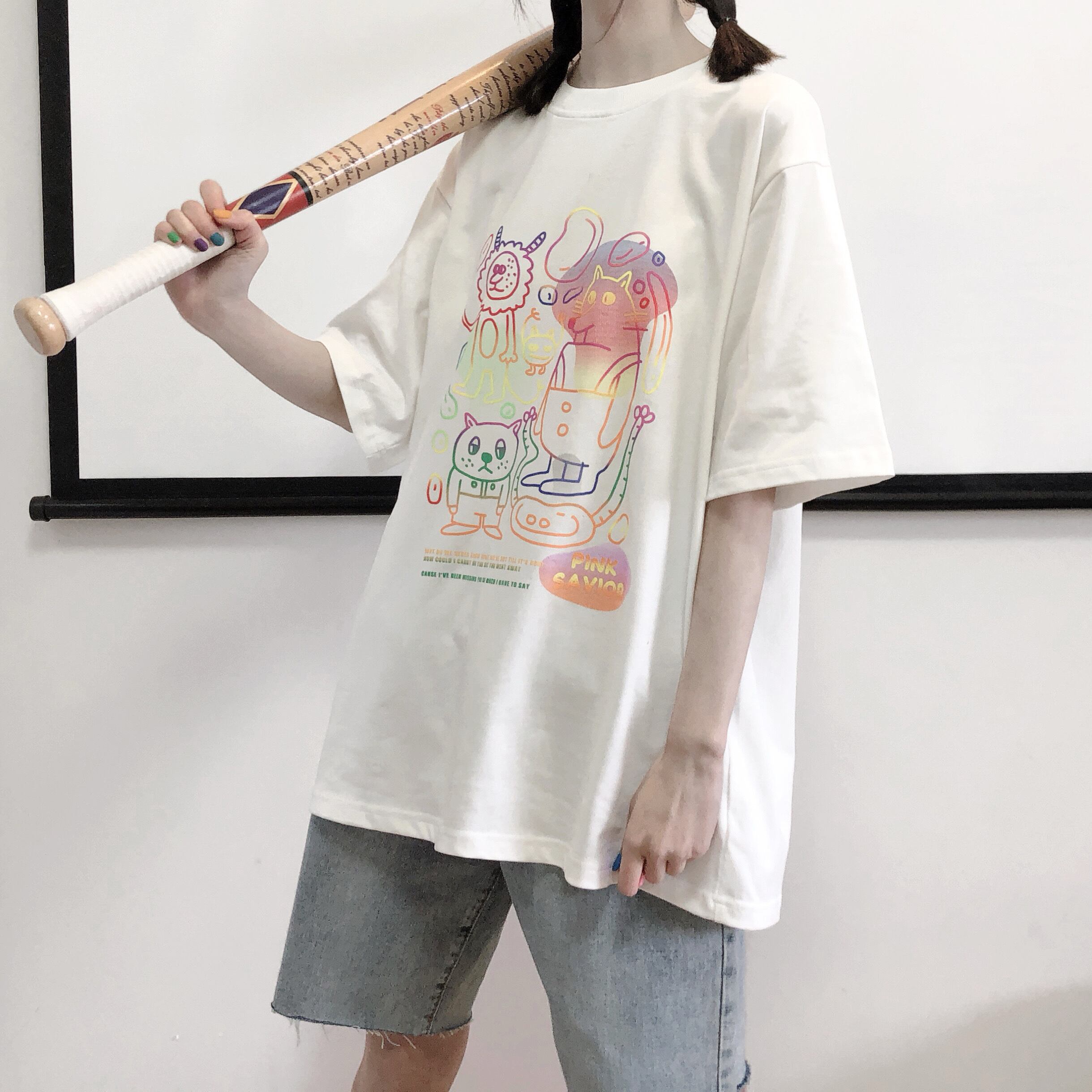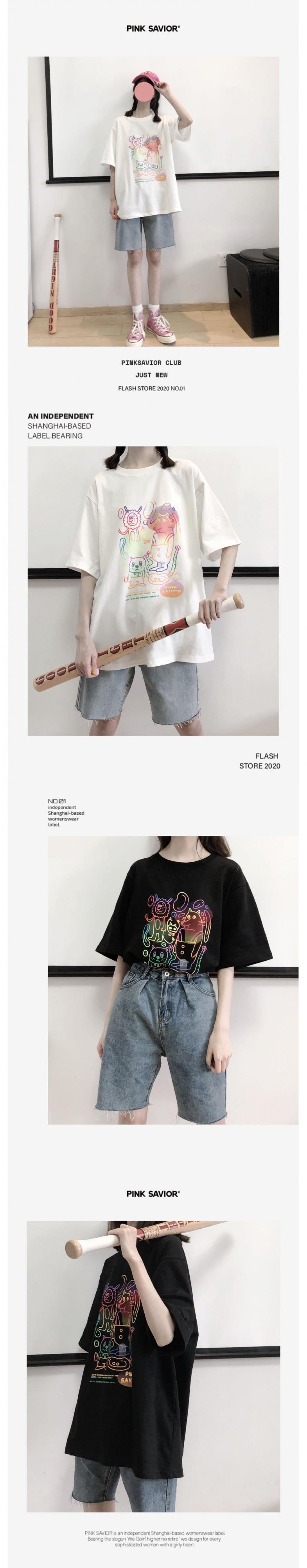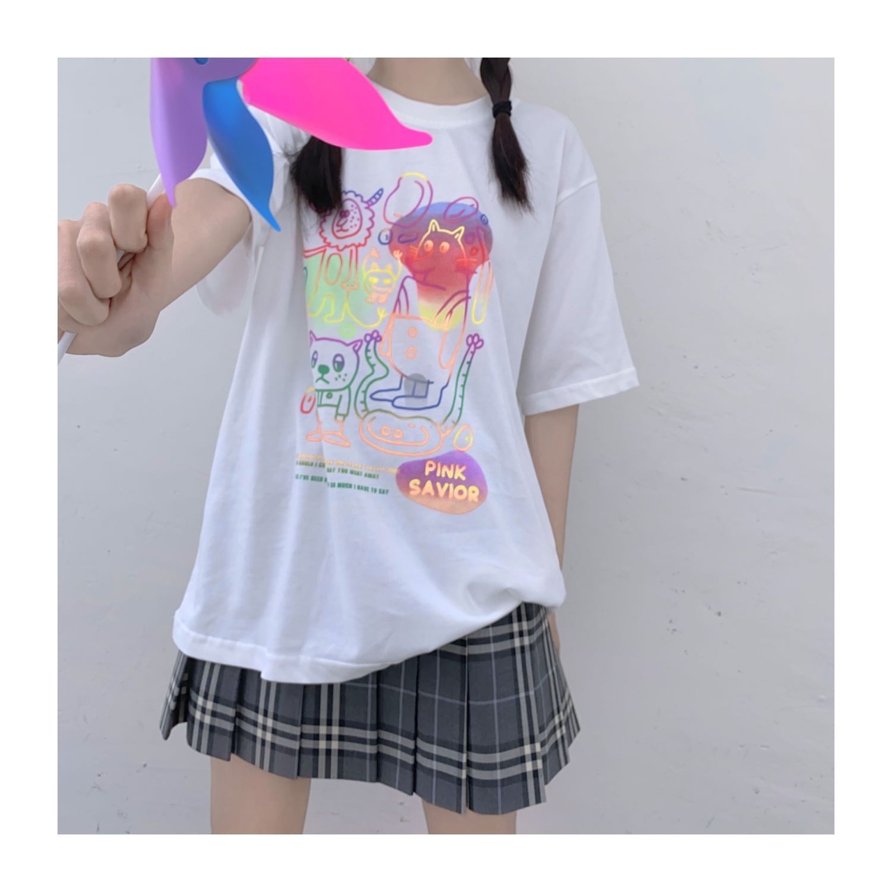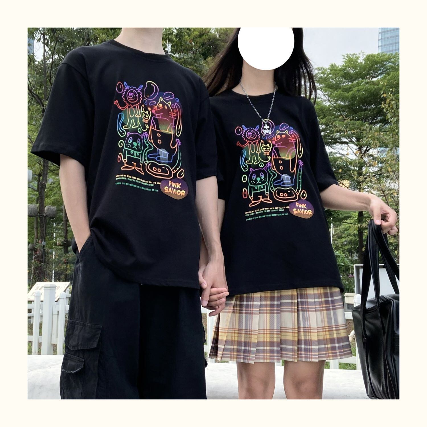【送料無料】 pinksavior暖かい虹の漫画純綿半袖Tシャツ女性の夏のパートナー特別な手描きのカップル コットン プリント サマー 夏物 ピュア PSTB94047357095