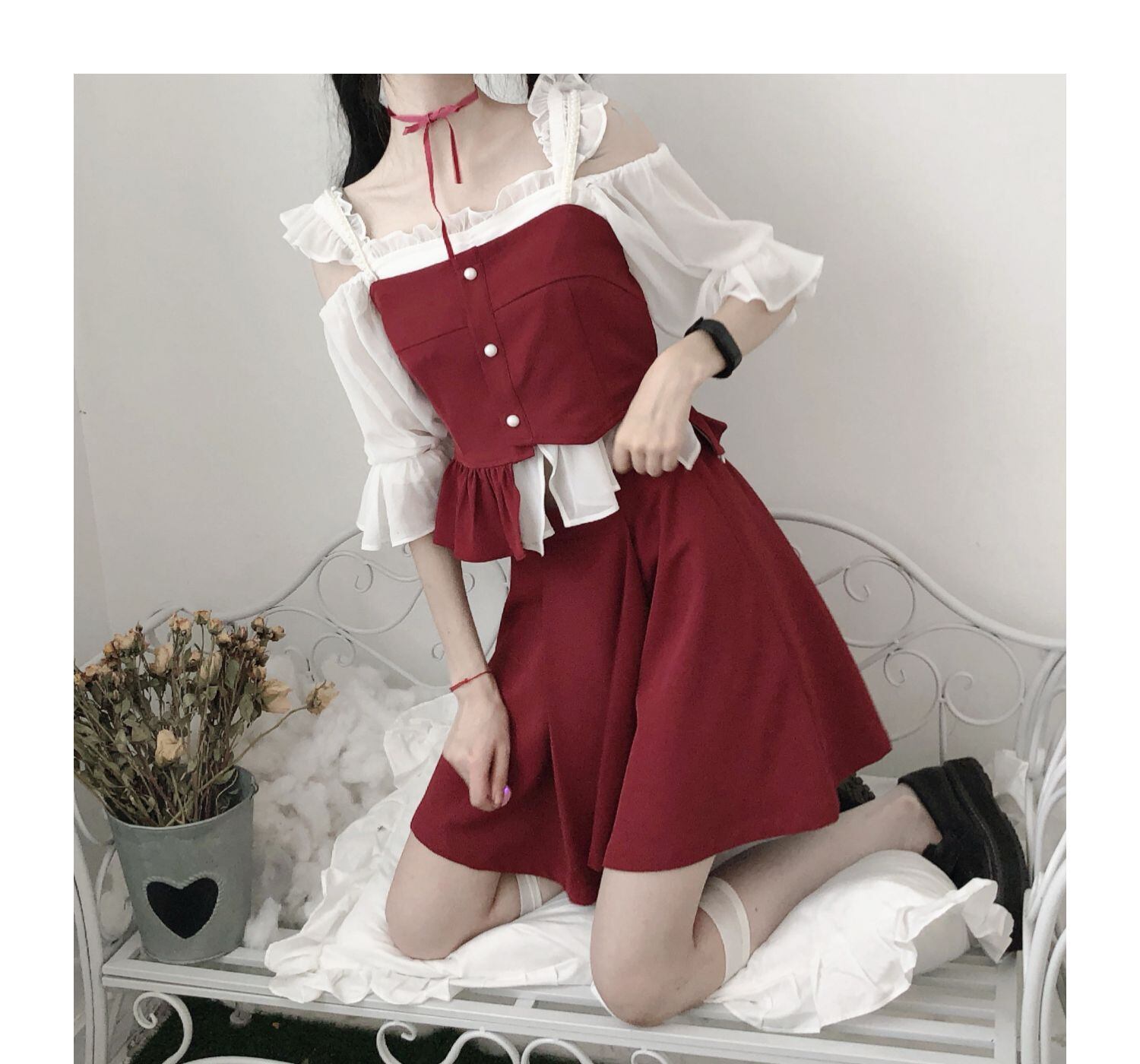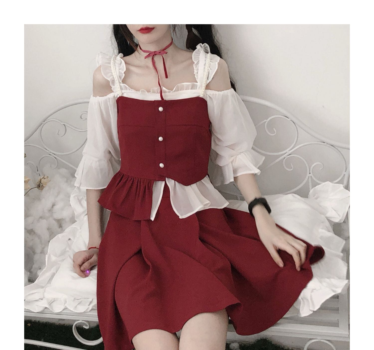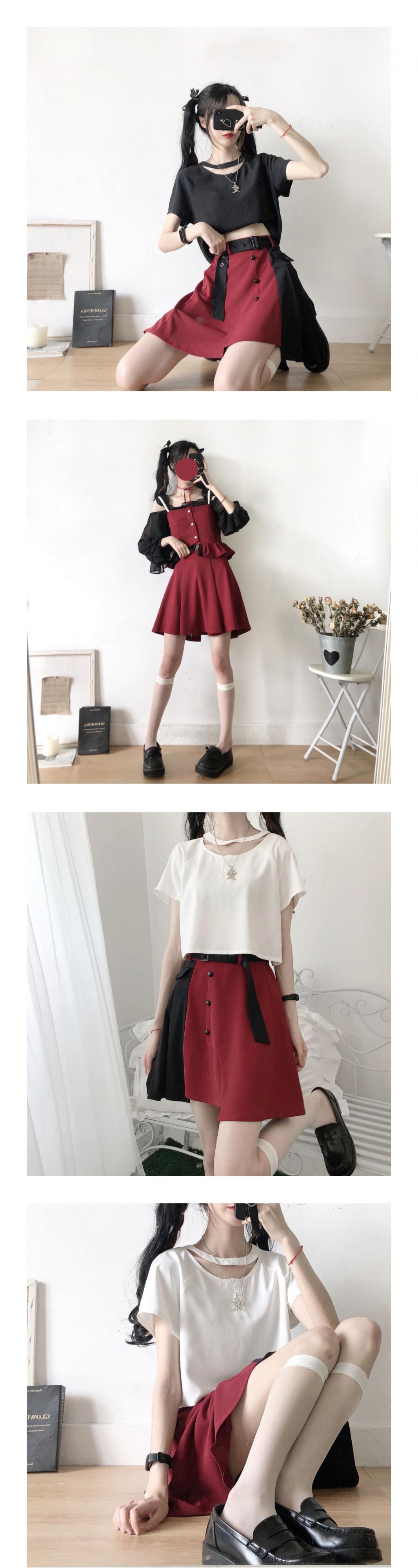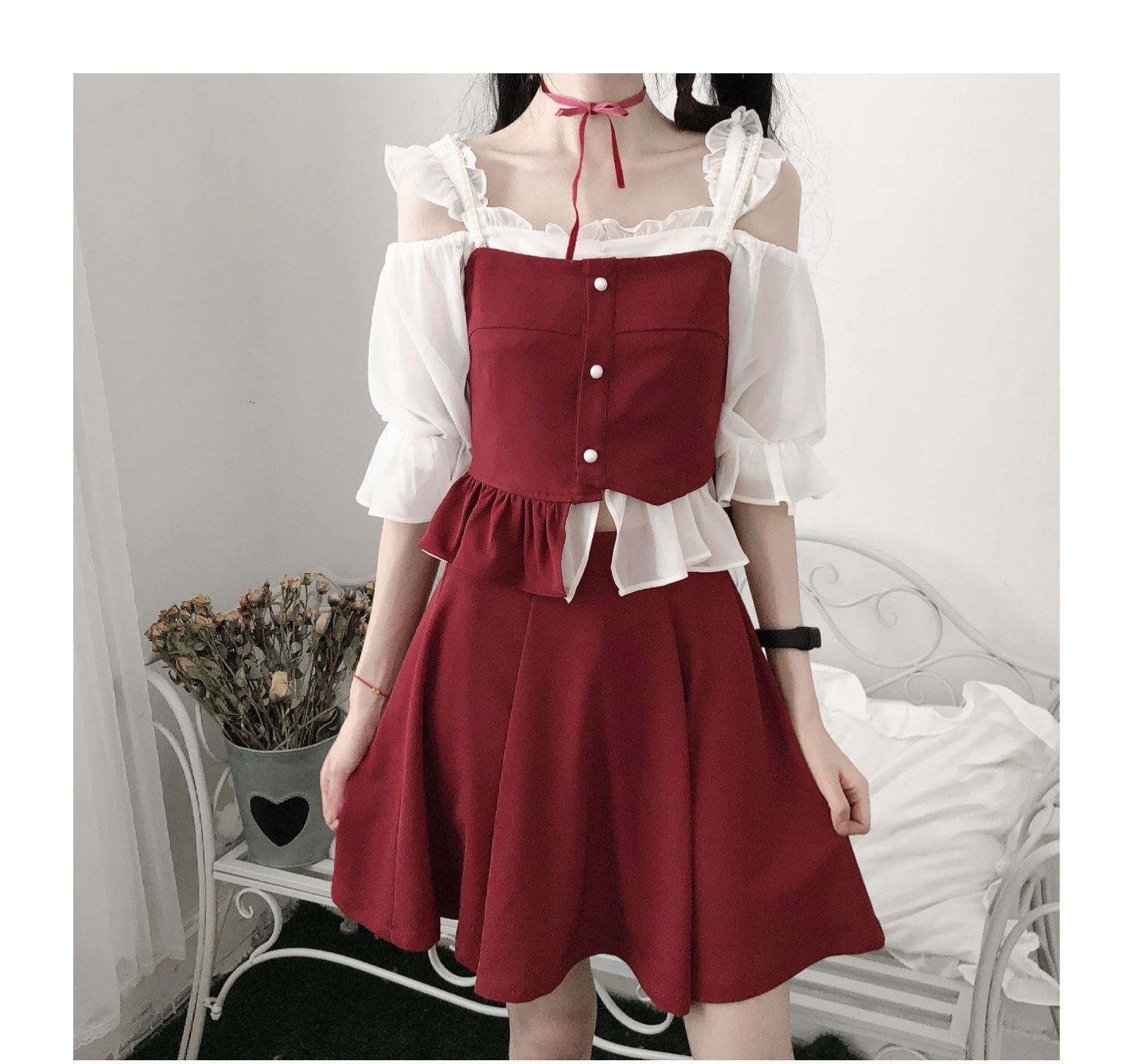 色:ホワイトカラーデザイントップ,ブラックカラーデザイントップ,ポジティブレッドホワイトパールショルダーストラップショートスリング,ポジティブレッドブラックパールショルダーストラップショートスリング,赤いスカート,赤と黒のステッチデザインスカート,ホワイトシフォンベース,ブラックシフォンベース