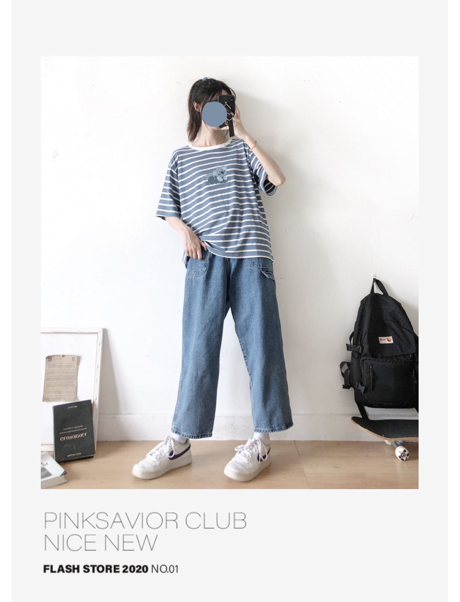 【送料無料】 pinksavior青と白の縞模様のコアラかわいいストレッチモーダルアイスシルクテクスチャTシャツ女性の夏のショートトップ ホワイト ブルー 大人ガーリー スウィート キュート カジュアル サマー 夏物 ストライプ PSTB73937797630
