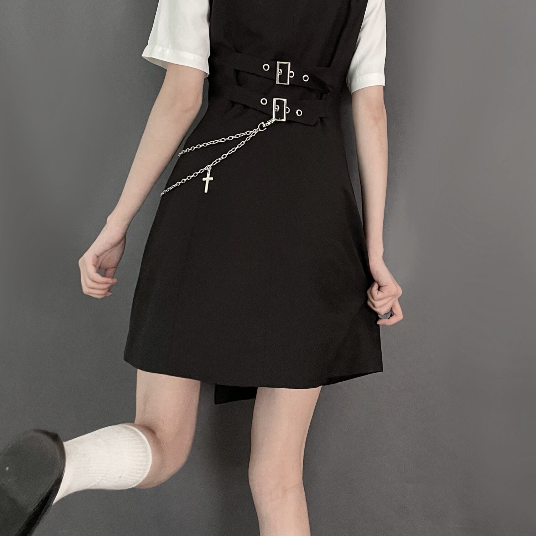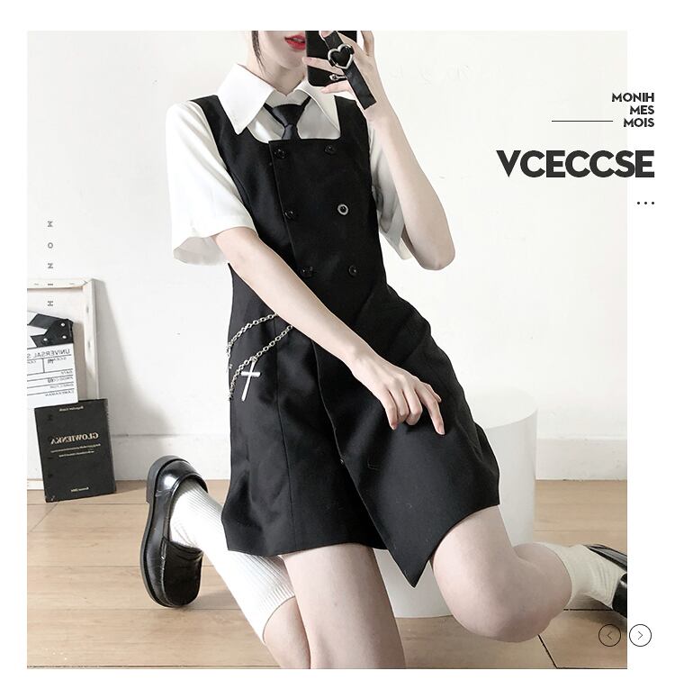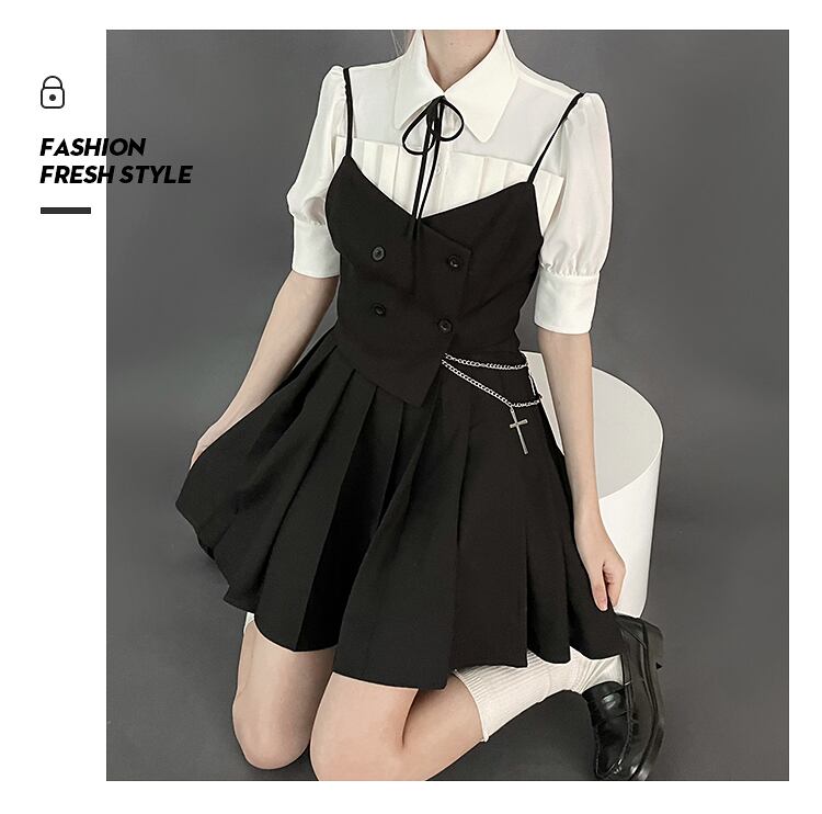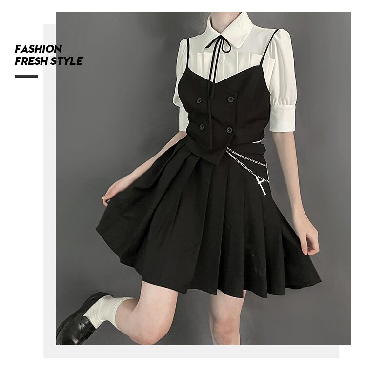 色:ウエストチェーンを送るベストスカート,スリングスーツコルセット,ウエストチェーン付きブラックプリーツスカート,ネクタイ付きレギュラー半袖シャツ,胸プリーツシャツ