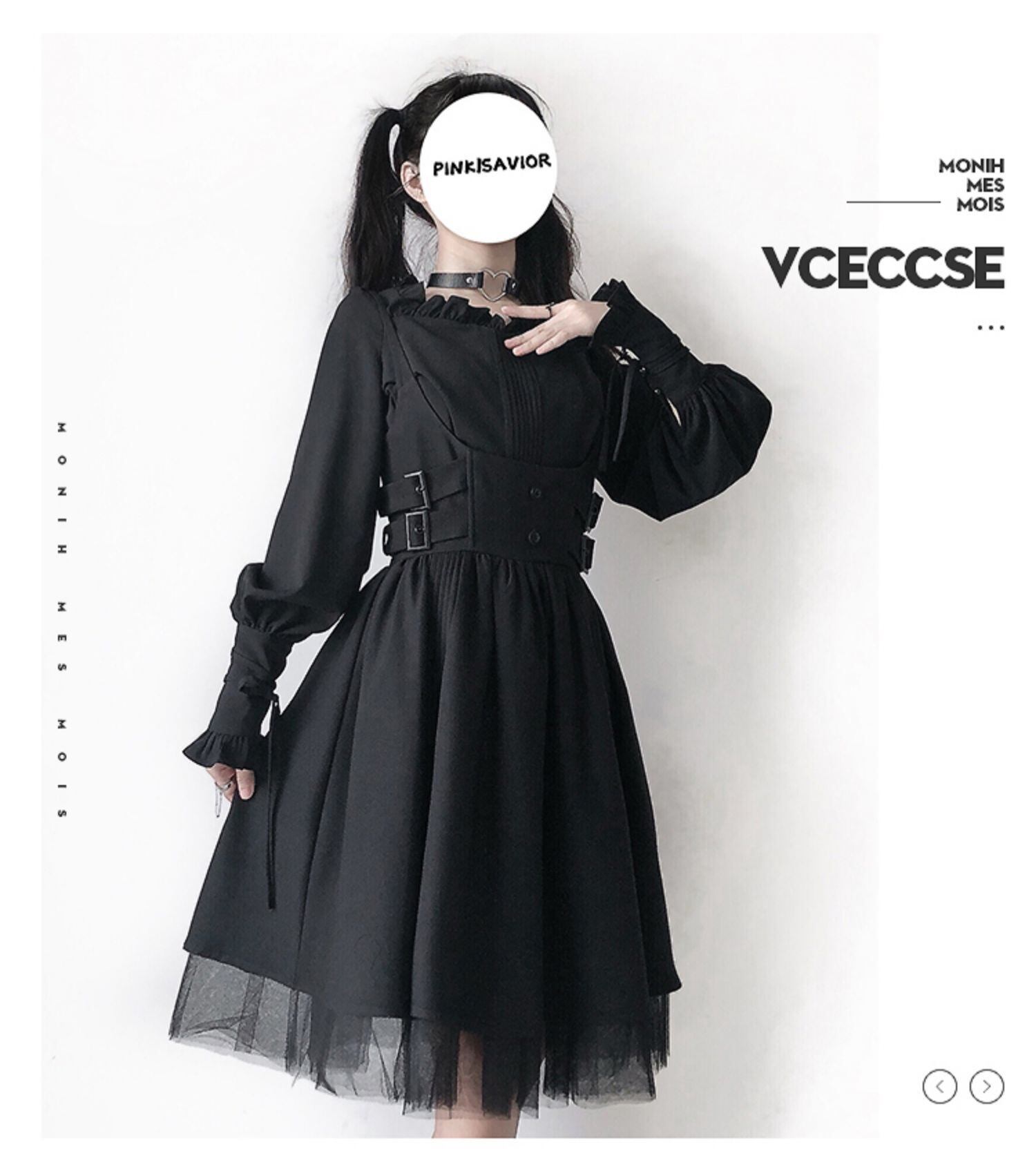 色:黒のデザインシャツ,ストラップドレス,マント,赤いデザインのシャツ