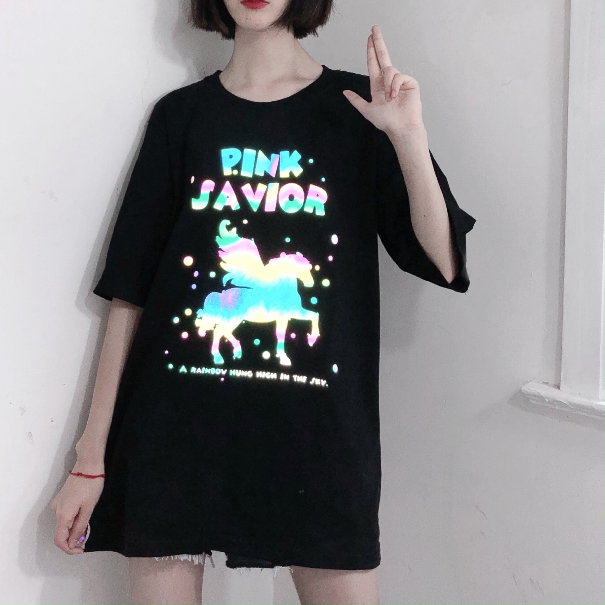 【送料無料】 pinksavior反射色ユニコーンボトムミドル丈ブラックコットン半袖Tシャツ女性ルーズ PSTB6736712032