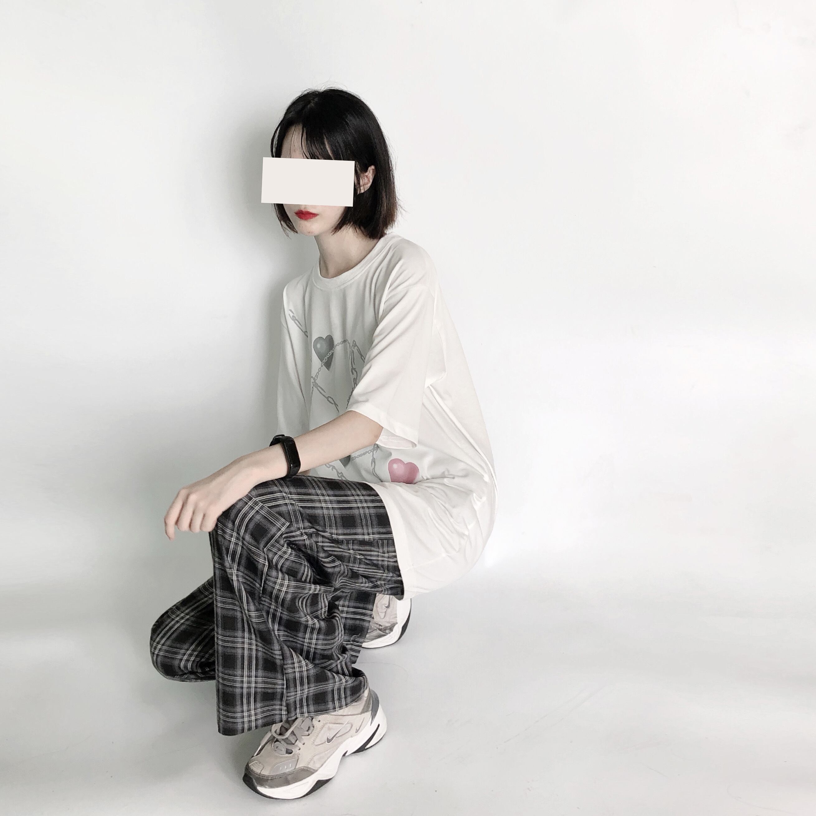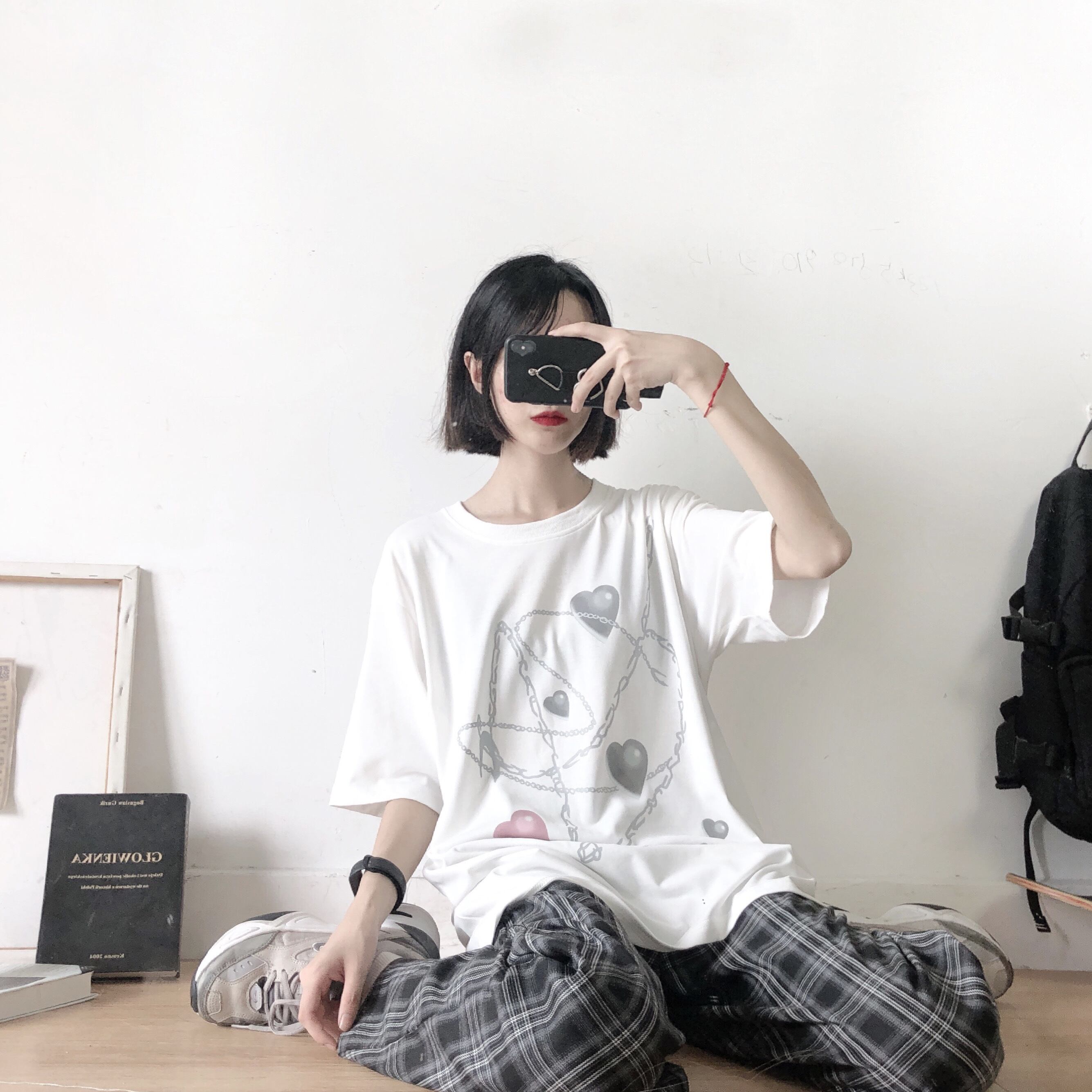 【送料無料】 pinksaviorハートノットチェーンデザインプリントオールマッチコットンブラック半袖Tシャツ女性ルーズホワイトシャツ PSTB59983782610