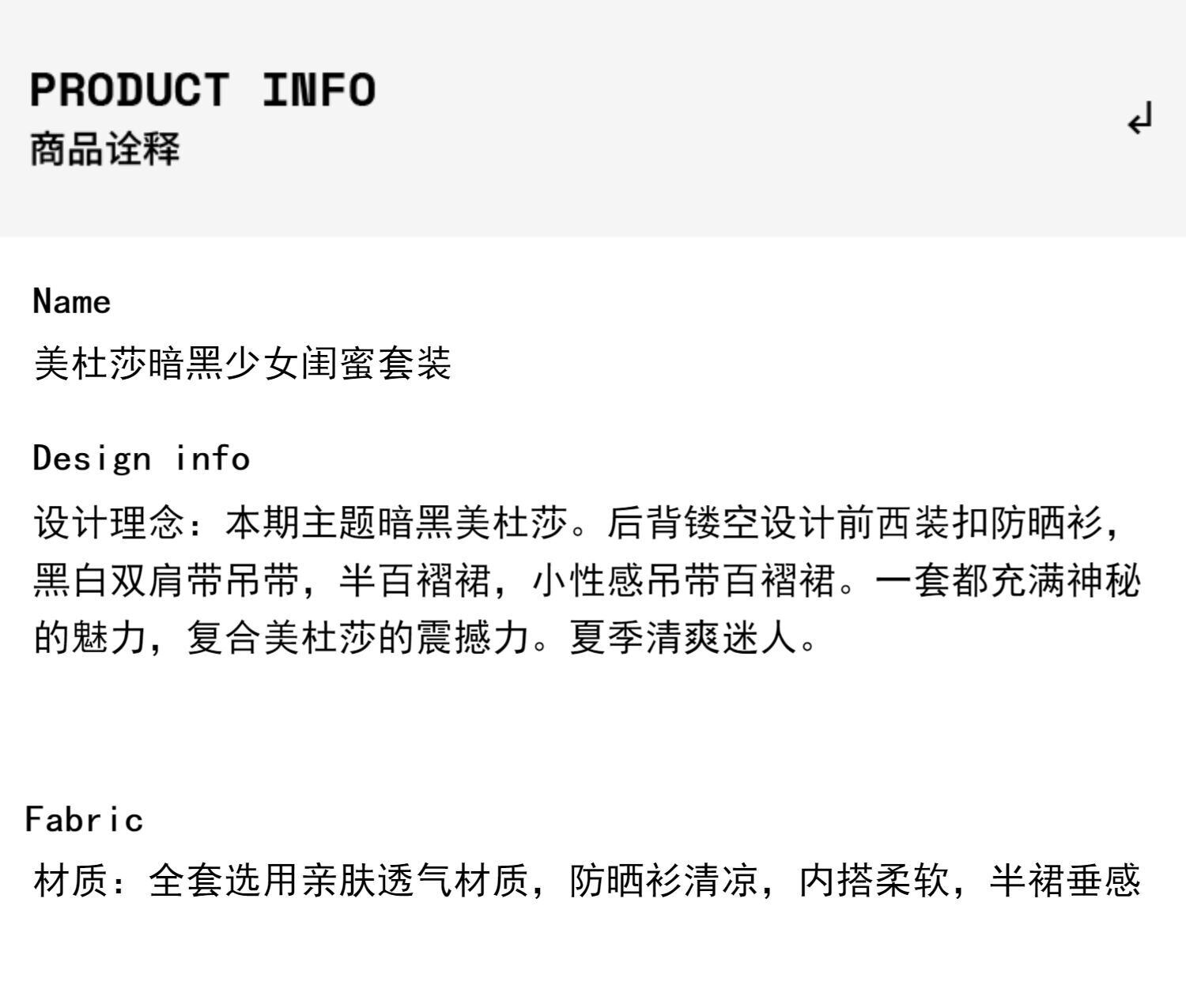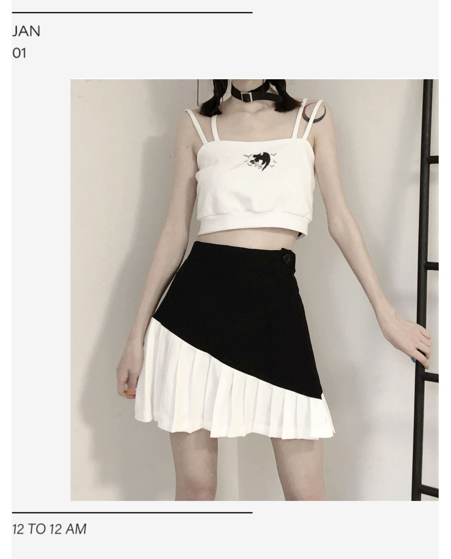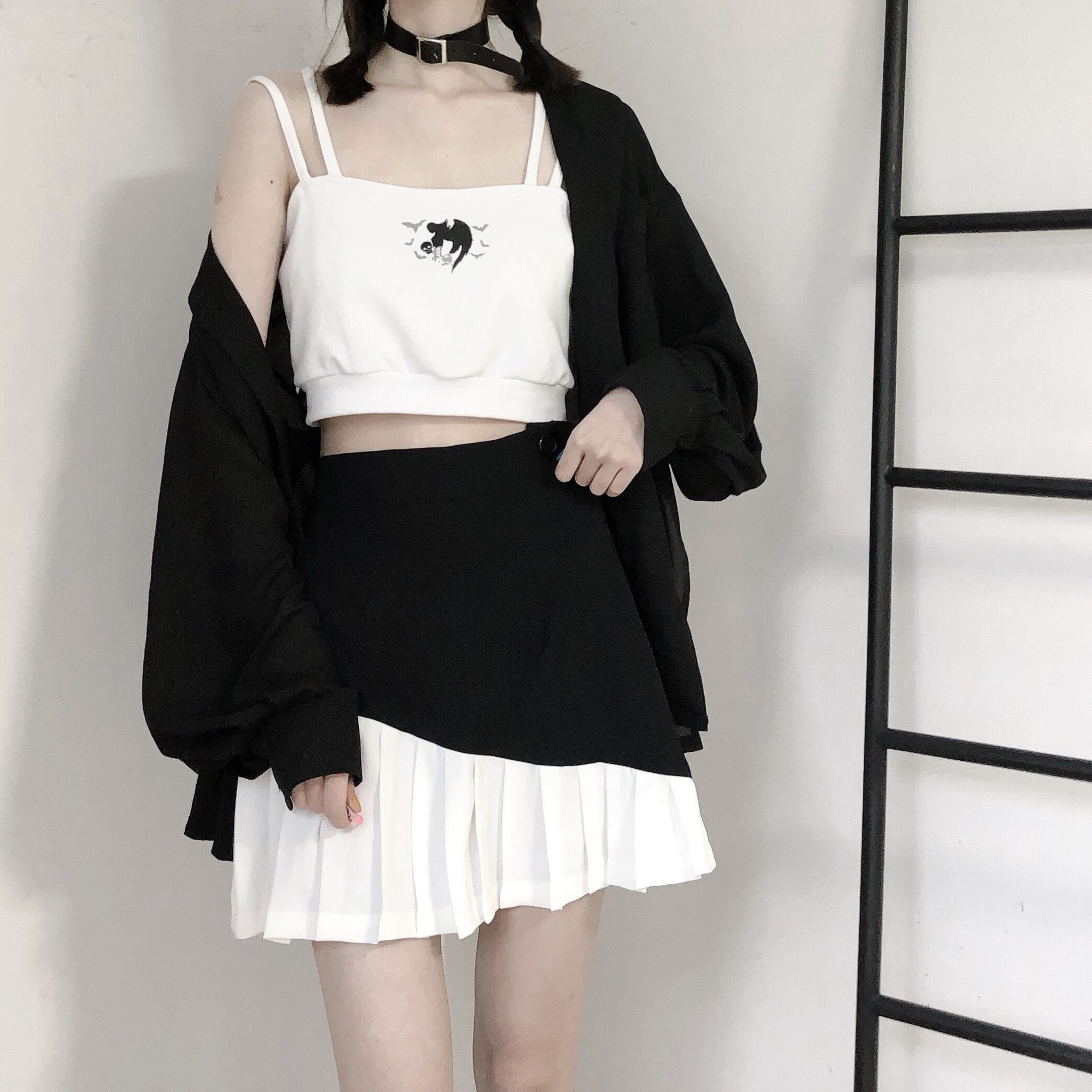 色:白いダブルショルダーストラップスリング,黒のダブルショルダーストラップスリング,ホワイトデザインのシフォン日焼け止めシャツ,ブラックデザインのシフォン日焼け止めシャツ,黒のプリーツサスペンダースカート,グレーのプリーツサスペンダースカート,黒と白のプリーツスカート