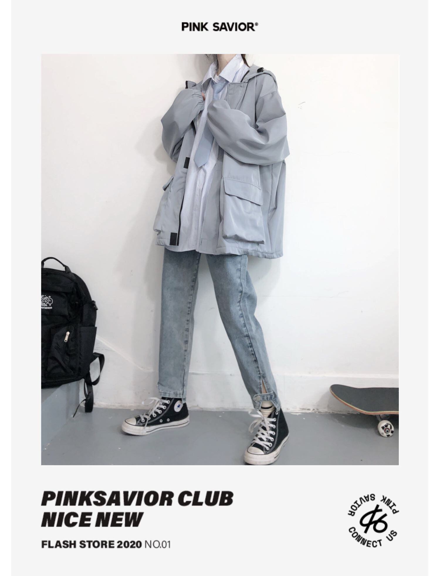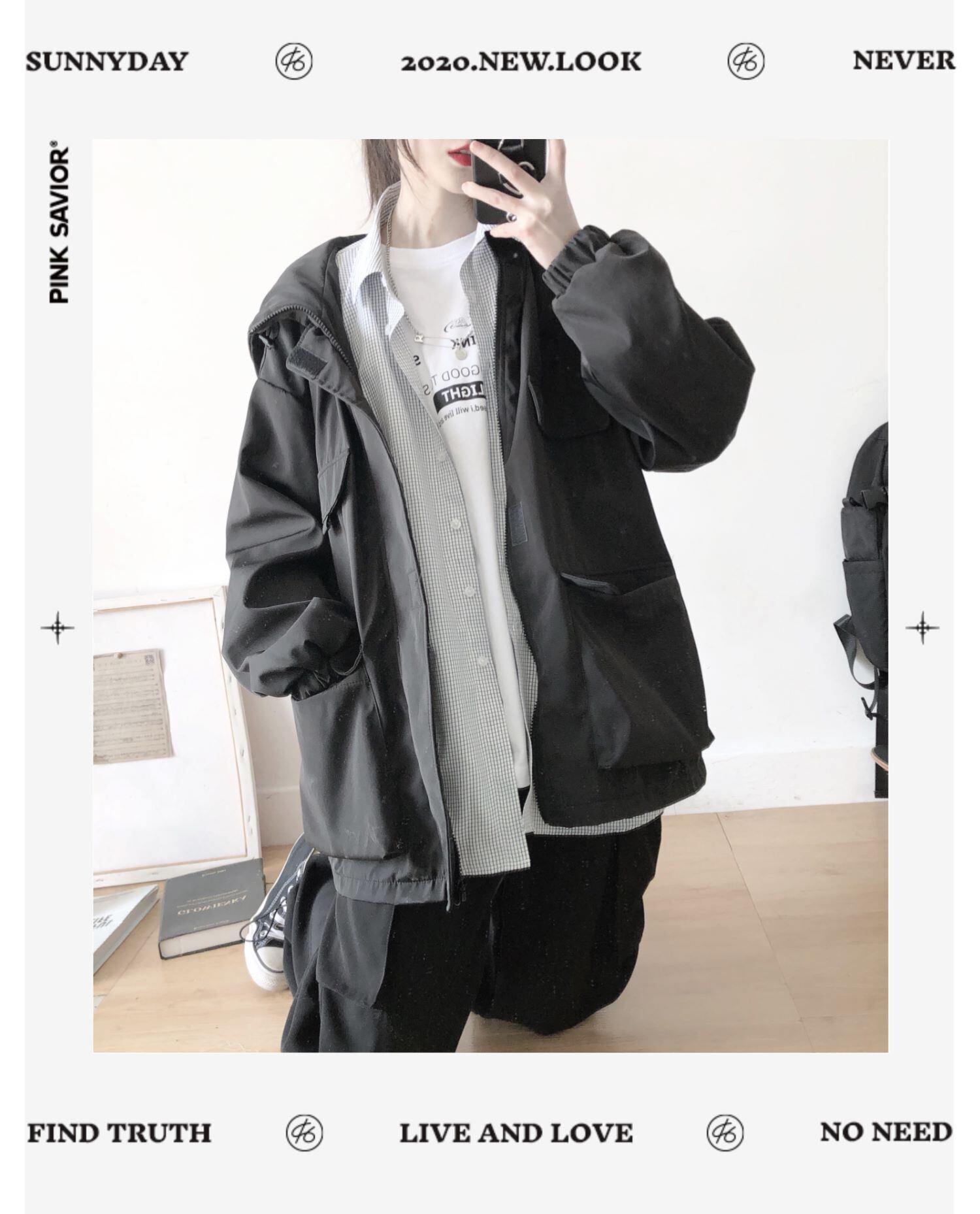 【送料無料】 pinksaviorブルーとブラックの2色フード付きショートコートレディース防風ジッパージャケット初秋薄いドレープトップ オータム 秋物 PSTB84164327801