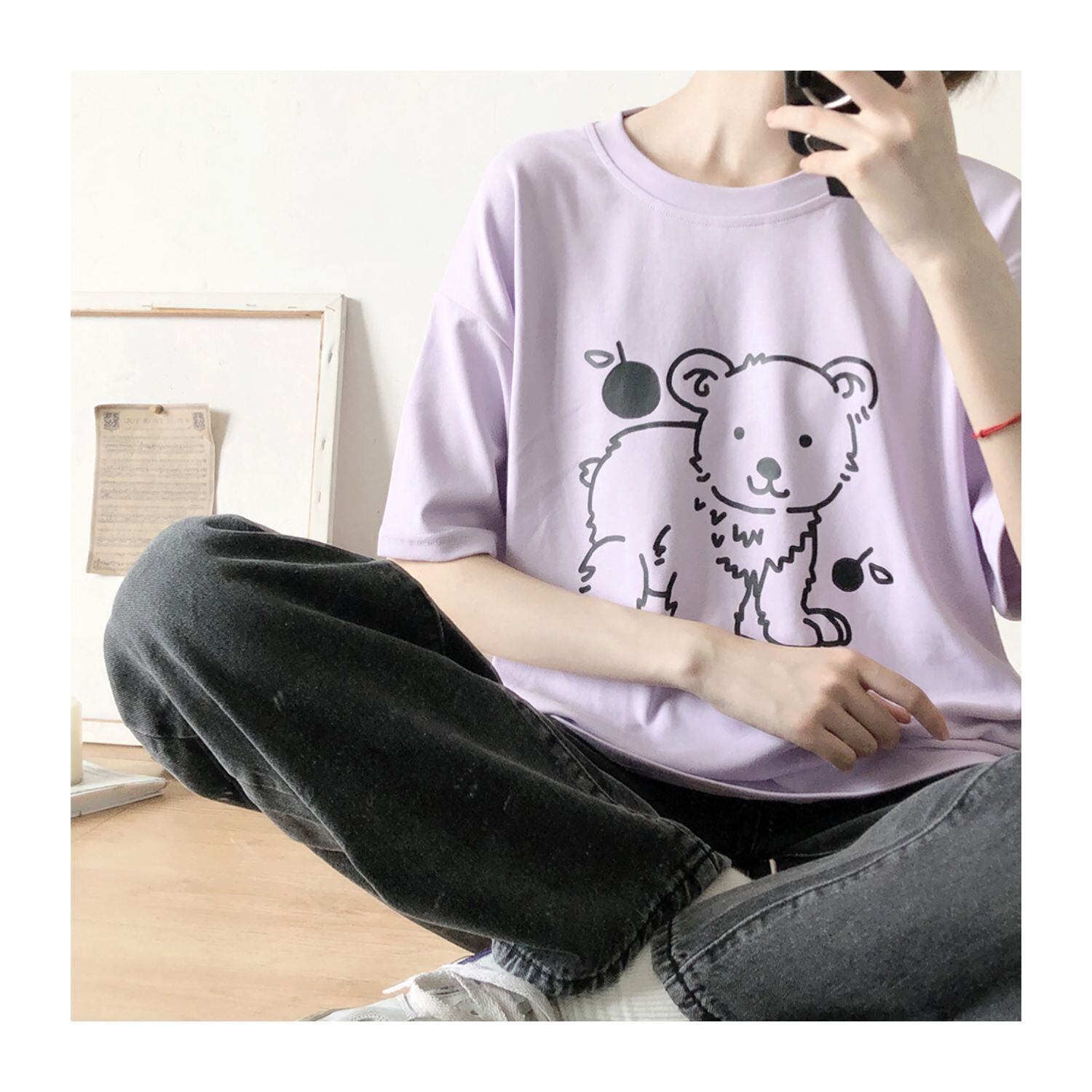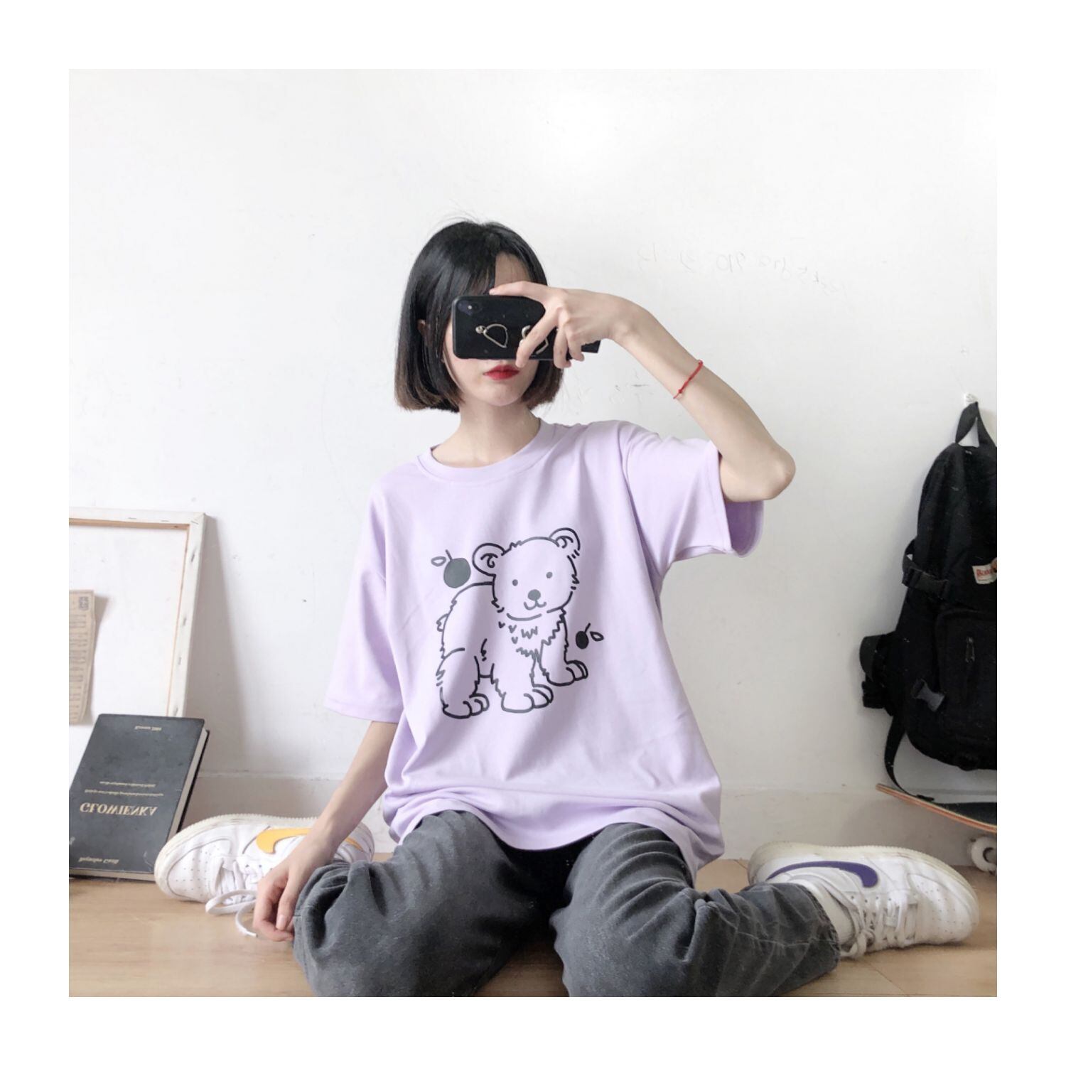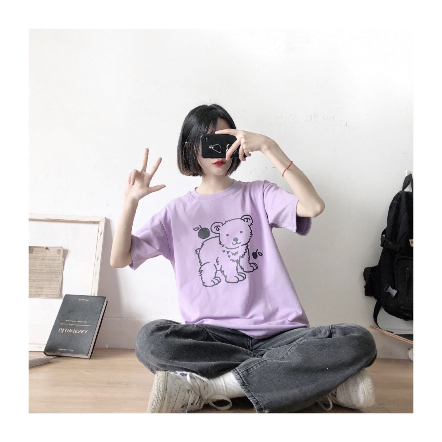 【送料無料】 pinksaviorパープルホワイトキュートベアプリントストレッチ半袖Tシャツ女性ワイルドスウィートブラウス 大人ガーリー カジュアル PSTB26113514606
