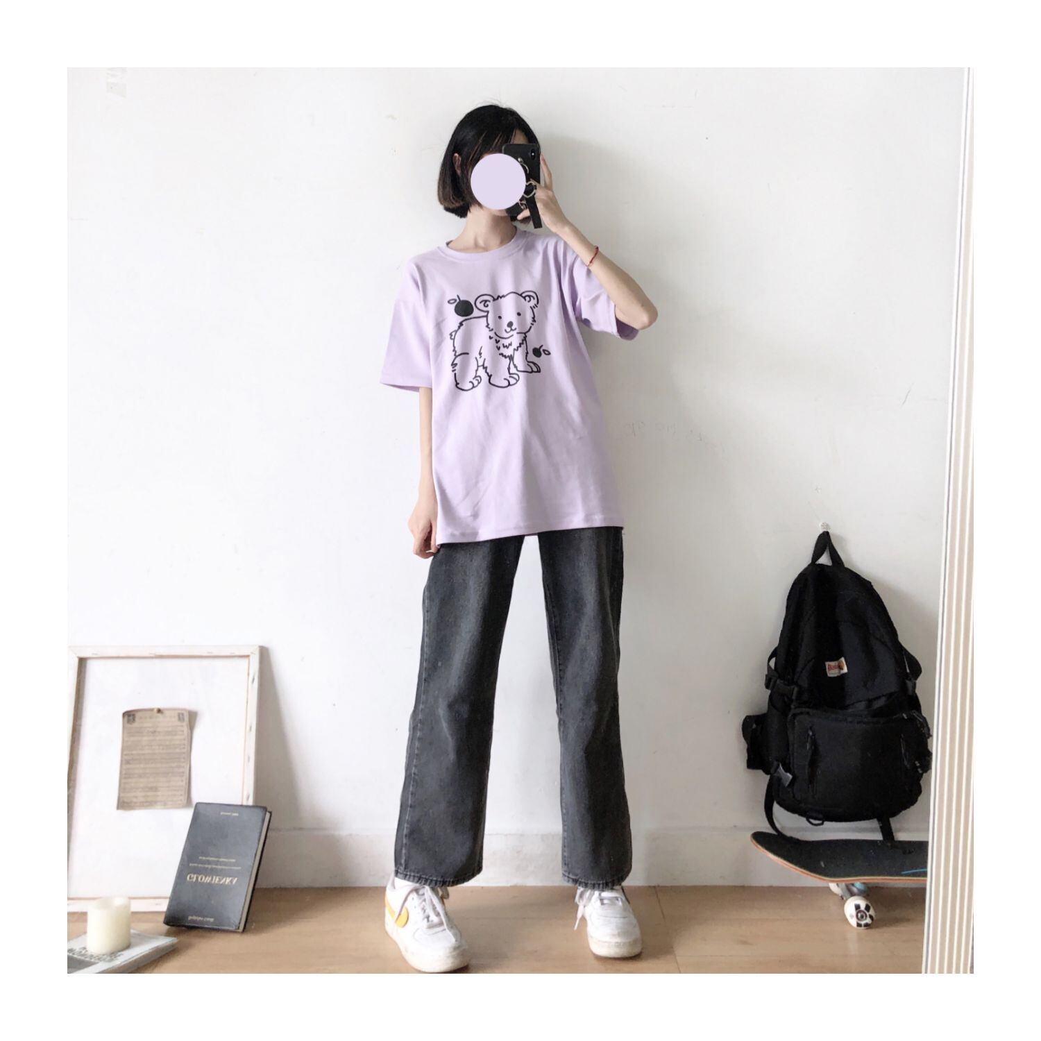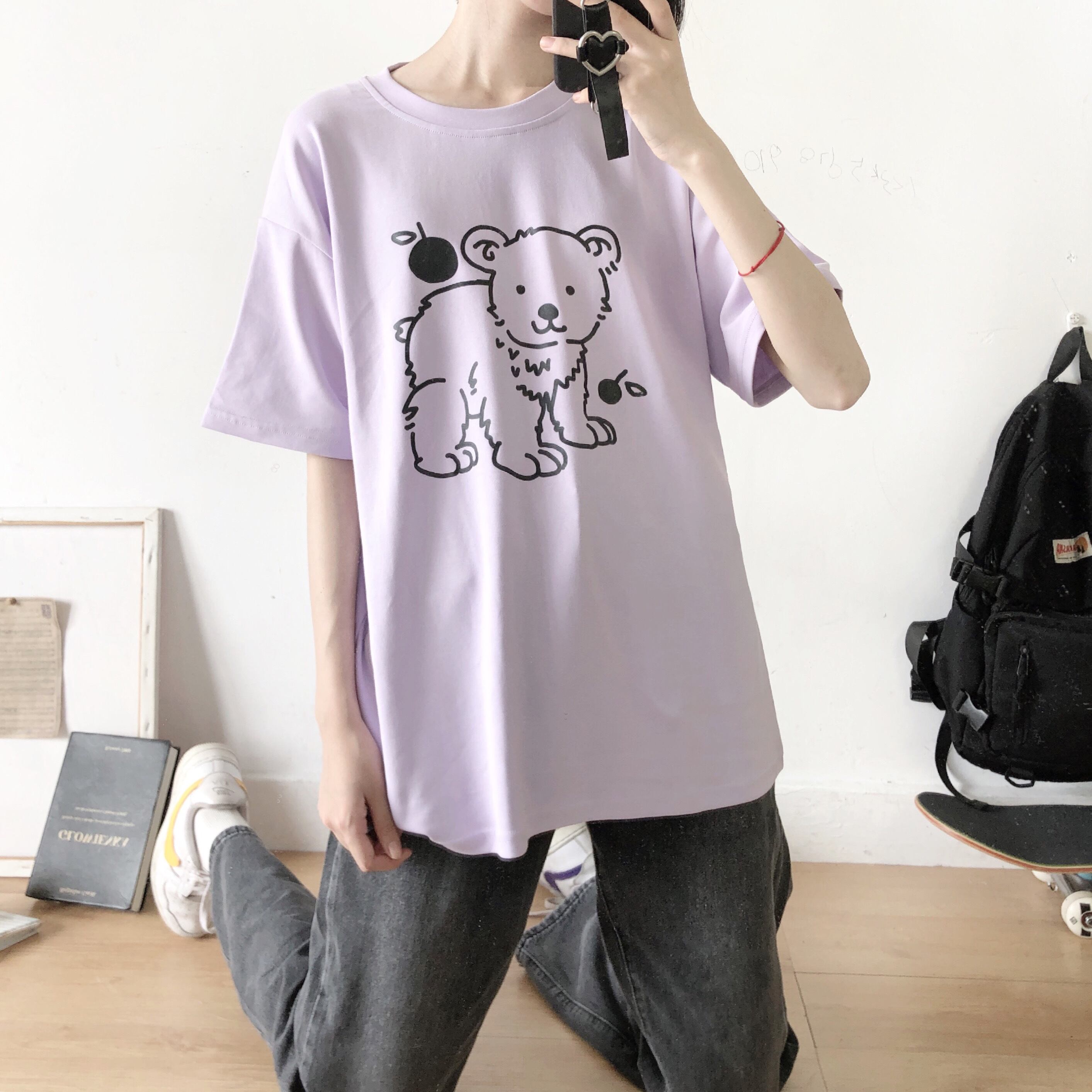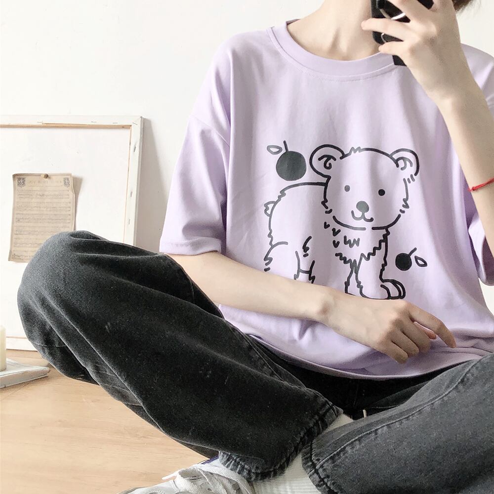 【送料無料】 pinksaviorパープルホワイトキュートベアプリントストレッチ半袖Tシャツ女性ワイルドスウィートブラウス 大人ガーリー カジュアル PSTB26113514606