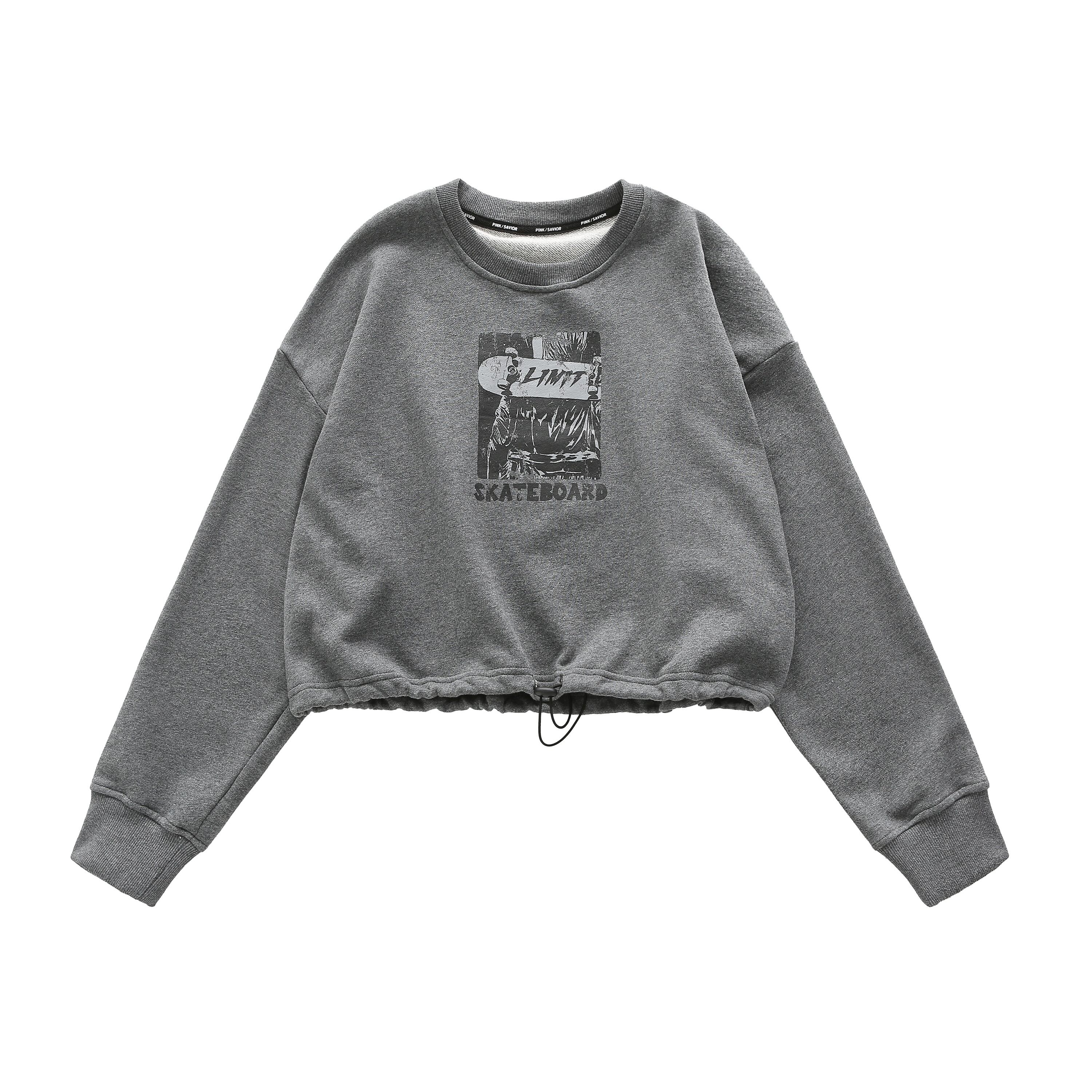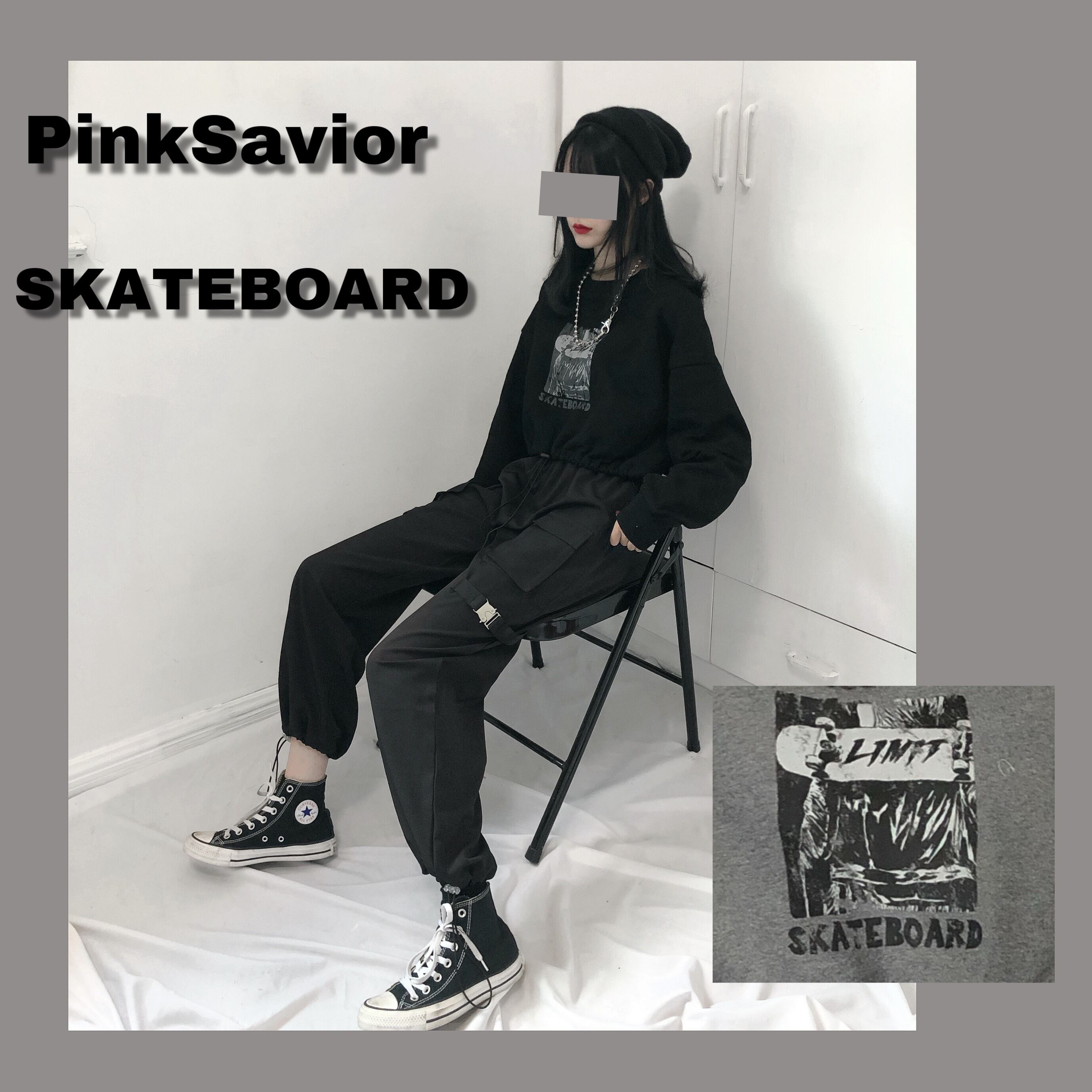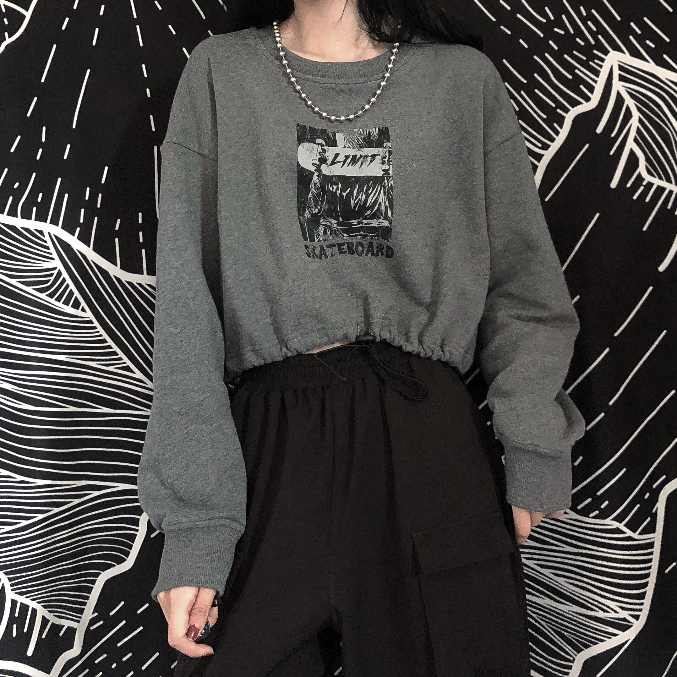 pinksaviorスケートボードエンボスルーズドローストリングクロップトップグレーブラックハイウエストショートセーター女性春と秋 ハイウェスト スプリング 春物 オータム 秋物 PSTB23816598676