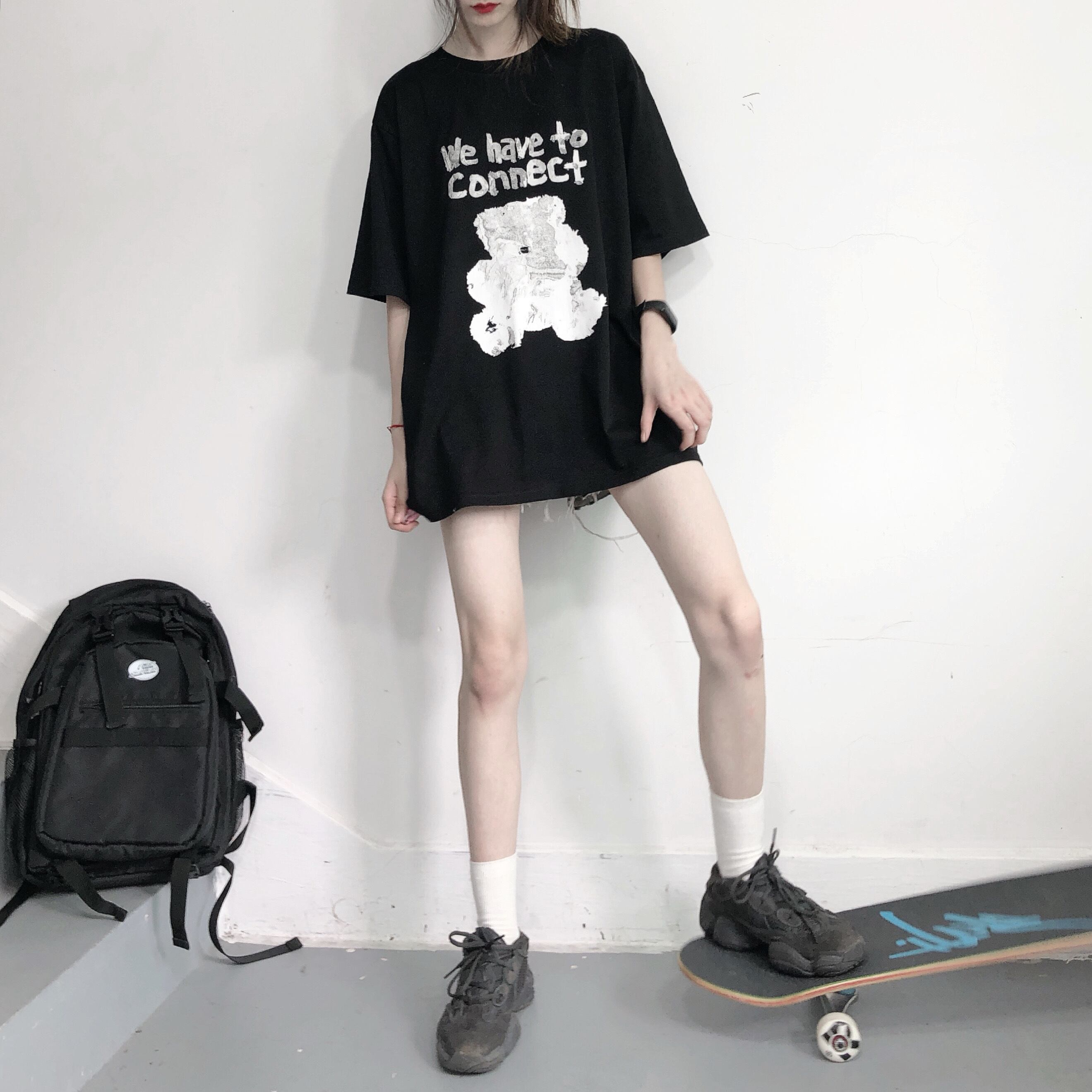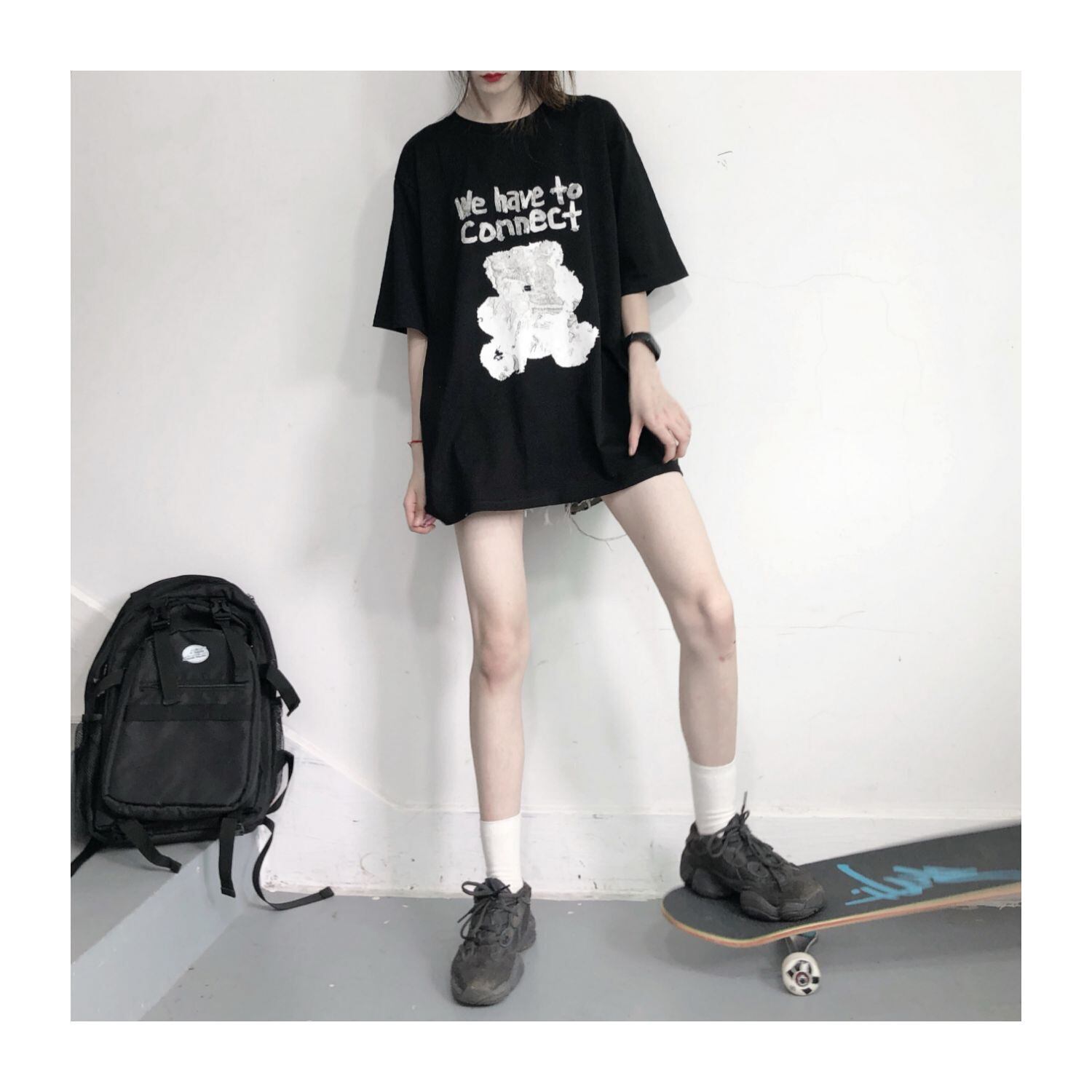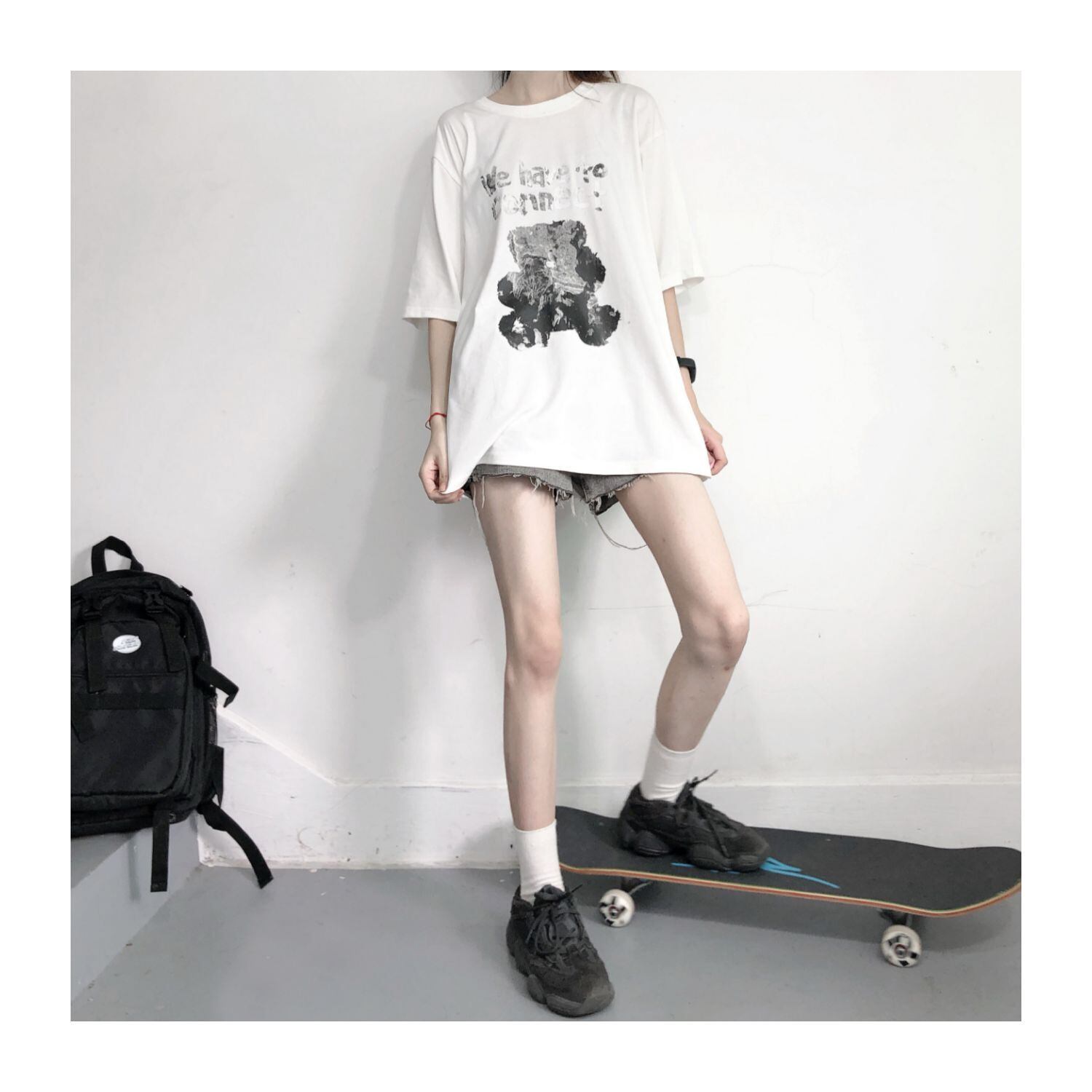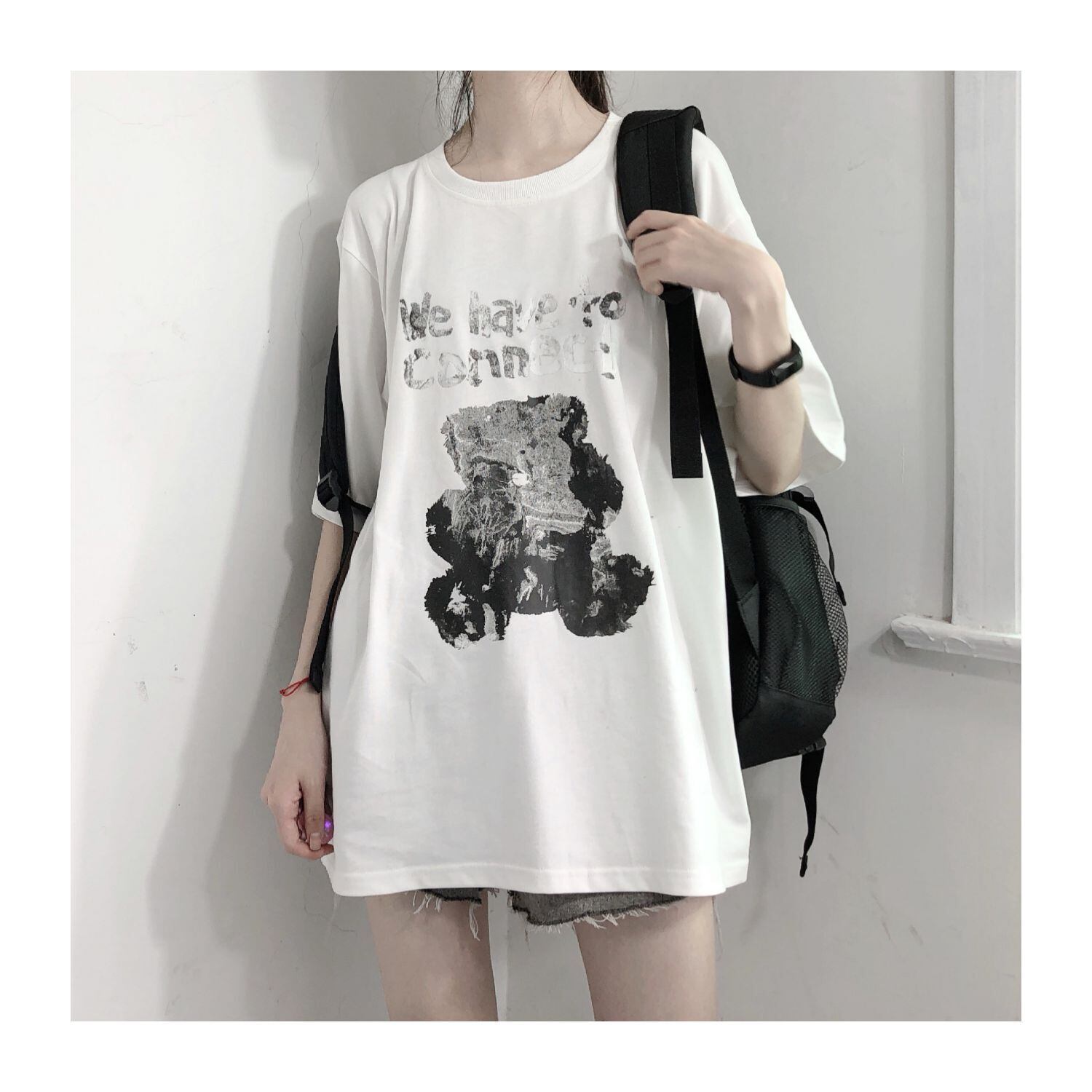 pinksavior隠し黒猫プリントグラフィティインクデザインイラスト白純綿半袖Tシャツ女性ルーズ ホワイト ブラック コットン ピュア PSTB82871738708