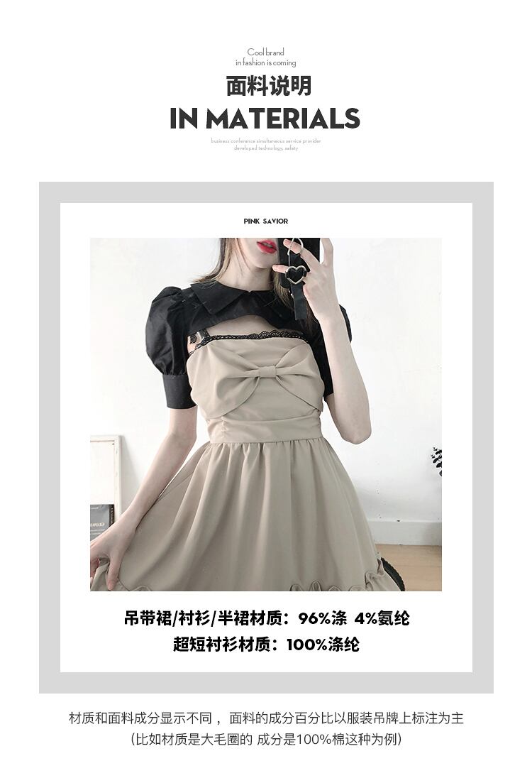 色:ブラウントップ,スカート,スーパーショートシャツ,ブラウンサスペンダースカート,ブラックサスペンダースカート