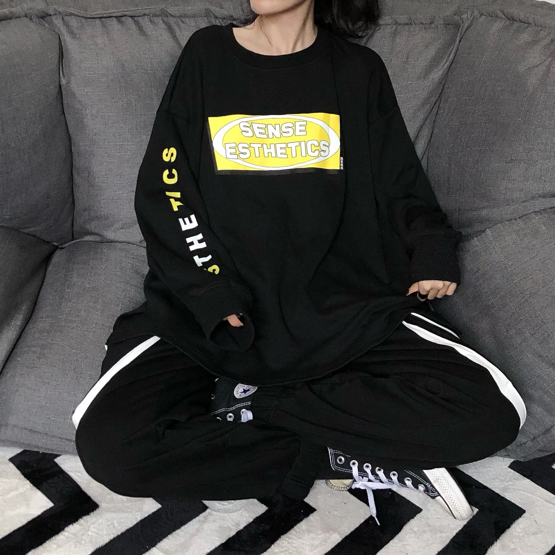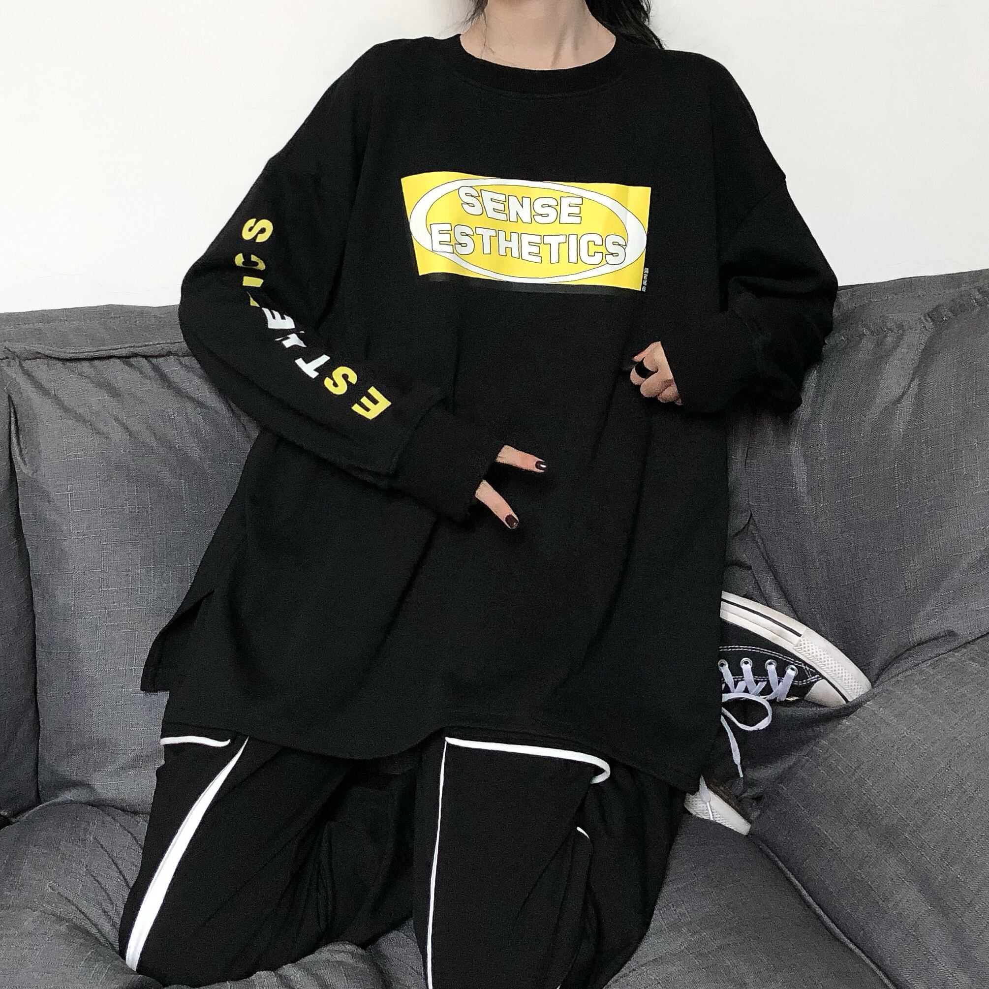 【送料無料】 pinksaviorBLACK AND WHITEの2色の文字印刷長袖セーター女性のタートルネックラウンドネックテクスチャルーズセーター春と秋 ロング ホワイト ブラック スプリング 春物 オータム 秋物 Oネック PSTB19383374514