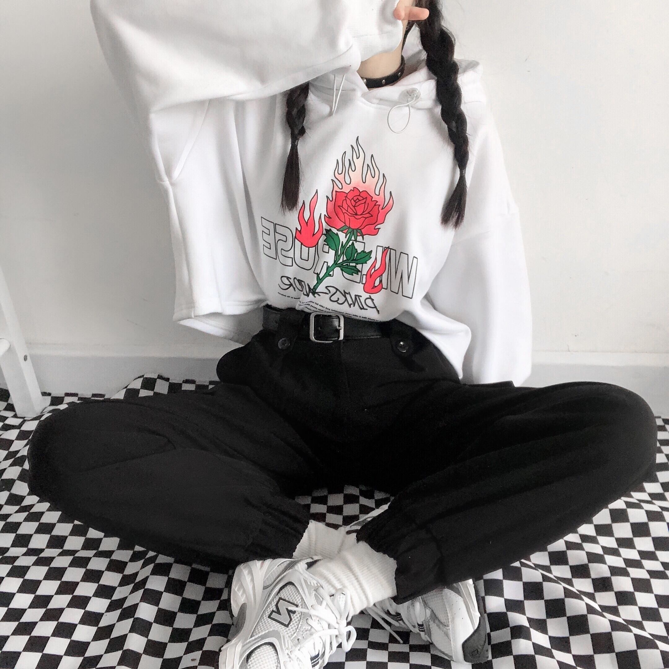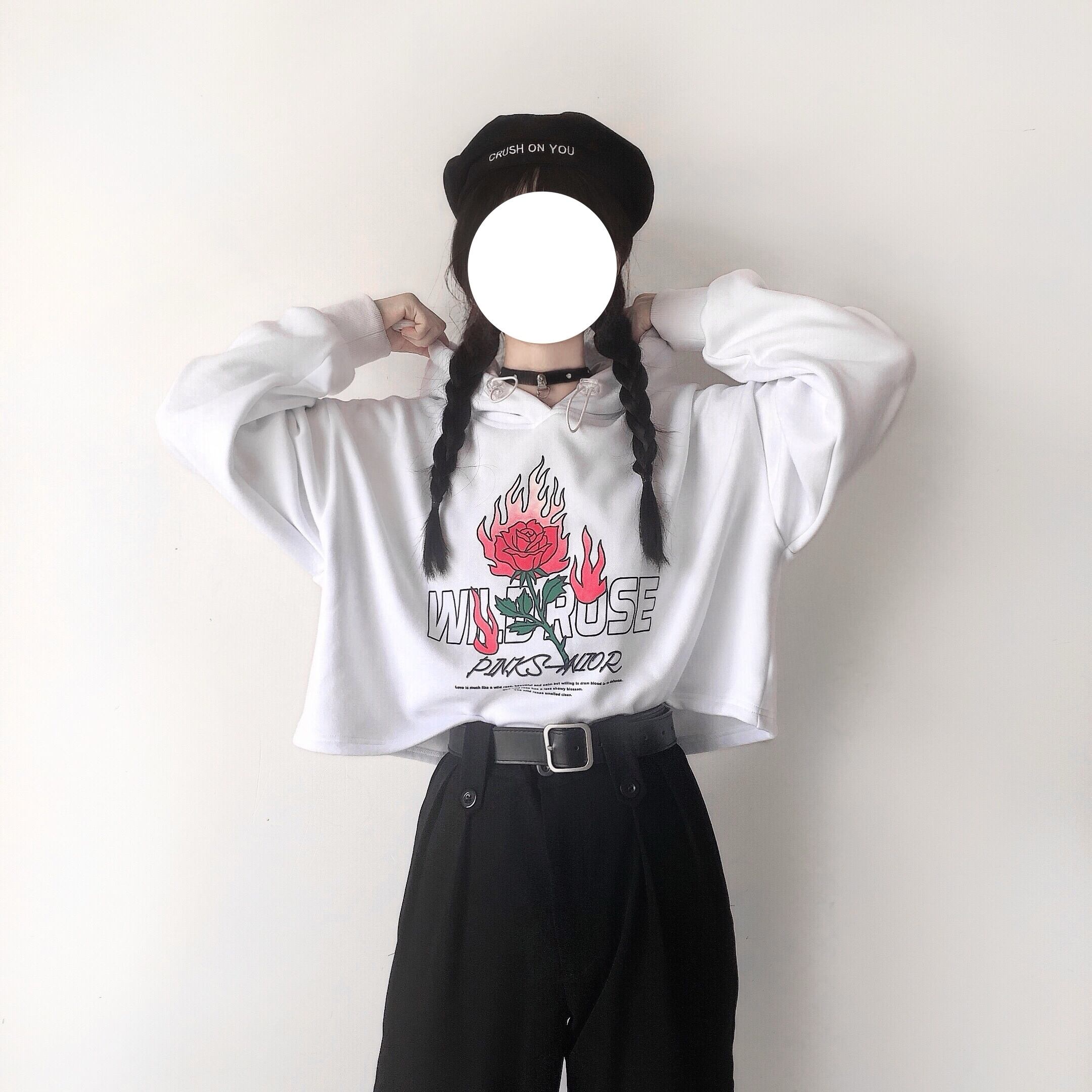 【送料無料】 pinksaviorBLACK AND WHITEの短い巾着帽子ロープルーズフード付きワイルドローズセーター ショート ホワイト ブラック PSTB47157119584