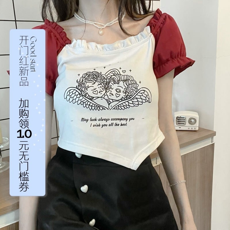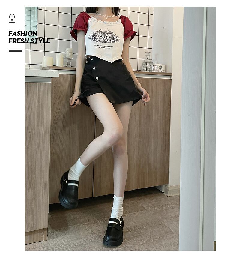 【送料無料】 pinksavior ラブエンジェル 赤と白 シークレットヘム 不規則なベベル サマーエラスティック スリム 半袖 ショート ホワイト レッド ハーフスリーブ 伸縮 夏物 PSTB45636566695