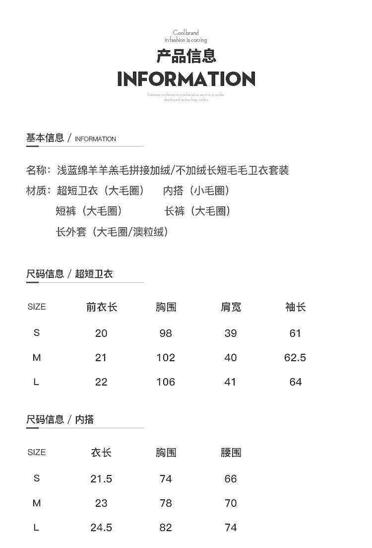 色:青と白(プラスベルベット)のロングコート在庫あり,青と白(ベルベットなし)のロングコート在庫あり,ブルーの超短セーター(在庫なし)在庫あり,黒のショートパンツスポット,黒いズボンのスポット