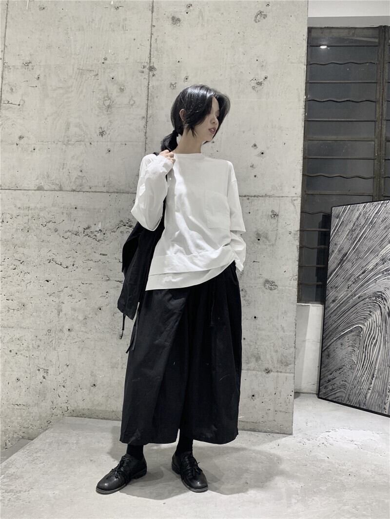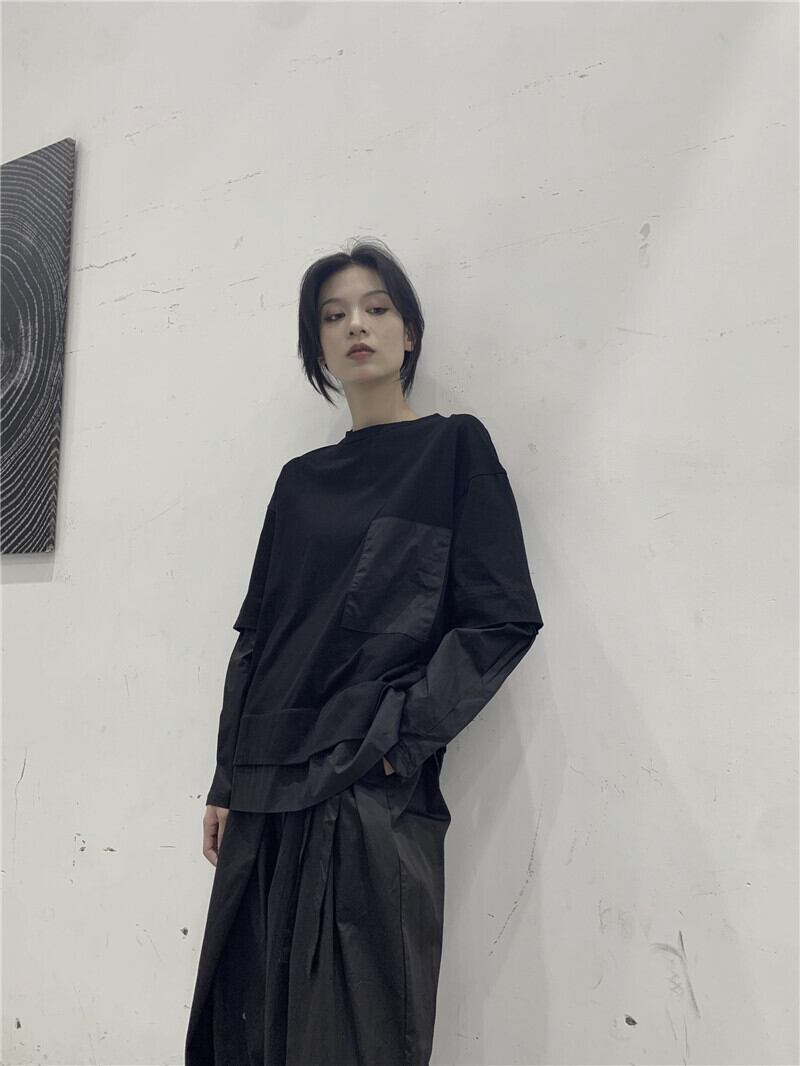BLACK ANDWHITEダークフェイクツーピースTシャツルーズイーズワイルドメンズ&ウィメンズカップル無地秋 ホワイト ブラック オータム 秋物 ソリッドカラー BWTB13737915100