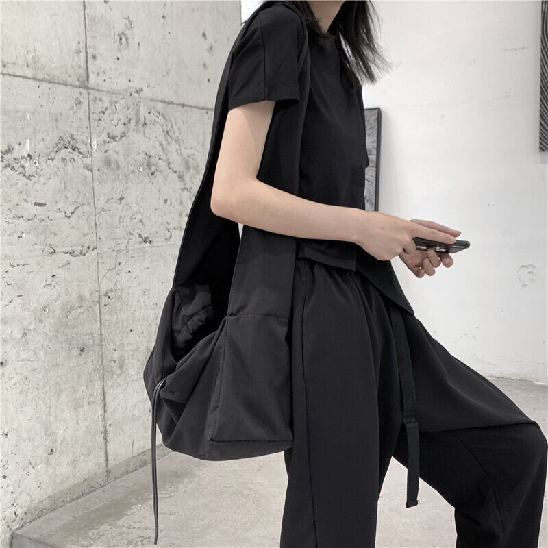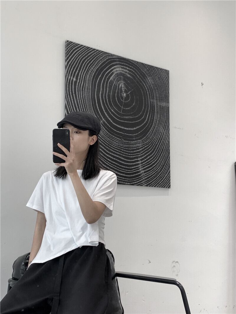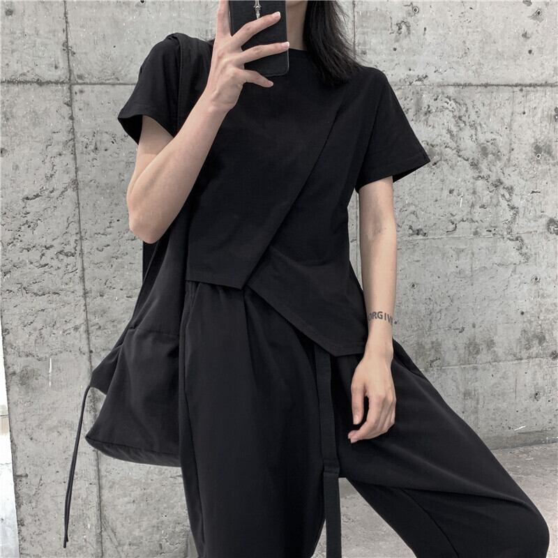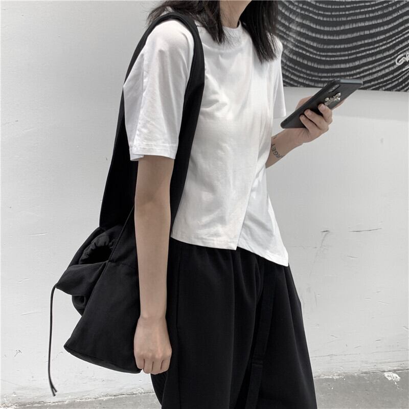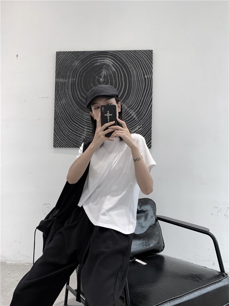 BLACK ANDWHITEオリジナルeseイレギュラー半袖アシンメトリーTシャツ女性ルーズワイルドラウンドネック ホワイト ブラック Oネック BWTB7405655496