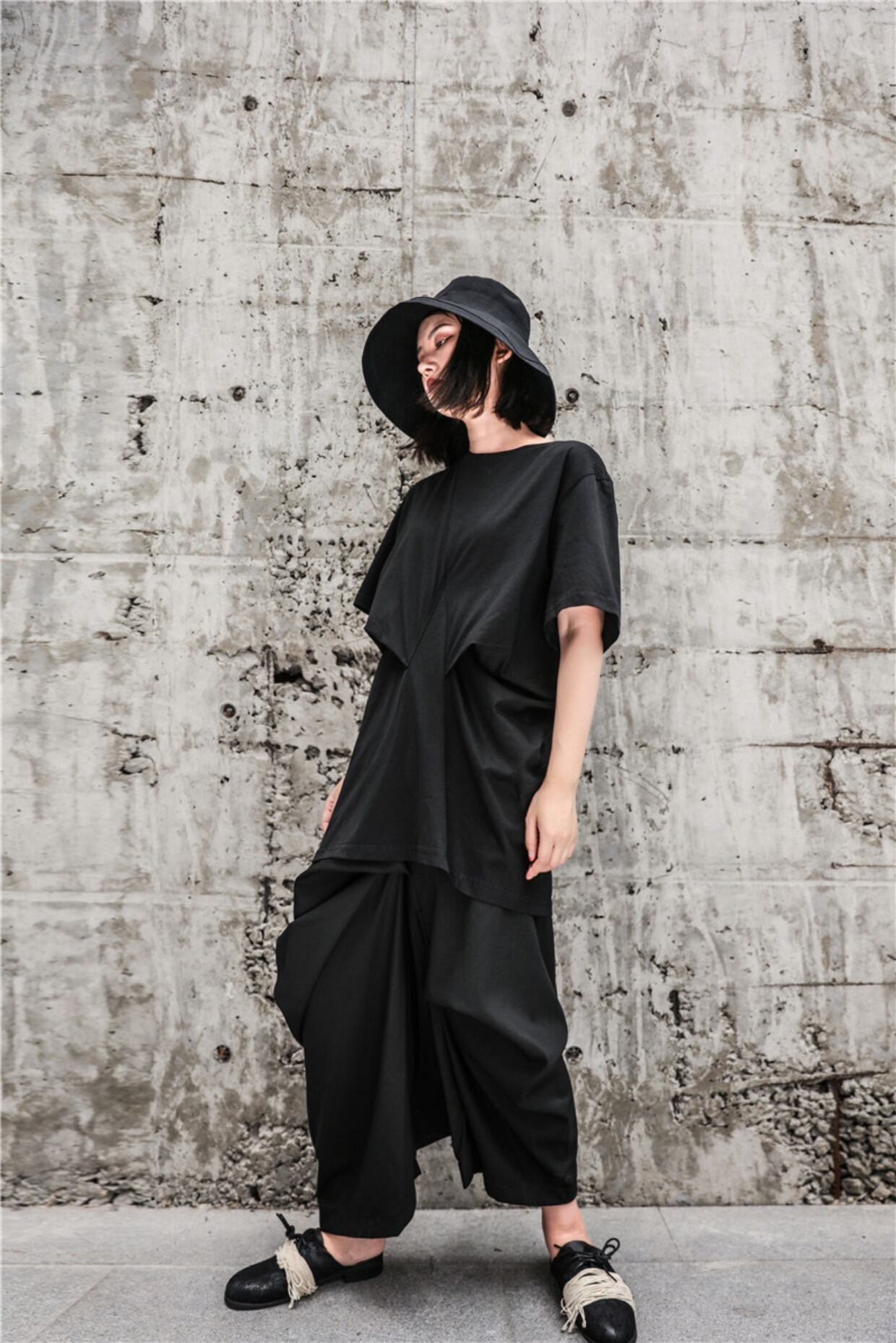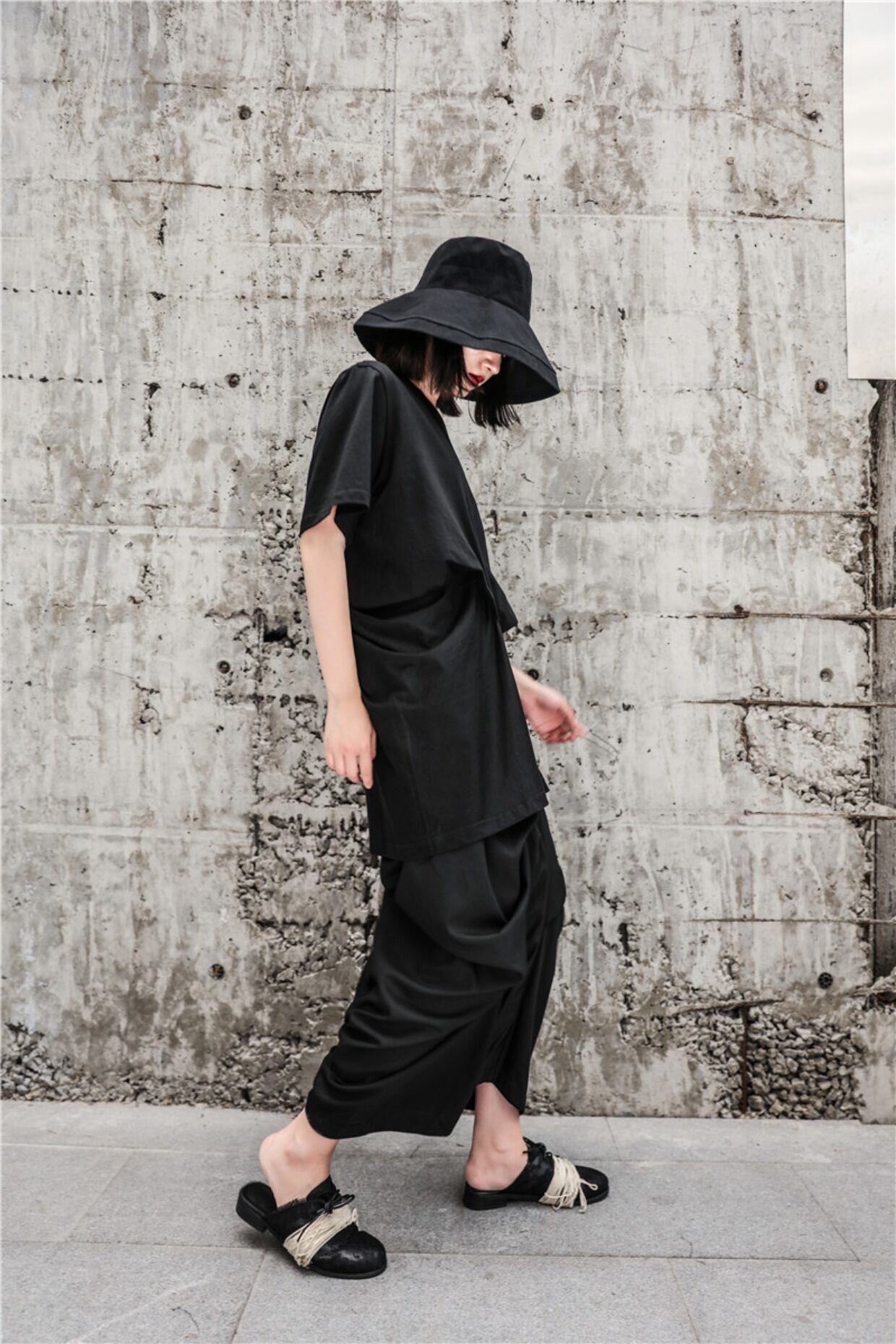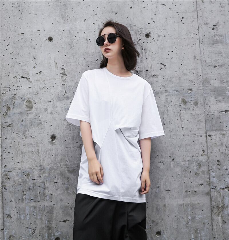 BLACK ANDWHITE香港スタイルの女性用イレギュラーTシャツ女性用ルーズミドル丈シワデザイン純綿半袖 ショート ホワイト ブラック コットン ハーフスリーブ ピュア BWTB92194201846