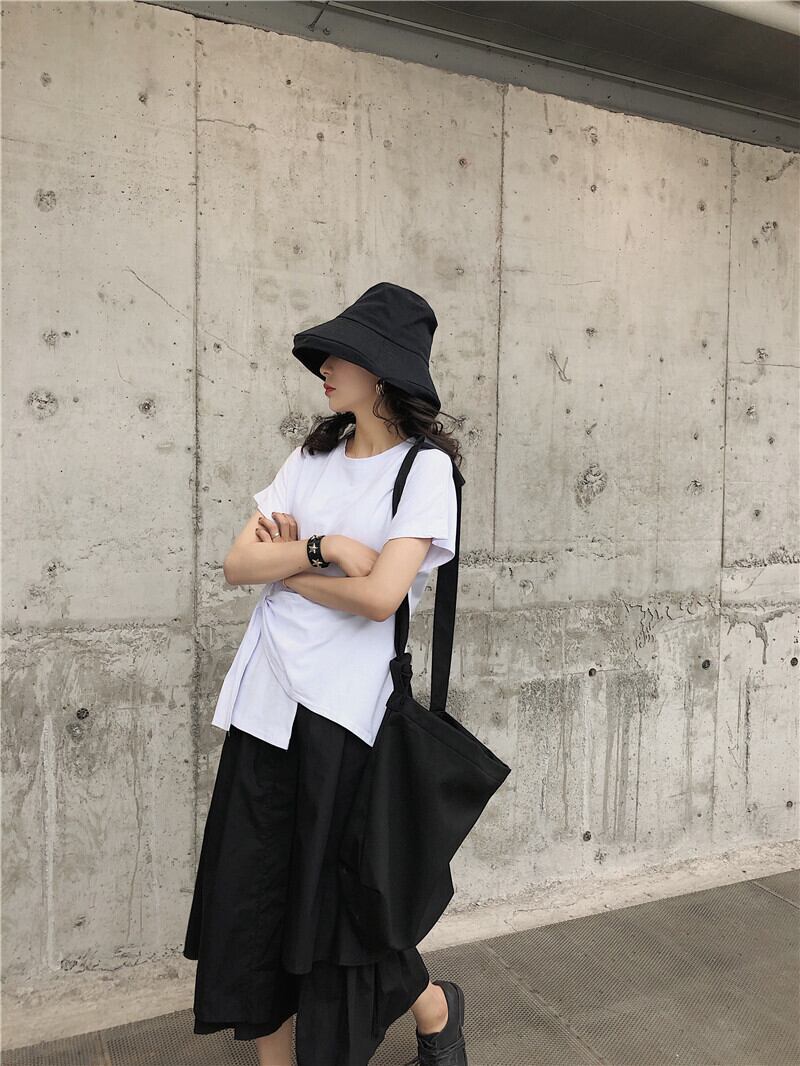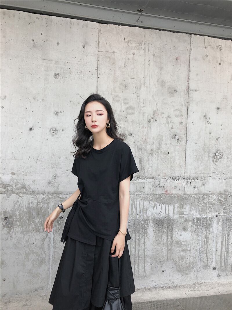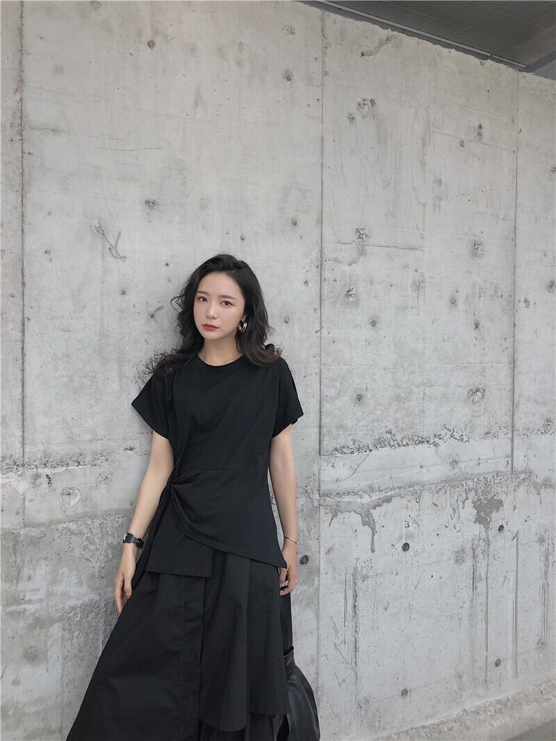 BLACK ANDWHITEダーク香港スタイル半袖レディースイレギュラーTシャツスリムウエストサマーオールマッチトップス ホワイト ブラック 夏物 BWTB26664853696