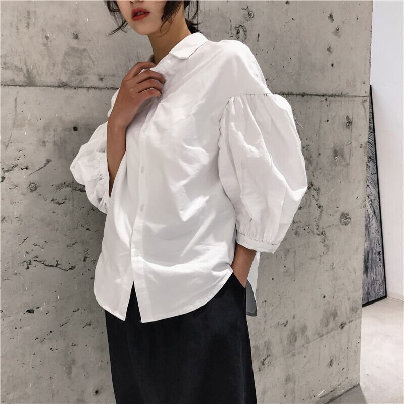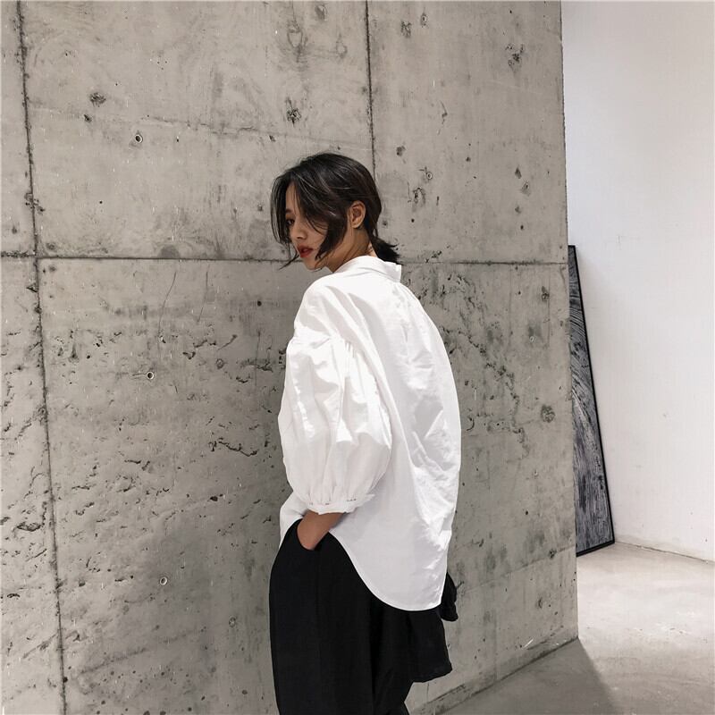 BLACK AND WHITEダークオリジナルシャツ、七分袖、ランタン袖、ルーズイーズカット ホワイト ブラック ランタンスリーブ BWTB51426611641