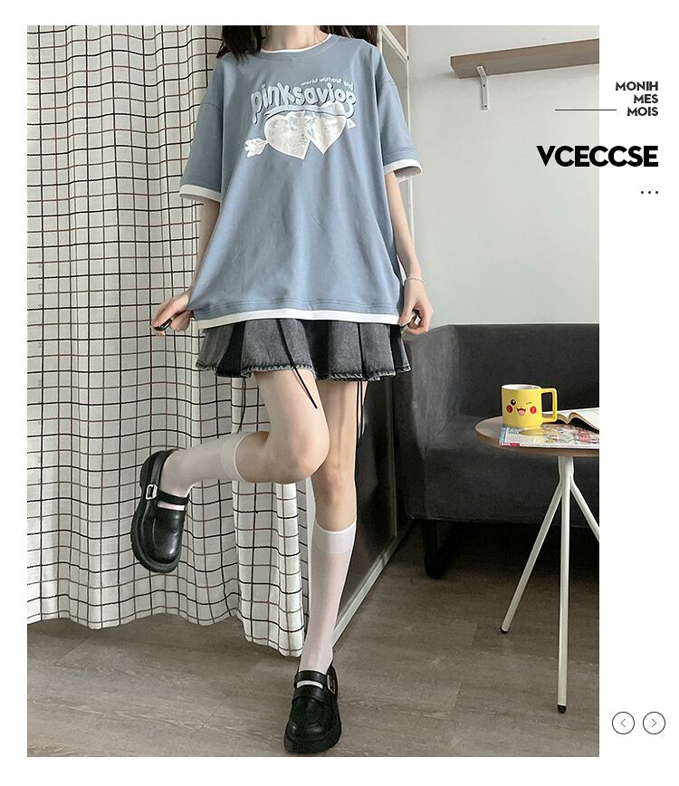 【送料無料】 pinksaviorスリーカラースムースフェイクツーピースサマーニュールーズ&シン半袖シャツデザインセンスプリント 夏物 PSTB7734143573