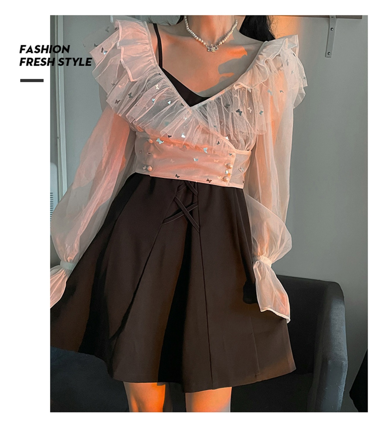 色:黒のスクエアネックドレス,ホワイトスクエアカラードレス,バタフライネットヤーン日焼け止め(白),ストラップブラックドレス,バタフライネットヤーン日焼け止め(黒)