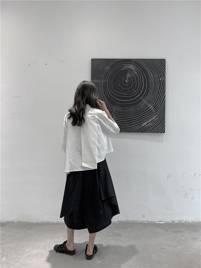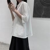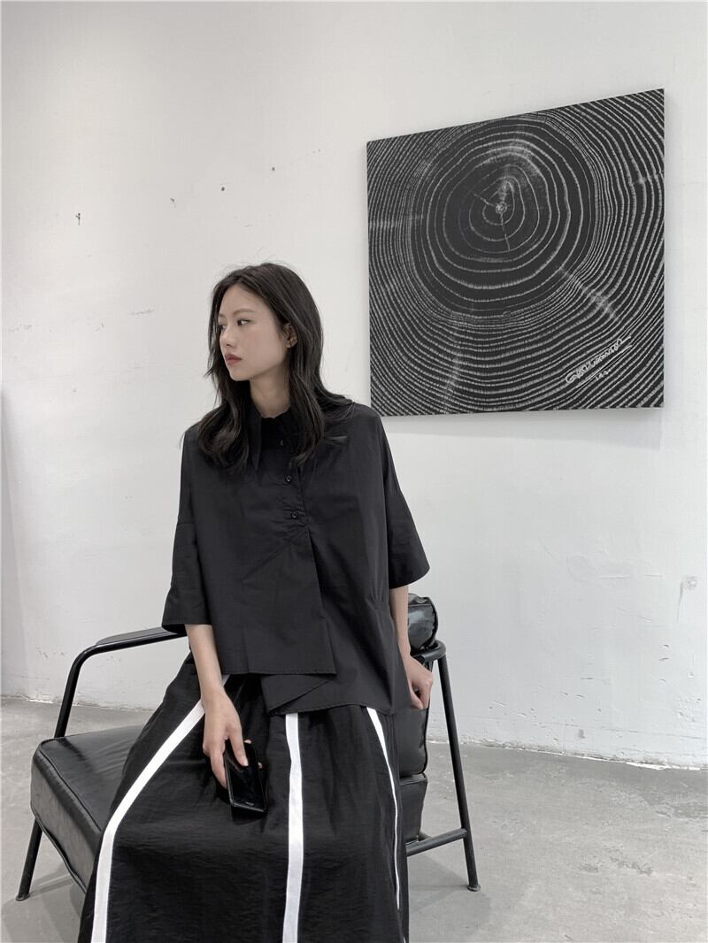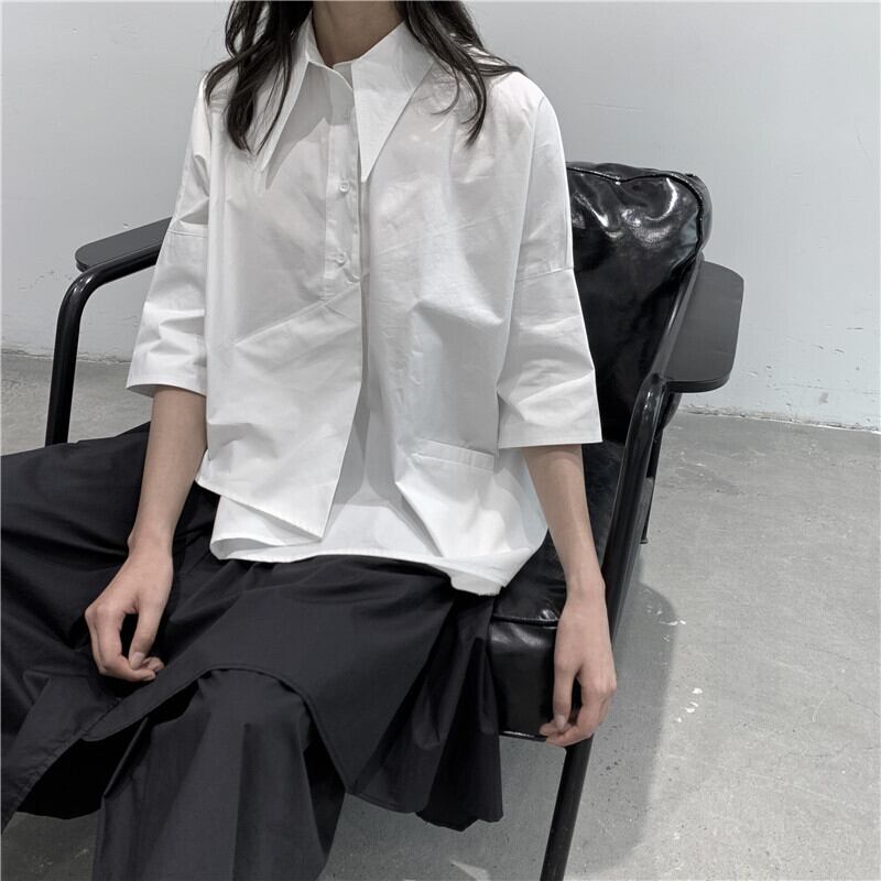 BLACK ANDWHITEダークブラックのポインテッドカラー半袖シャツ女性デザインアシンメトリーニッチコットンルーズ ホワイト BWTB19192359595