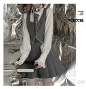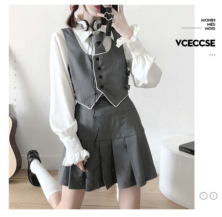 色:スーツベスト,ネクタイ付き長袖シャツ,プリーツスカート,斜めのネックラインのスウェットシャツ,黒いズボン,黒のエッジとネクタイとユニセックスの白いシャツ