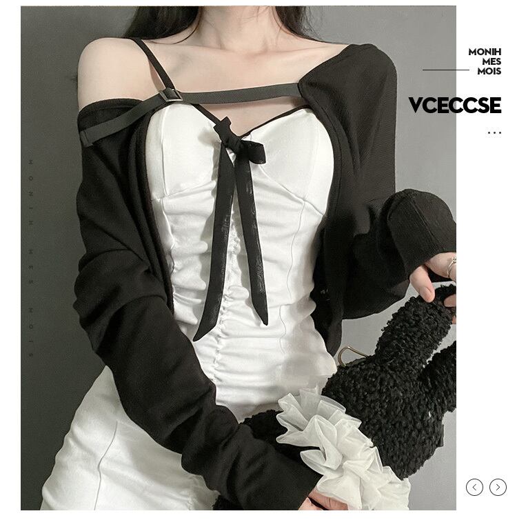 色:ブラックサスペンダースカート,白いドレス,黒の小さなショールトップ