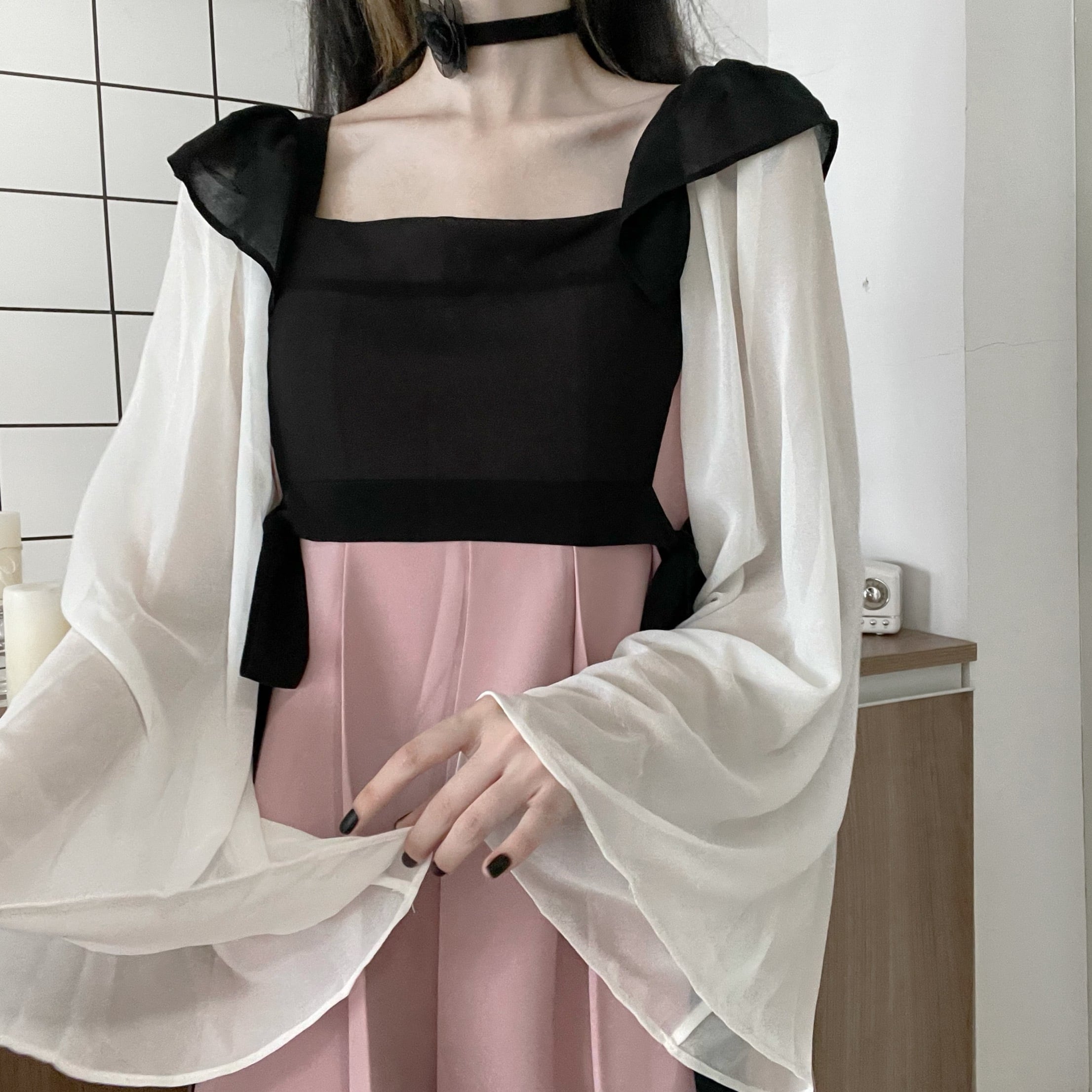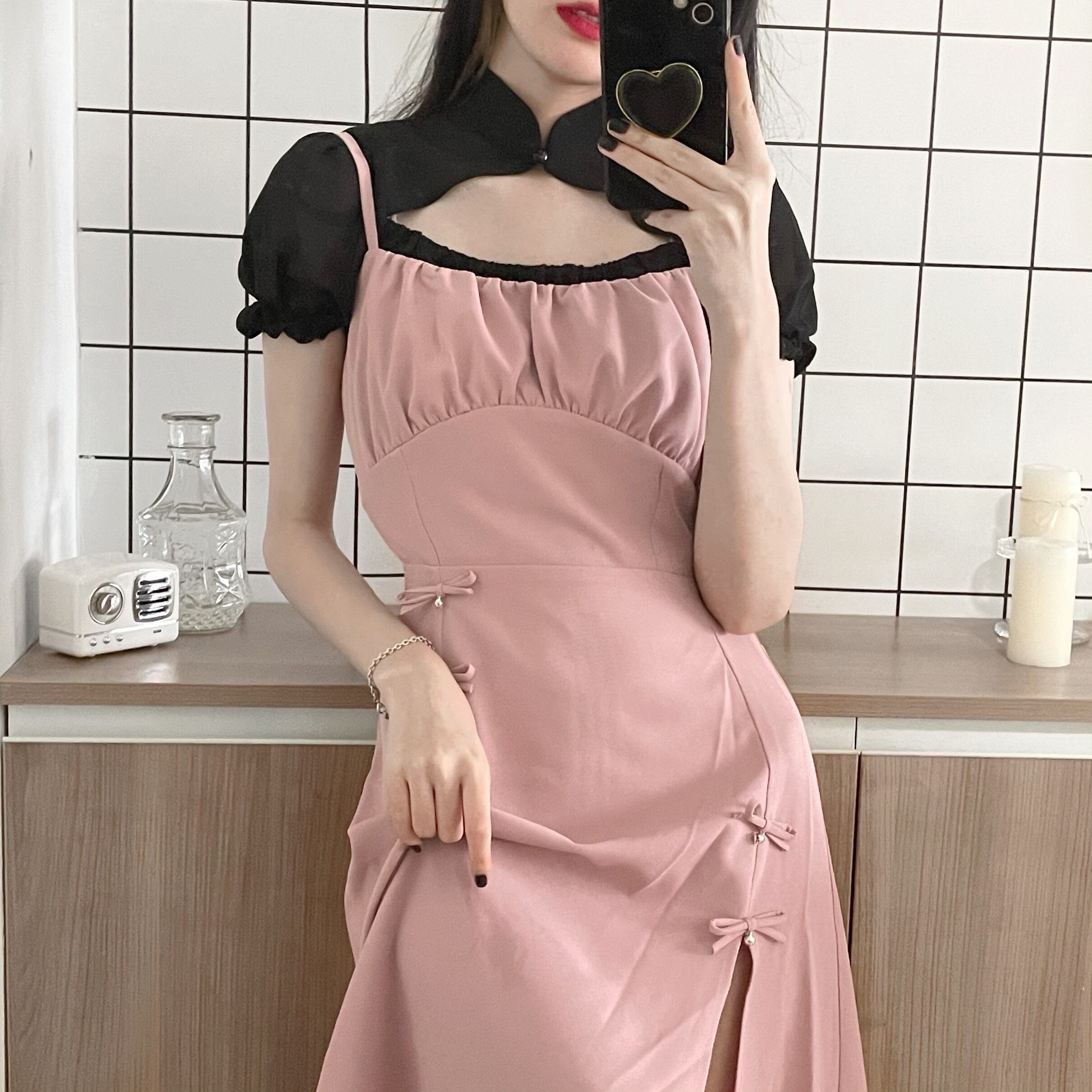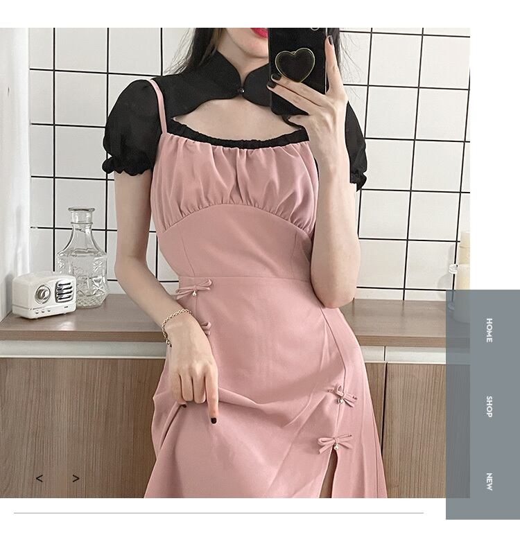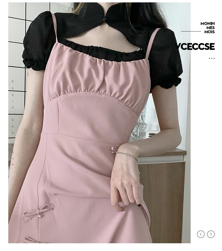色:ピンクの黒と白のドレス,スリングベルミニスカート,ブラックシフォンプライマー