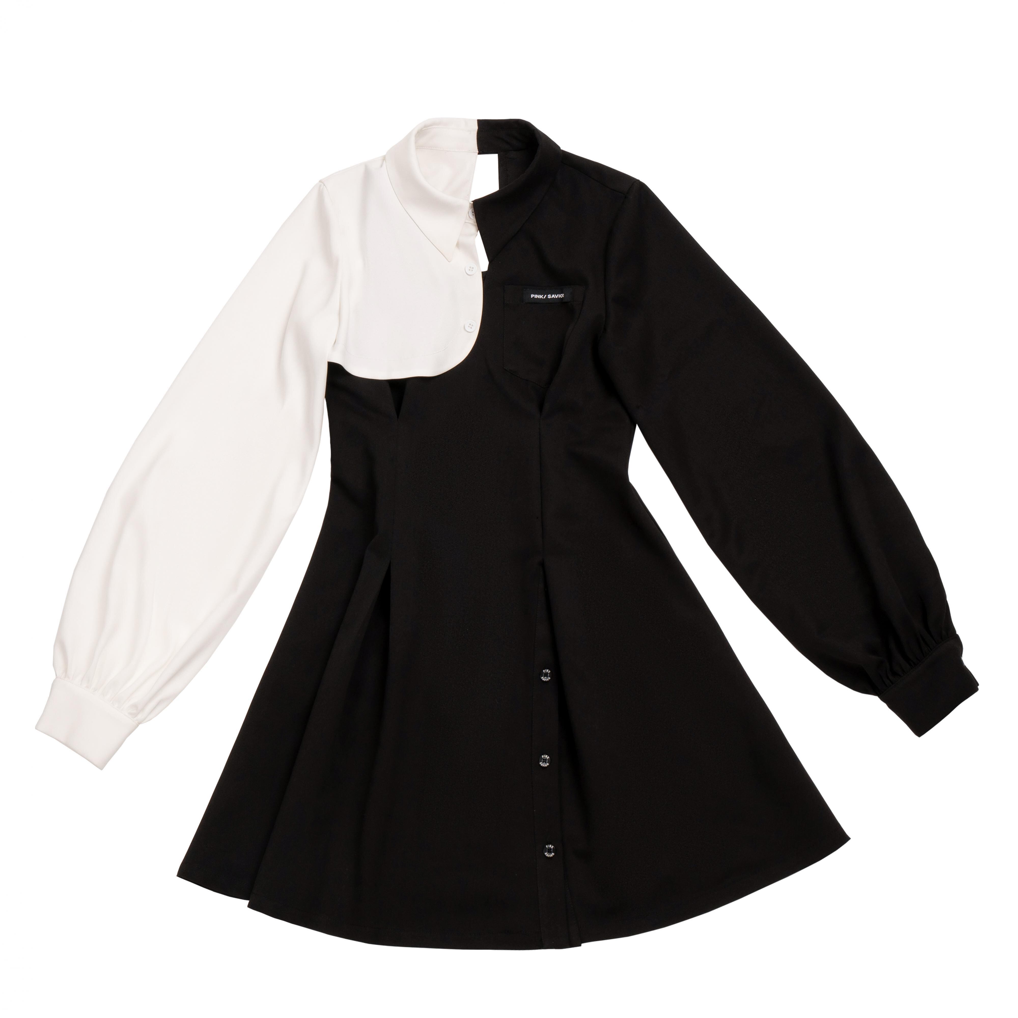 色:絞り染めブルーのフェイクツーピースドレス,絞り染めの黒とグレーのフェイクツーピースドレス,黒とグレーのシャツドレス,白と黒のシャツドレス