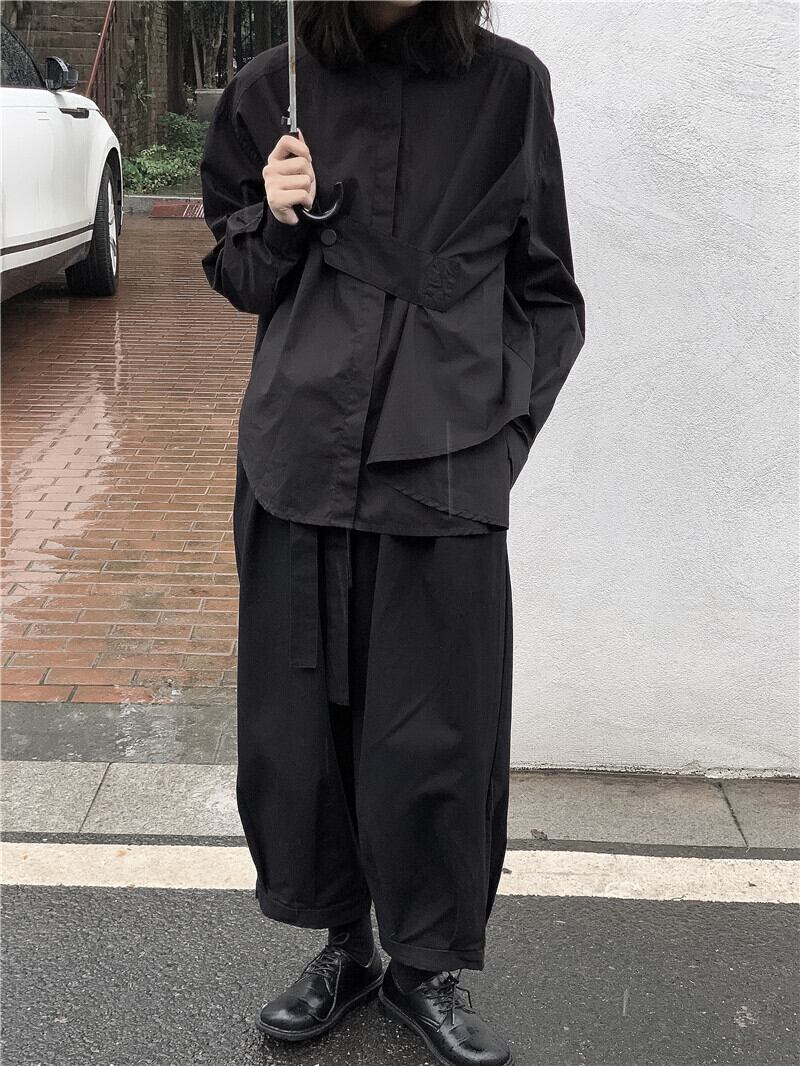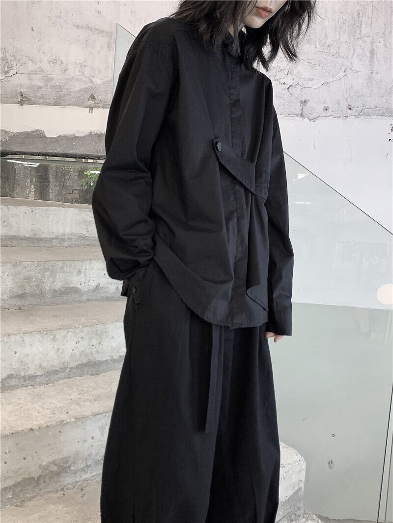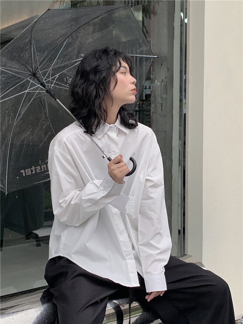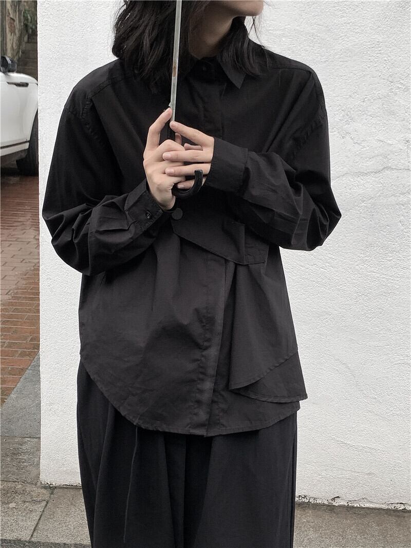 BLACK AND WHITEダークブラック半袖シャツ、コットンネックラインプリーツデザイン、ワイルドルーズオリジナルデザイン ホワイト BWTB70081435737
