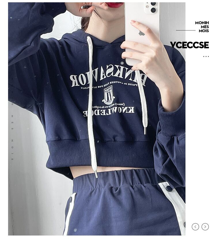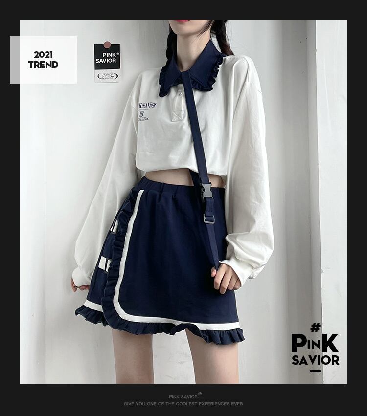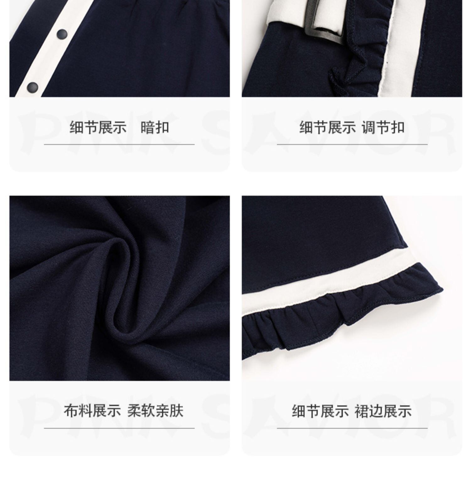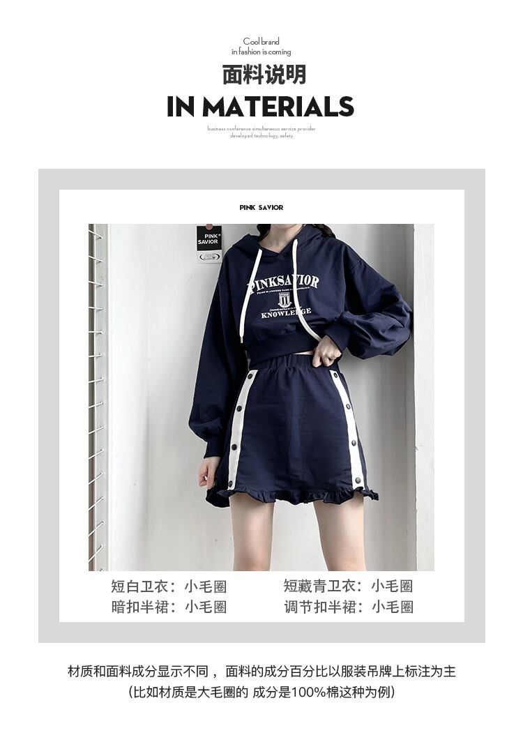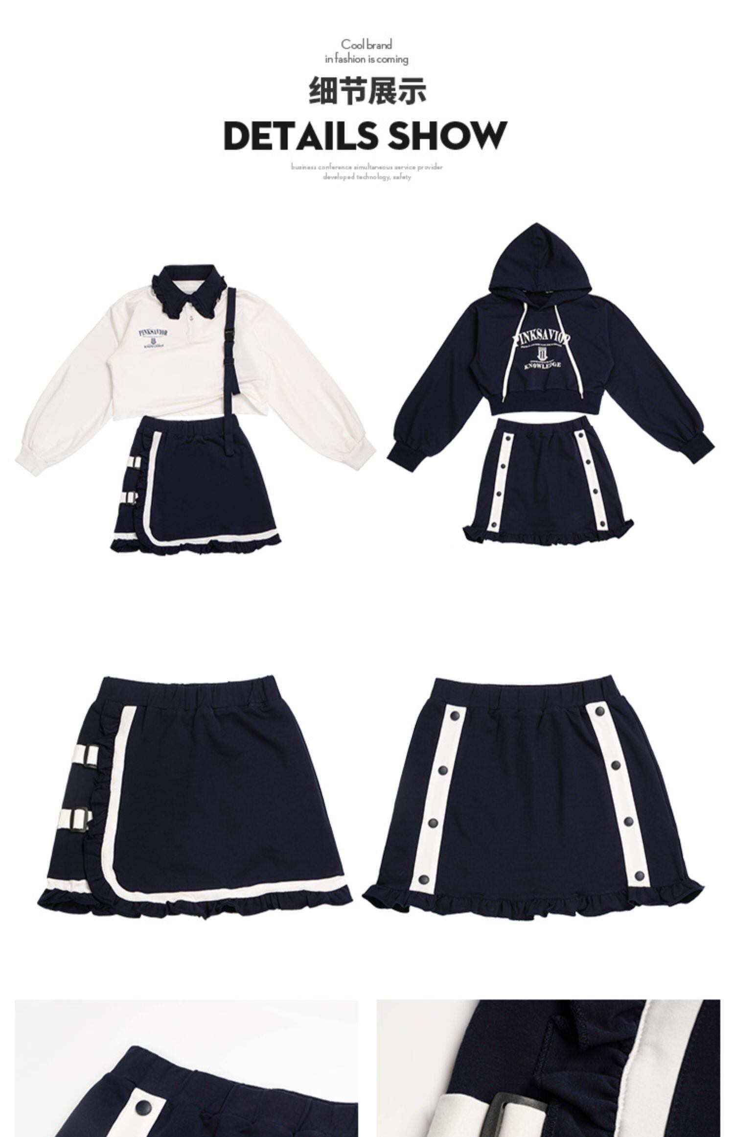 色:ホワイトカレッジトップ,ネイビーブルーのフード付きショートセーター,ネイビーの隠しボタンスカート,ネイビーブルーの調節可能なボタンスカート