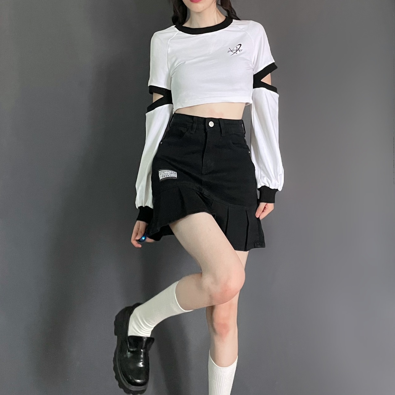 pinksaviorディスコネクトスリーブ秋オールマッチBLACK AND WHITEのコントラストカラーと薄手の長袖Tシャツ(ショートとレギュラー) ロング ホワイト ブラック オータム 秋物 PSTB79077181112
