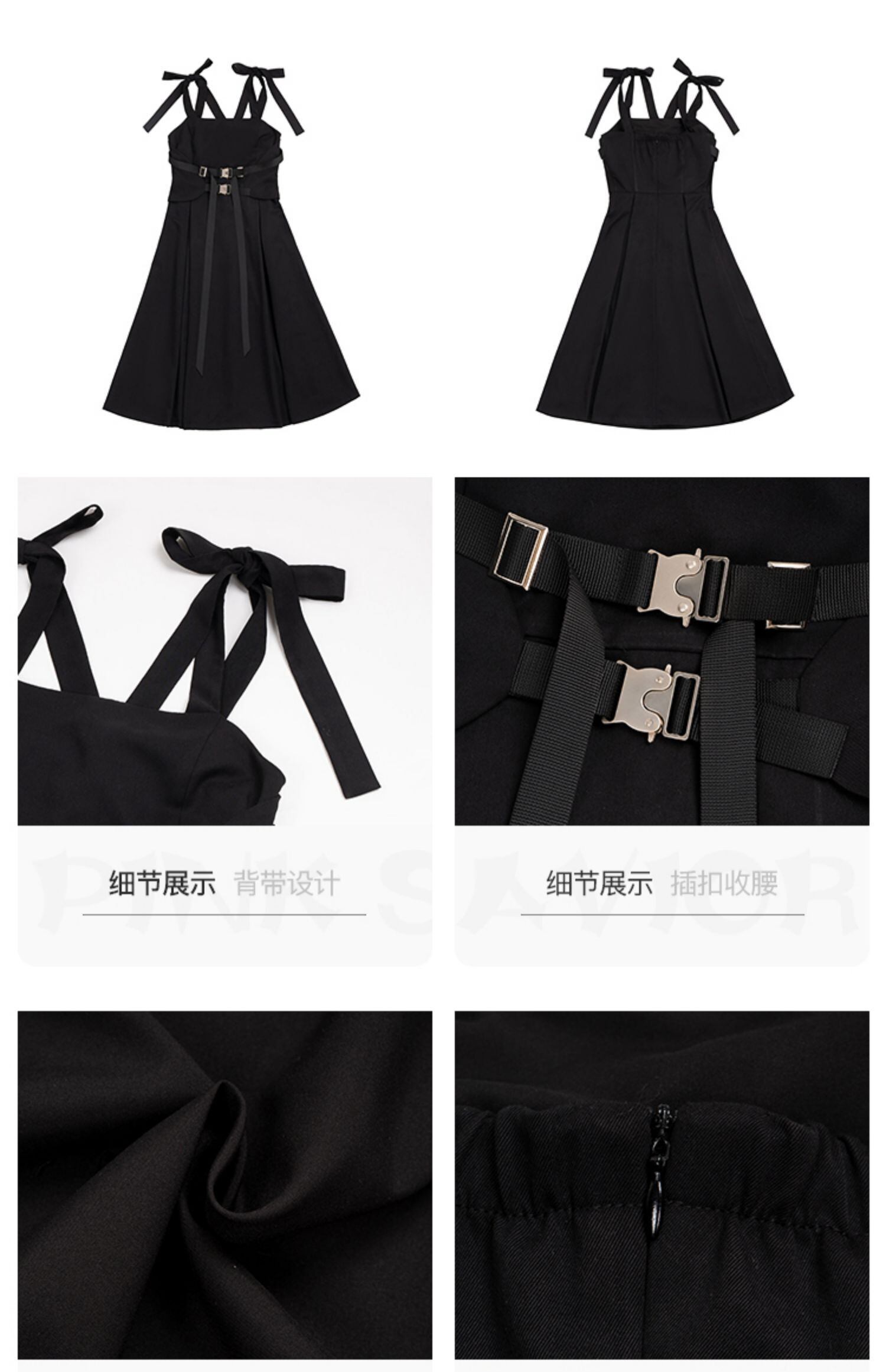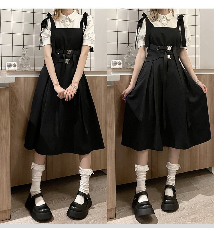 pinksavior大学機能ボタンロングウエストストラップドレス+小さなスクエアカラーショートパフスリーブシャツ夏 サマー 夏物 スクウェア PSTB13605598376