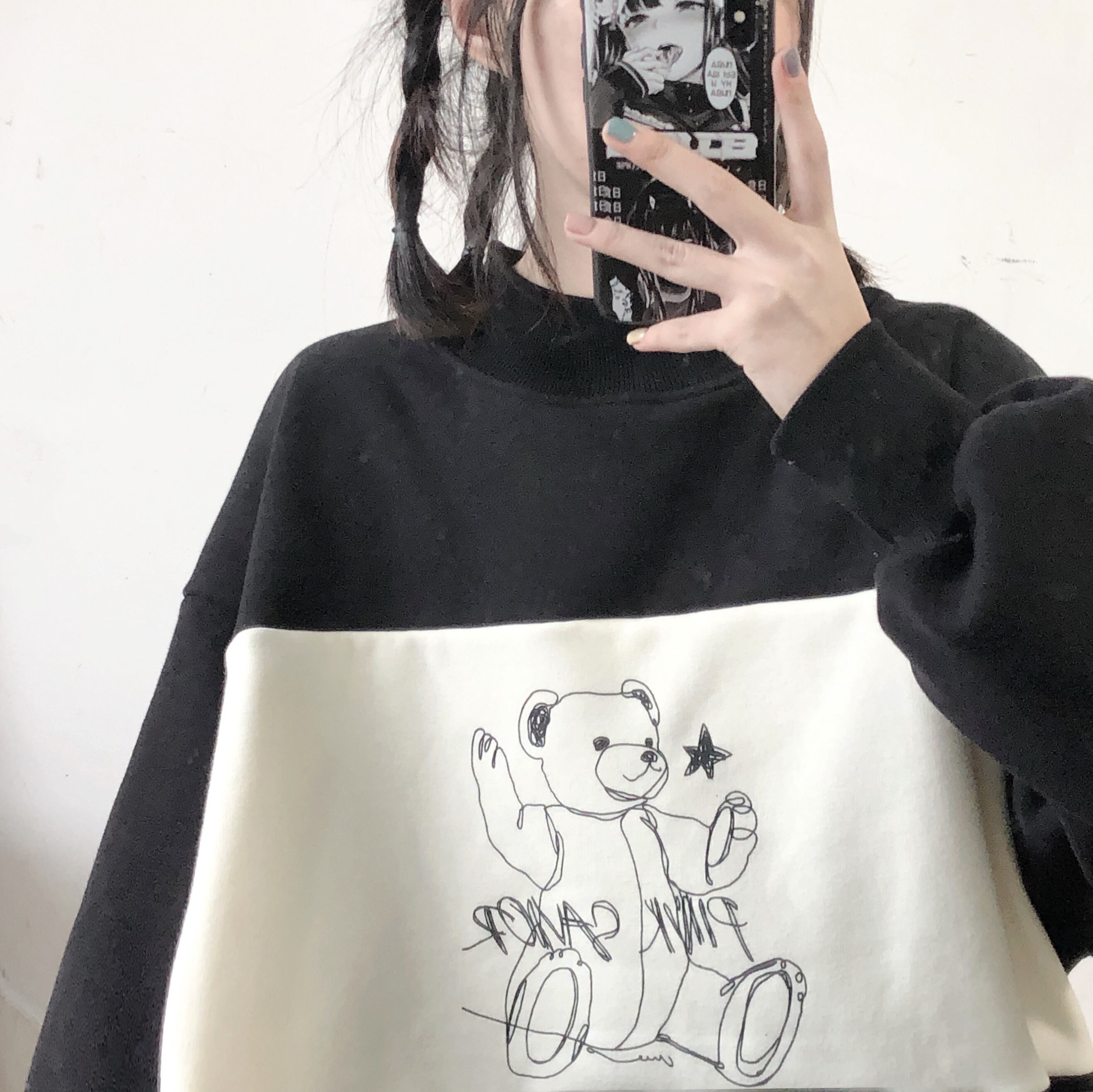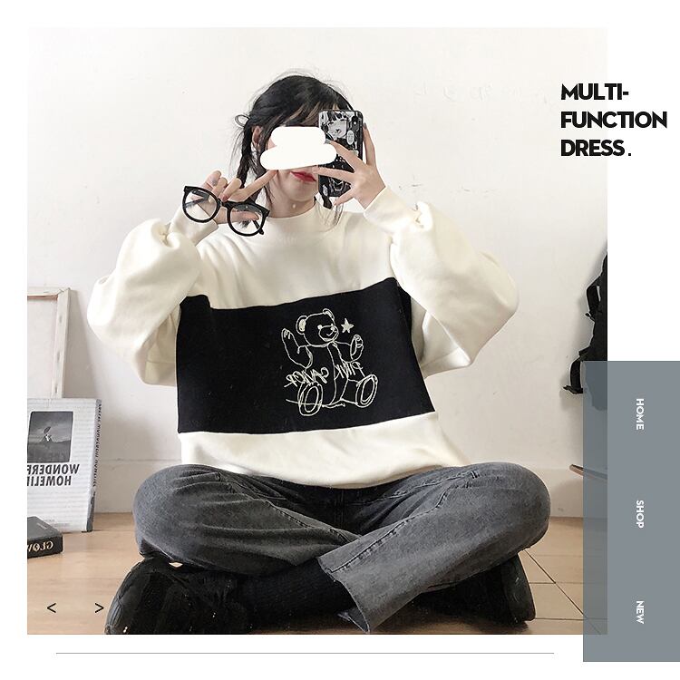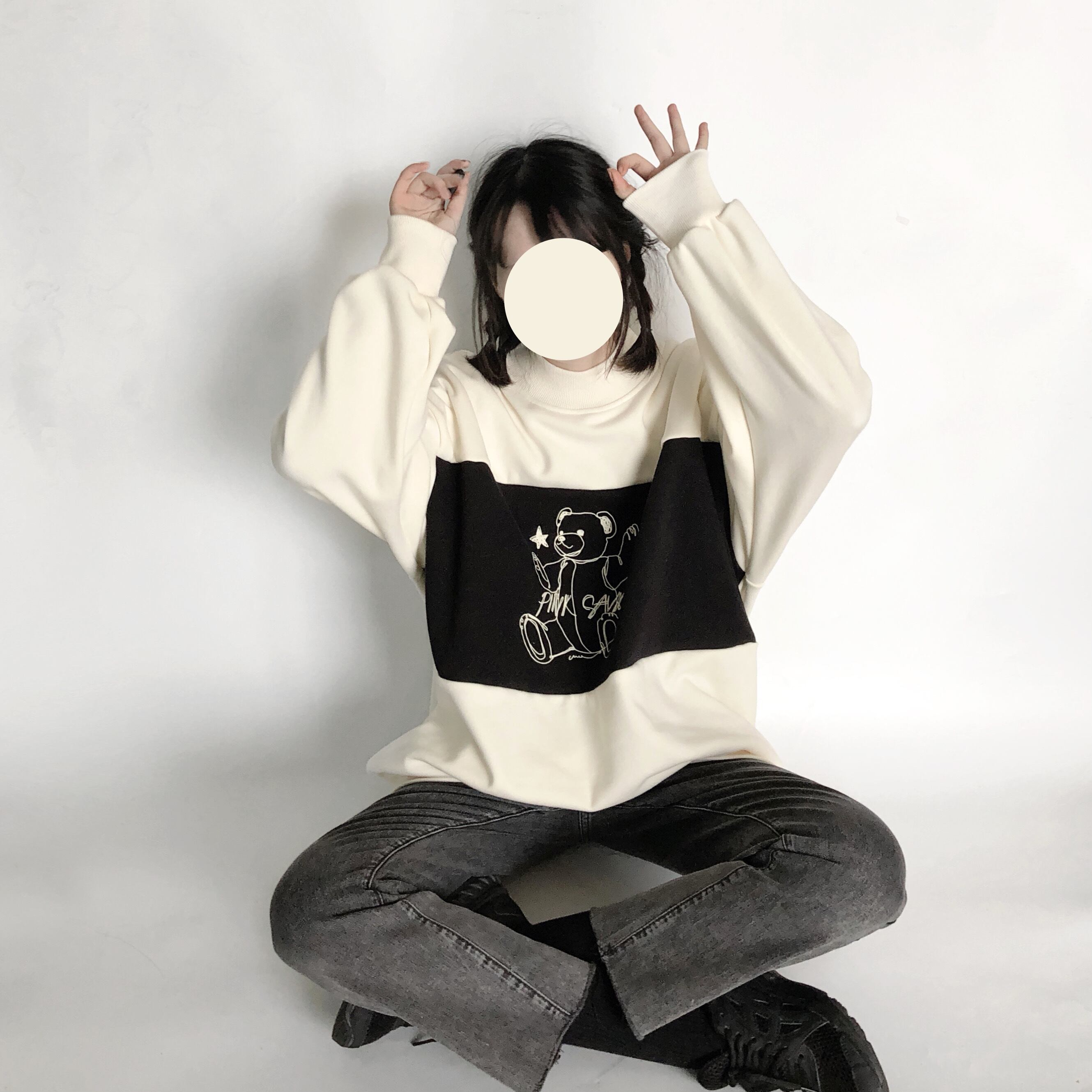 pinksaviorプラスベルベットクリームイエローステッチラインベア秋冬レトロは薄手カジュアルスモールハイカラーセーター オータム 秋物 ウィンター 冬物 PSTB83857127418