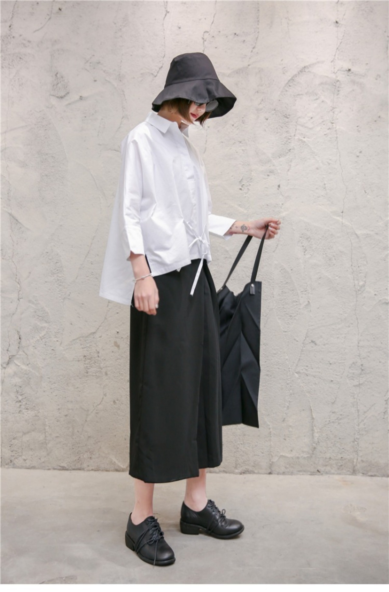 BLACK ANDWHITE香港スタイルのレースアップハーフレングス袴女性ドレープクールワイドレッグパンツナインポイントパンツサマーニュースタイル ホワイト ブラック 夏物 BWTB4342417631