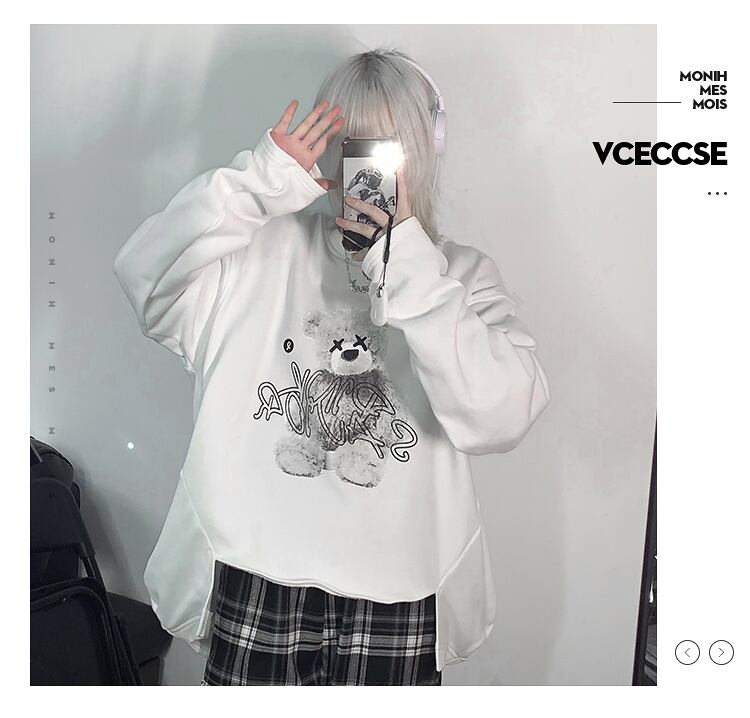 pinksaviorの特別なデザインの黒と白のクマのプリントの不規則な裾のテリーセーター怠惰な ホワイト ブラック PSTB92244889198