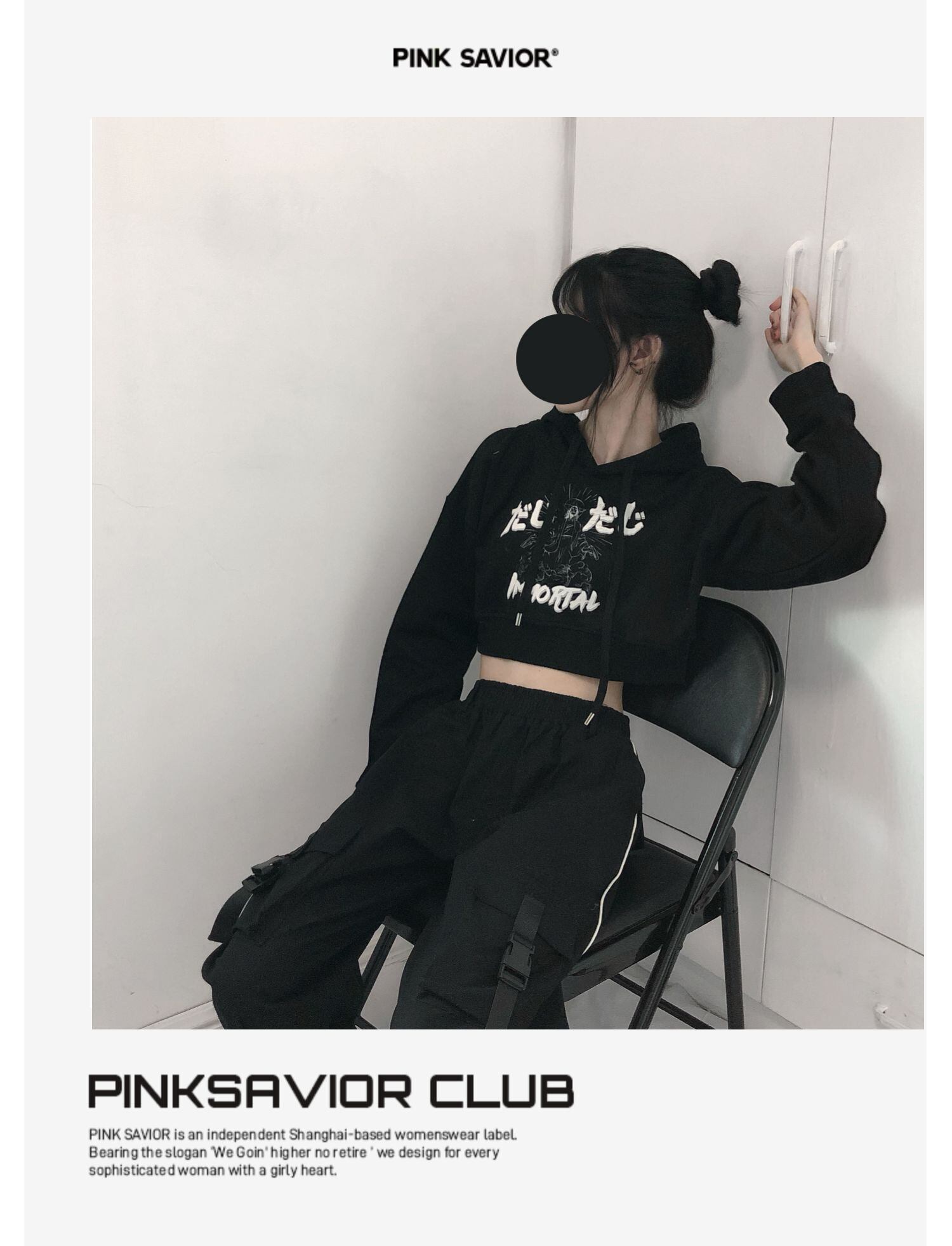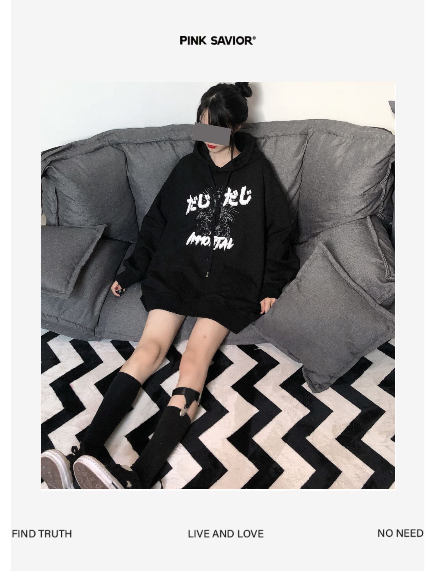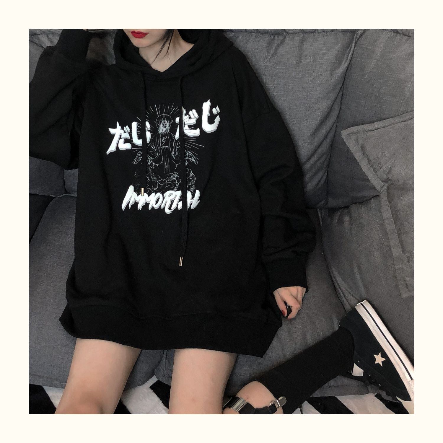 pinksavior落書き原稿印刷カップルは黒の長い/短いフード付きセーターの女性のゆるい春を着ます ショート ロング ブラック スプリング 春物 PSTB40460414765