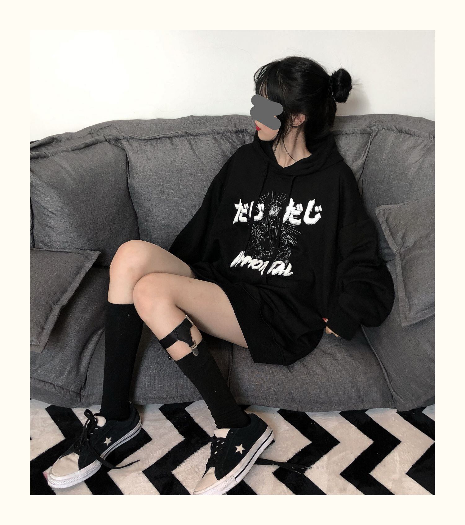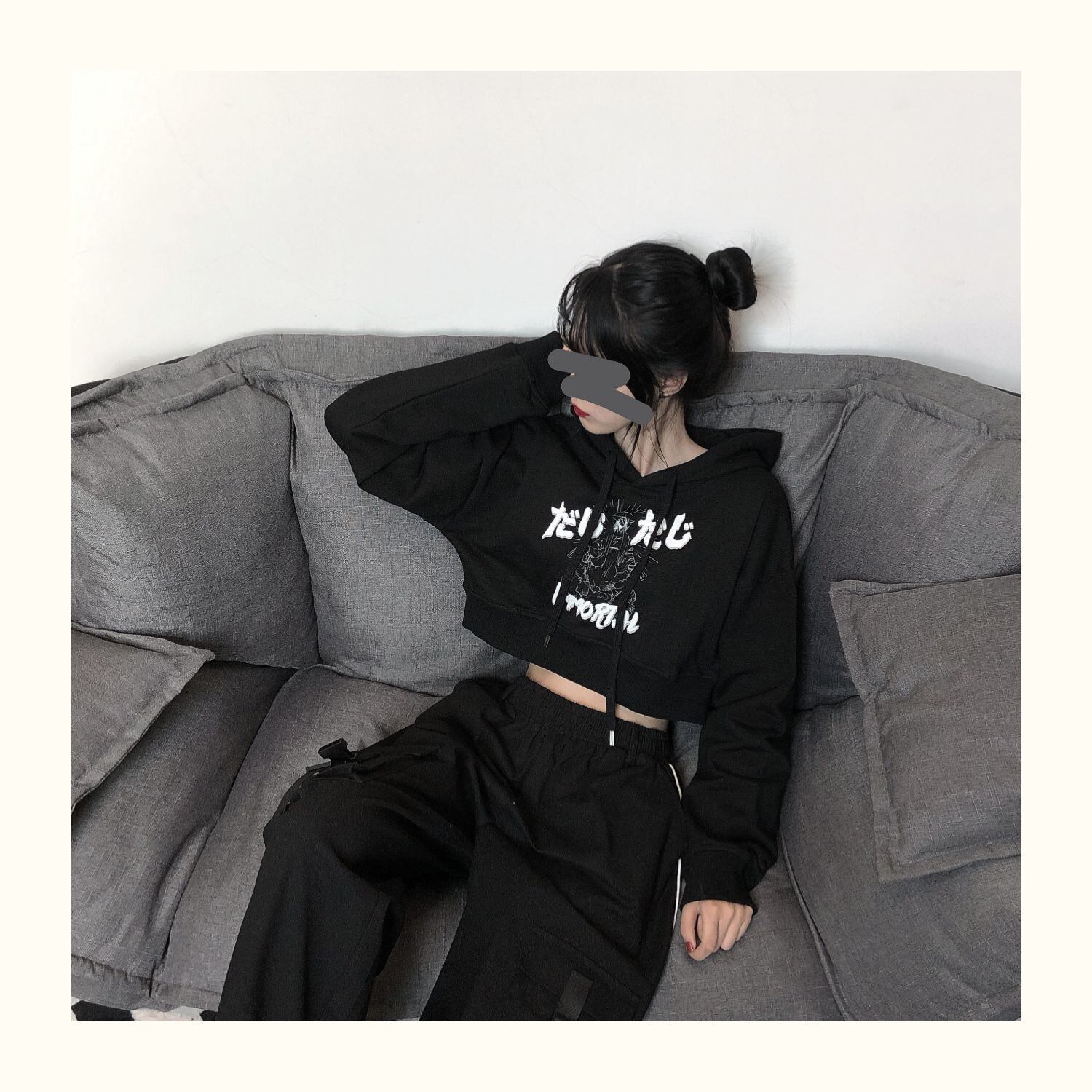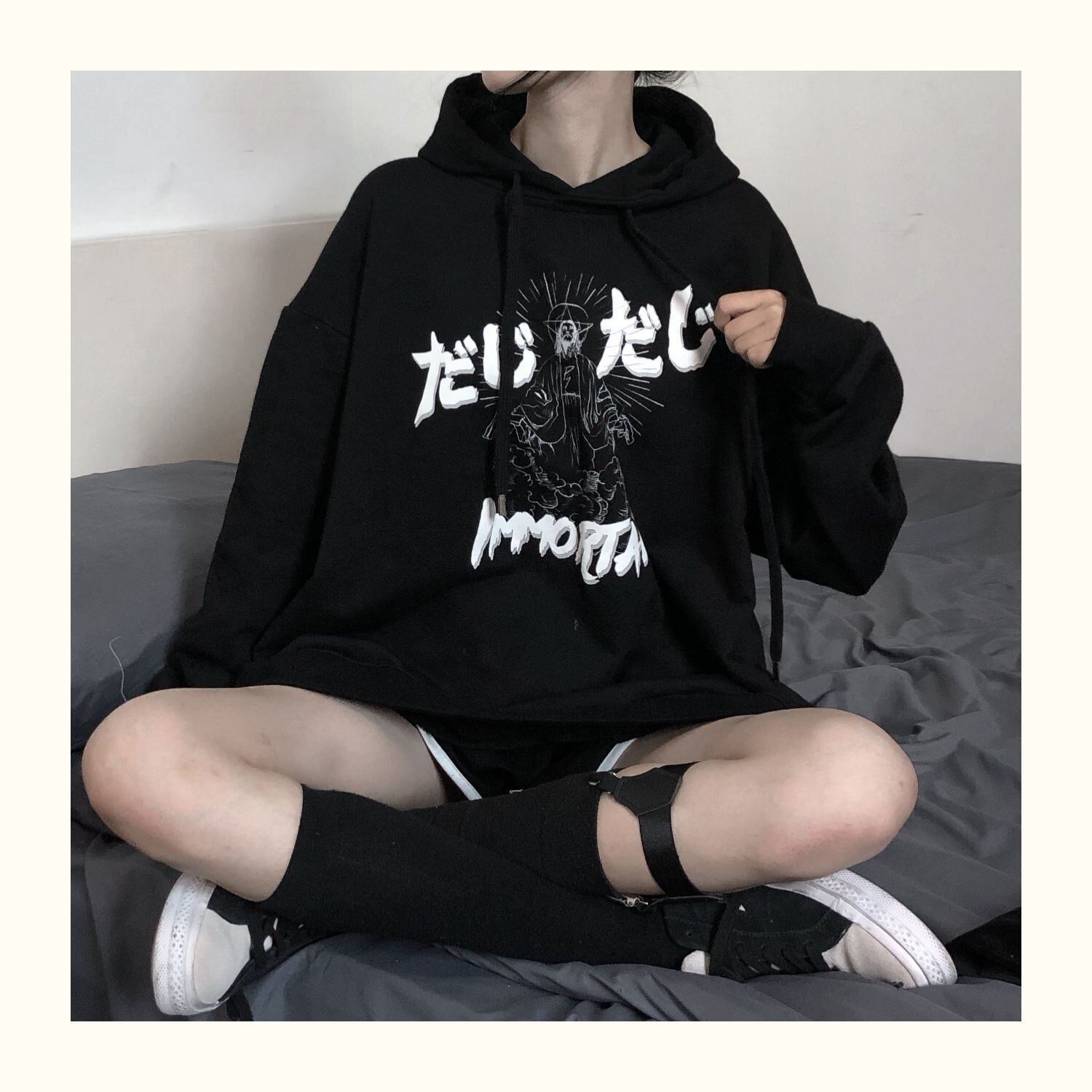 pinksavior落書き原稿印刷カップルは黒の長い/短いフード付きセーターの女性のゆるい春を着ます ショート ロング ブラック スプリング 春物 PSTB40460414765