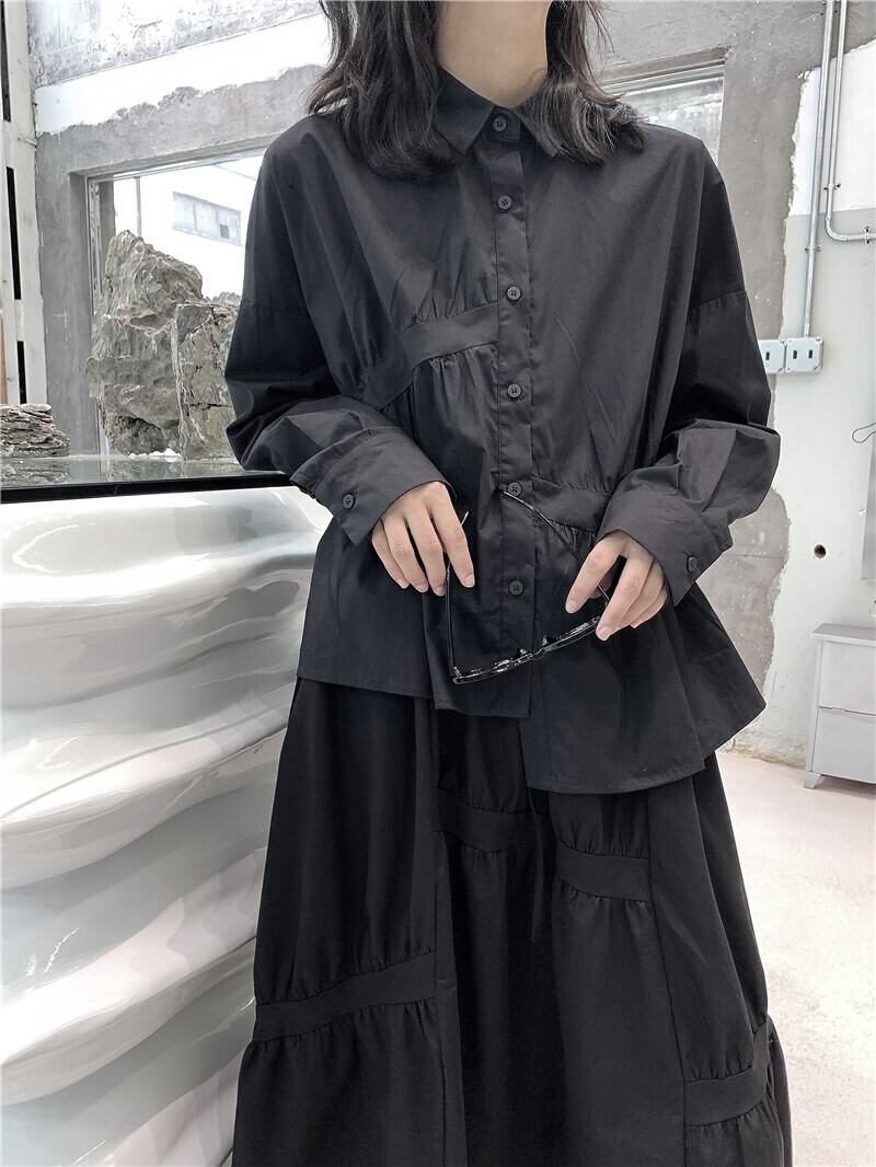BLACK ANDWHITEダークアシンメトリーデザインシャツ長袖秋ニュースタイルニッチシャツ ロング ホワイト ブラック オータム 秋物 BWTB80572719806