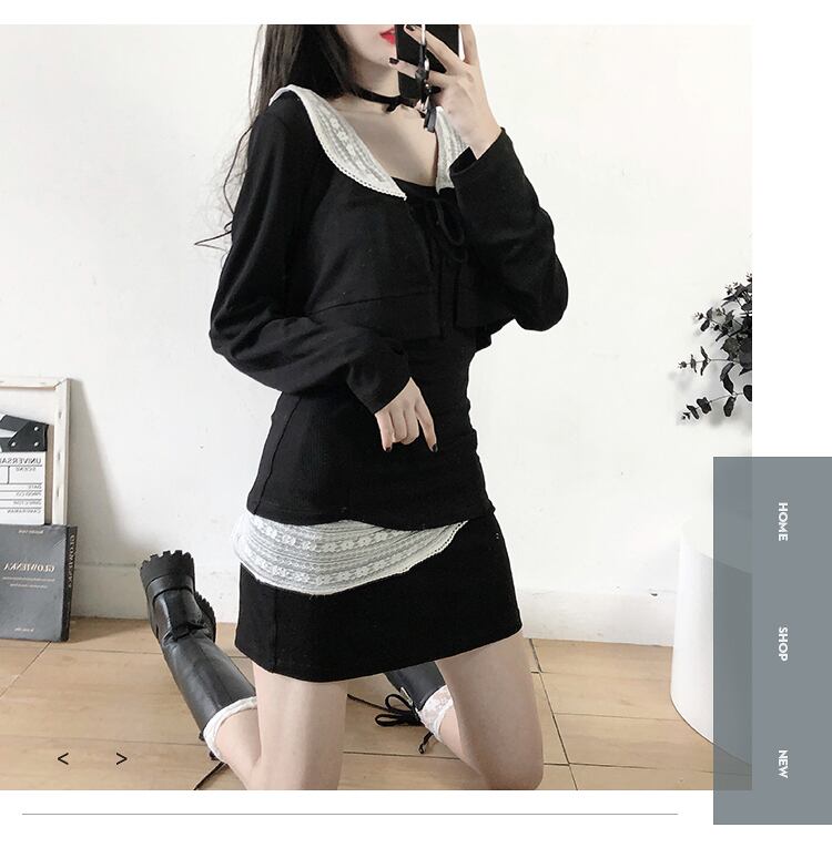 pinksavior黒と白のレースの弓の春の気質スプリットフェイクツーピースニットスーツ ホワイト ブラック リボン スプリング 春物 PSTB6021952457