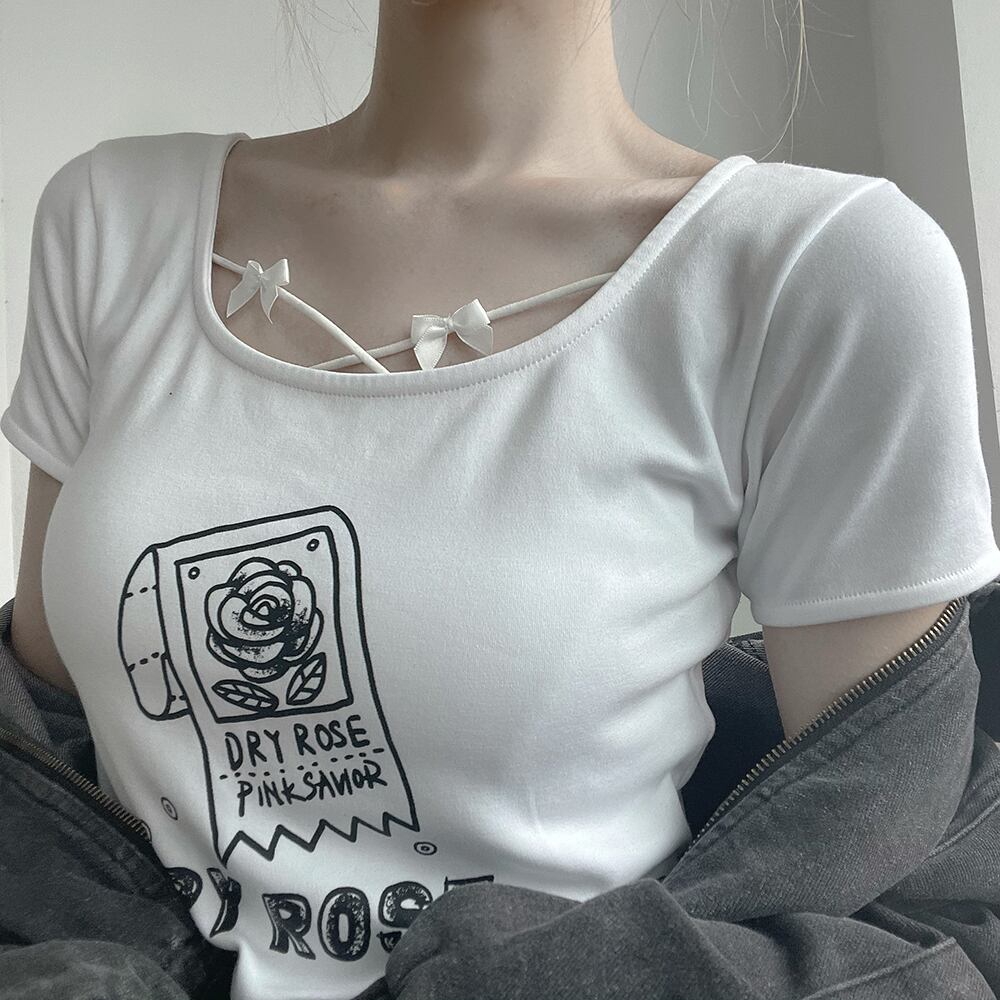 pinksavior[バラのしおり]プリント直角ショルダーラウンドネックスリム伸縮性春夏半袖 ショート ハーフスリーブ エラスティック スプリング 春物 サマー 夏物 Oネック PSTB31069356129