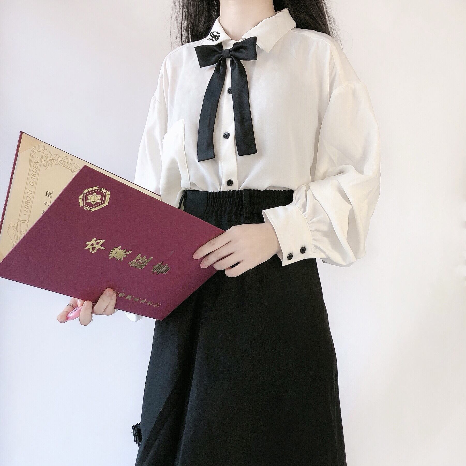 色:先のとがった襟ポケットシャツホワイト,ラウンドネクタイシャツホワイト,ネックラインスペシャルデザインシャツホワイト,ラウンドネック蝶ネクタイシャツブラック,プリーツミディスカートブラック,スリット入りロングスカート,黒いズボン,ベスト付きの特別なデザイン