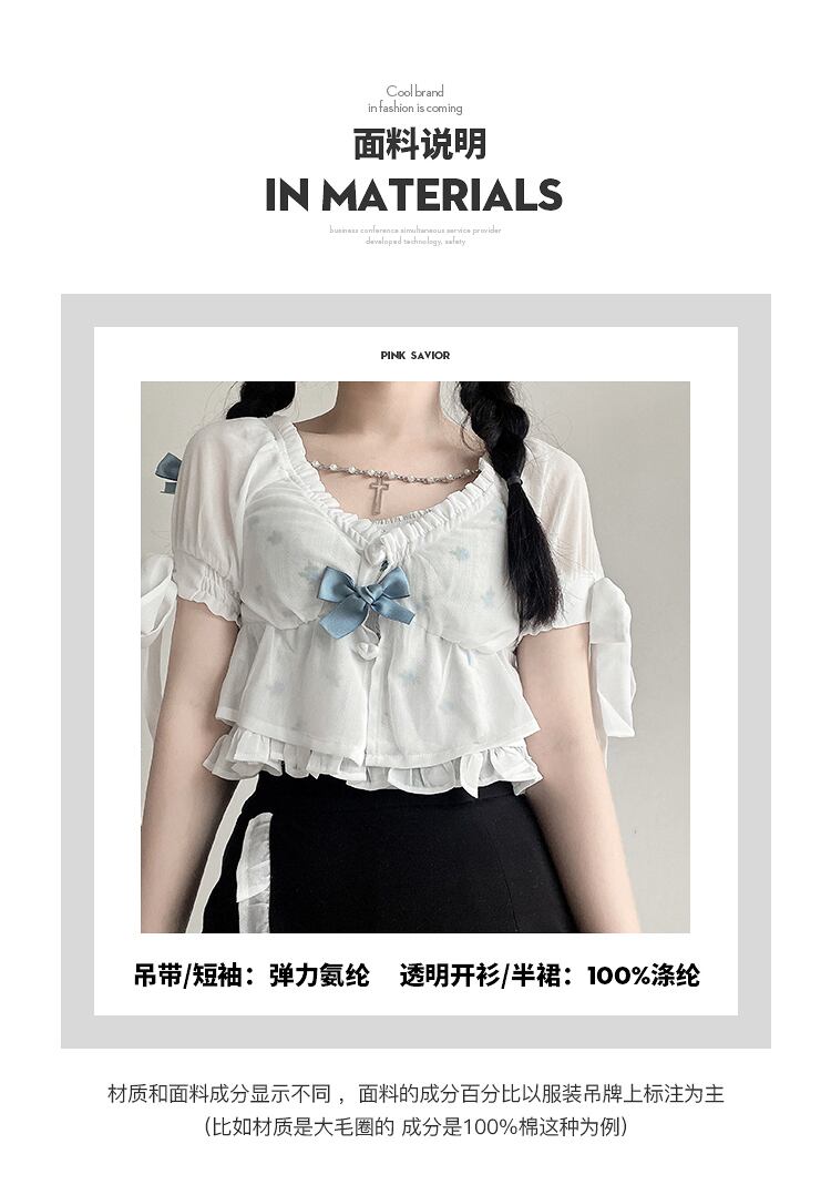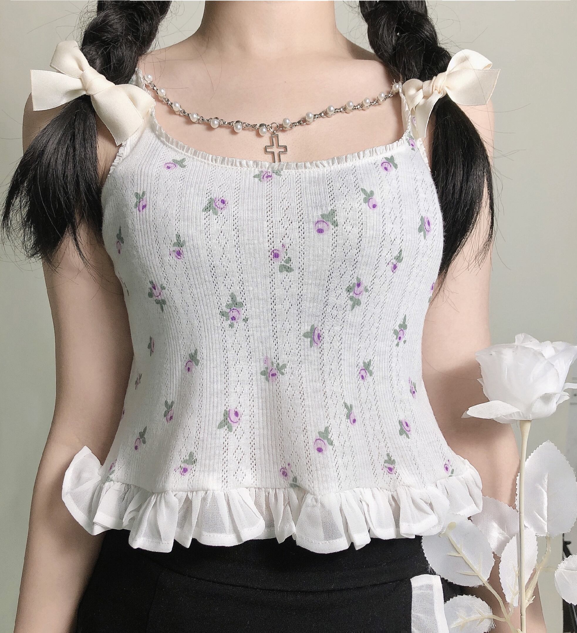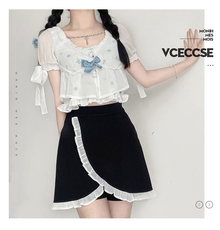 色:ブルーフラワースリング,パープルフラワースリング,白の透けシフォンカーディガン,紫の花半袖,ブルーフラワー半袖,ブラックレーススカート
