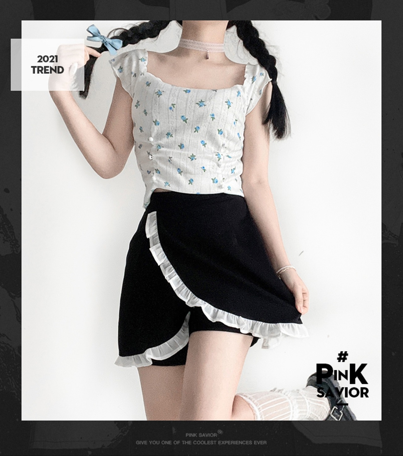 pinksaviorスモールフローラルシフォンスリングフローラルブラウスパフスリーブサマー半袖ラブボタンシャツ 夏物 花柄 PSTB46743372238