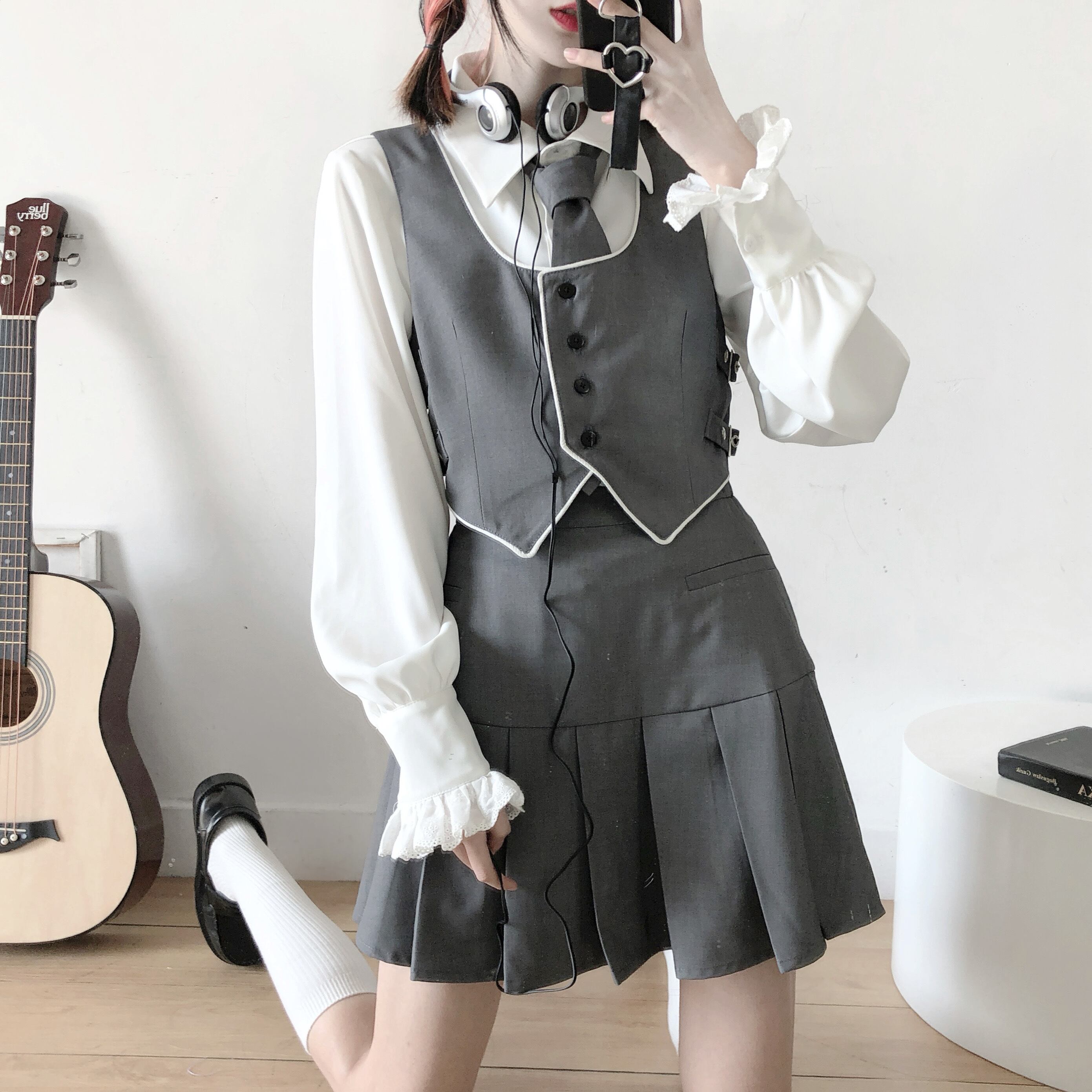 色:スーツベスト,ネクタイ付き長袖シャツ,プリーツスカート,斜めのネックラインのスウェットシャツ,黒いズボン,黒のエッジとネクタイとユニセックスの白いシャツ