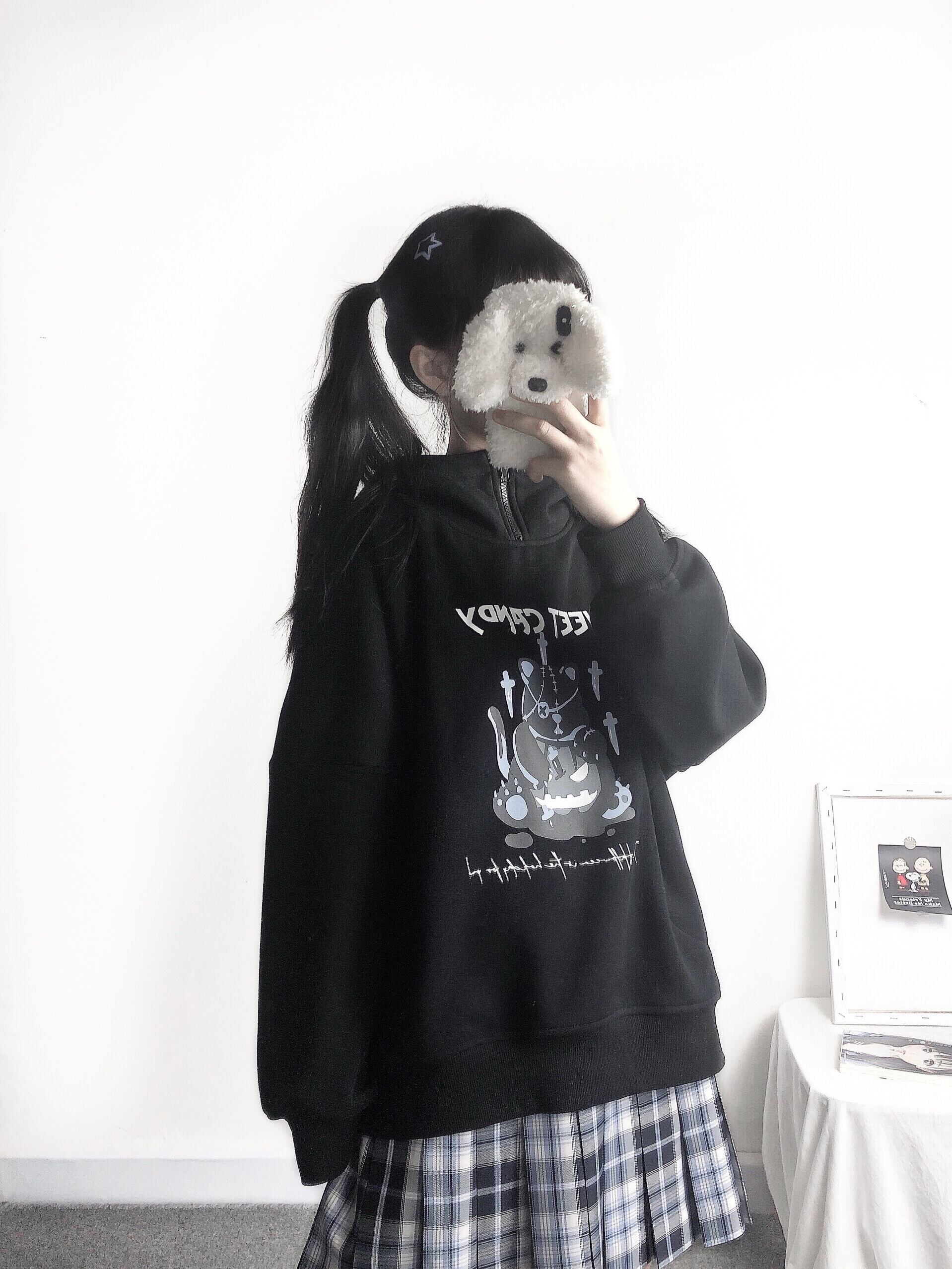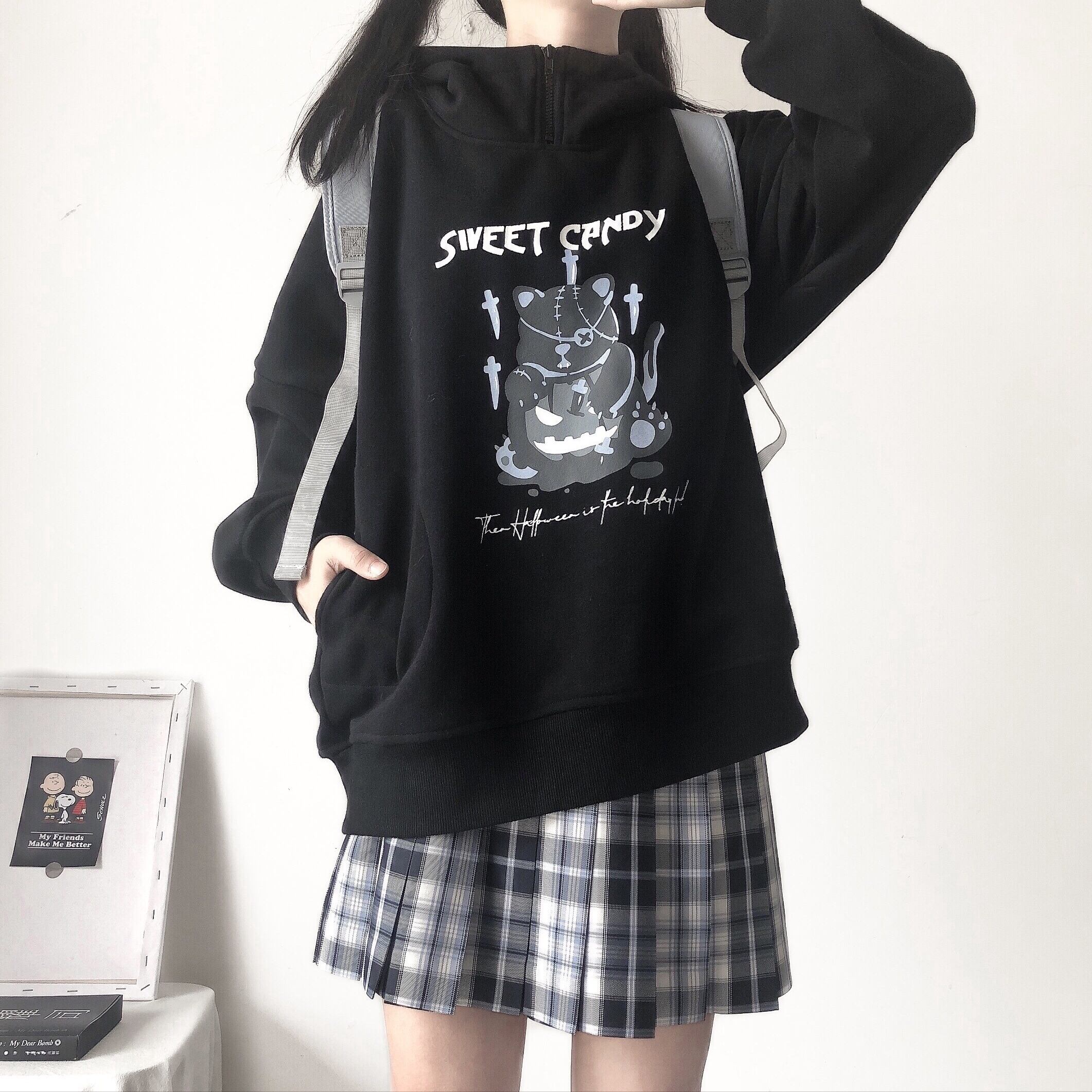 pinksaviorライトベアプラスベルベットジッパースモールハイカラーデザインポケットプリントフード付きセーター PSTB5535354999