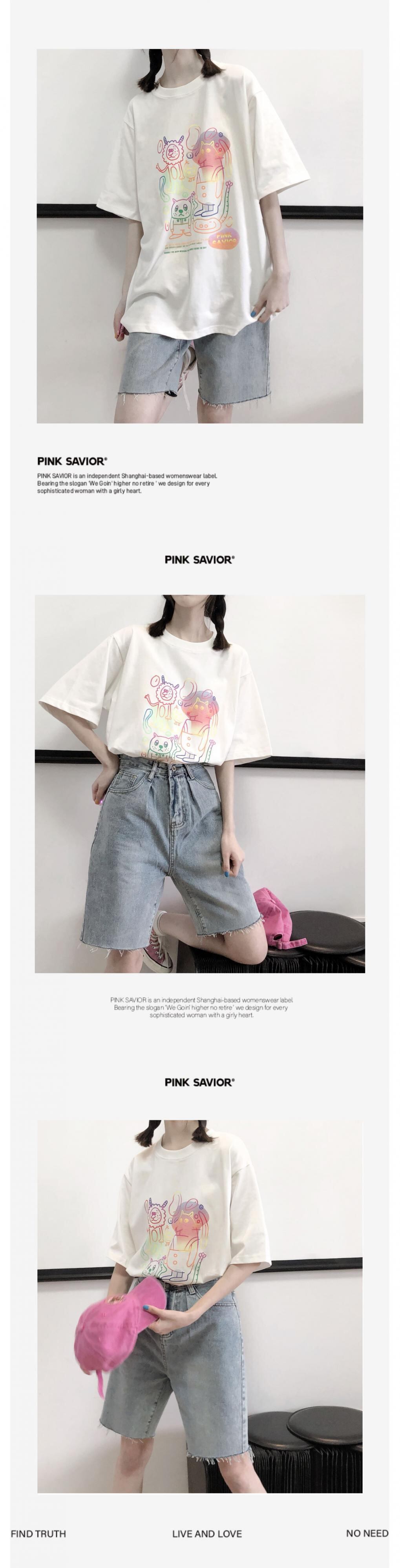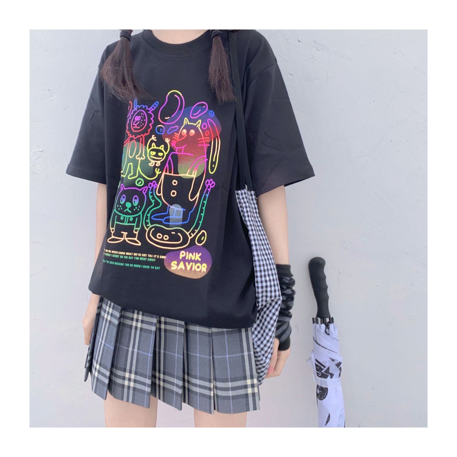 pinksavior暖かい虹の漫画純綿半袖Tシャツ女性の夏のパートナー特別な手描きのカップル コットン プリント サマー 夏物 ピュア PSTB12578704700