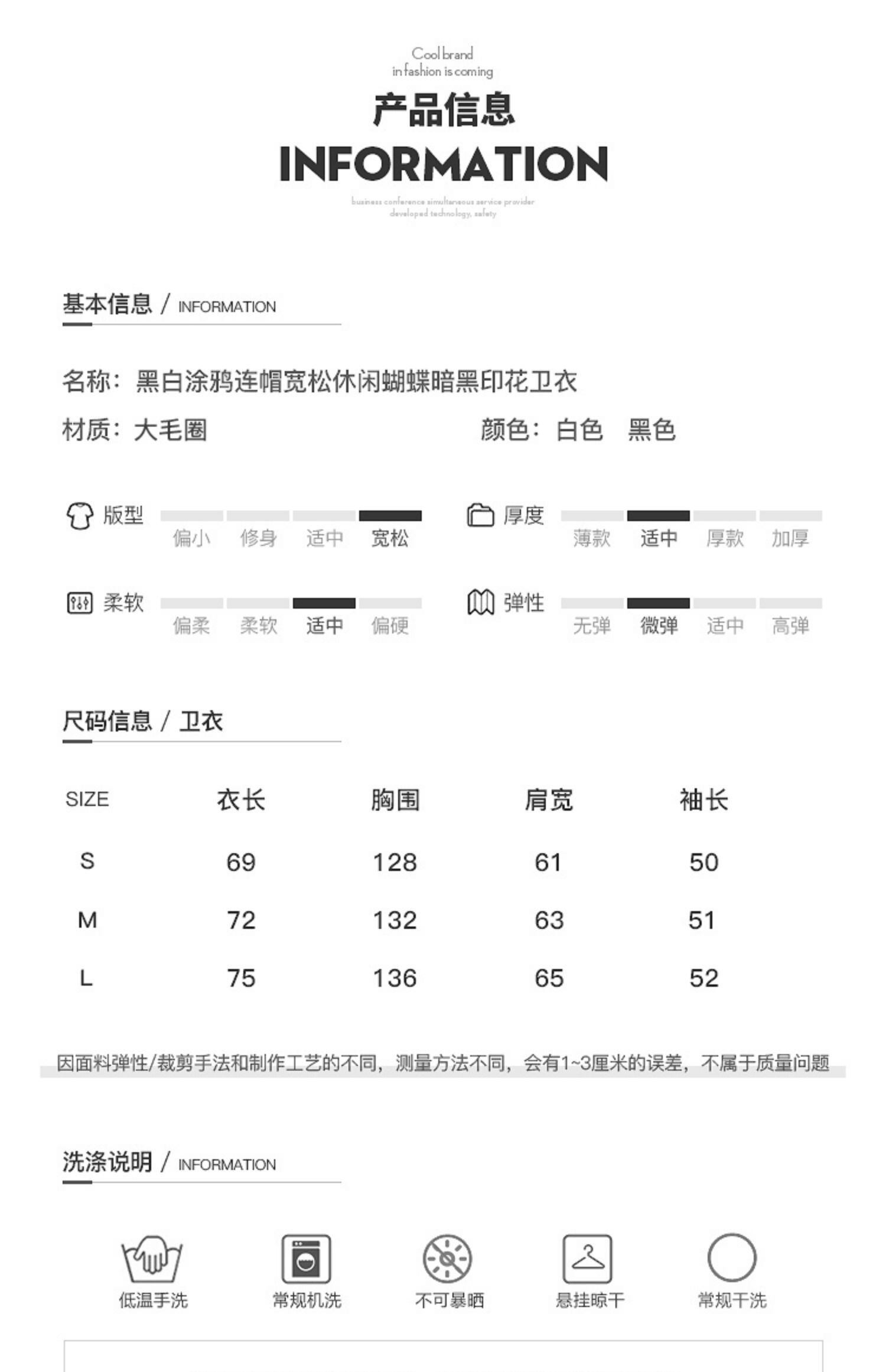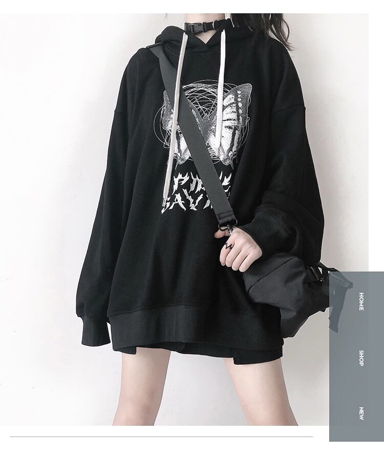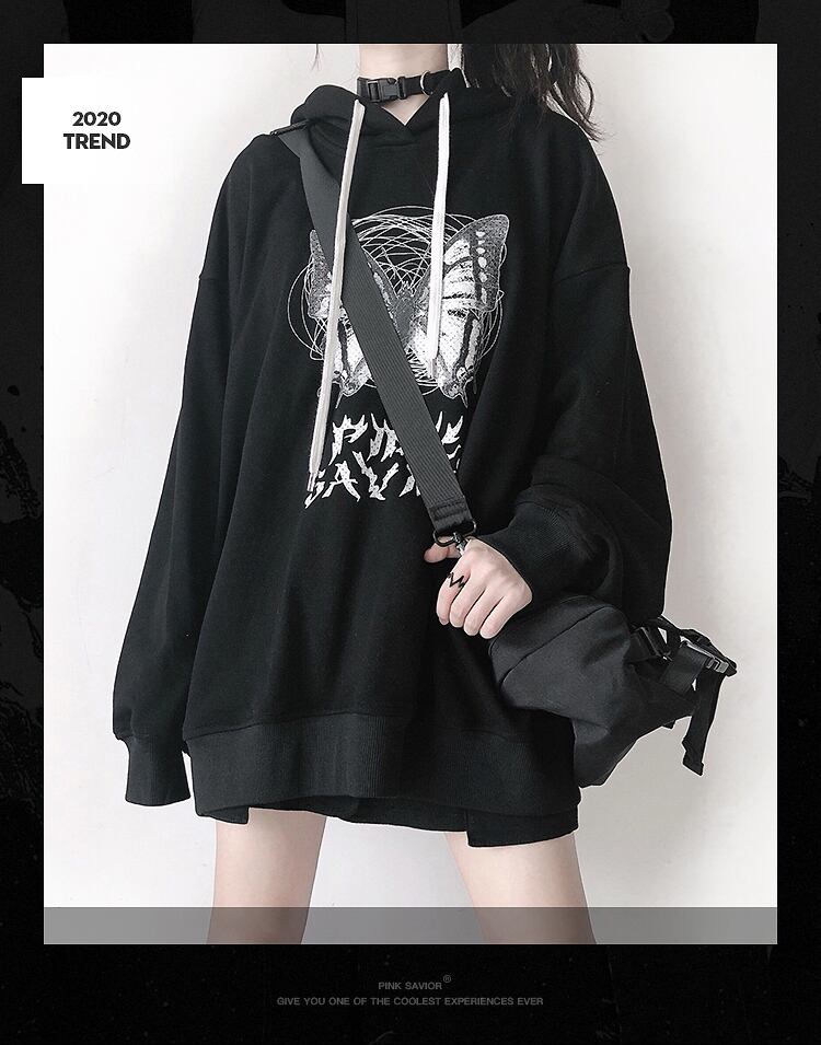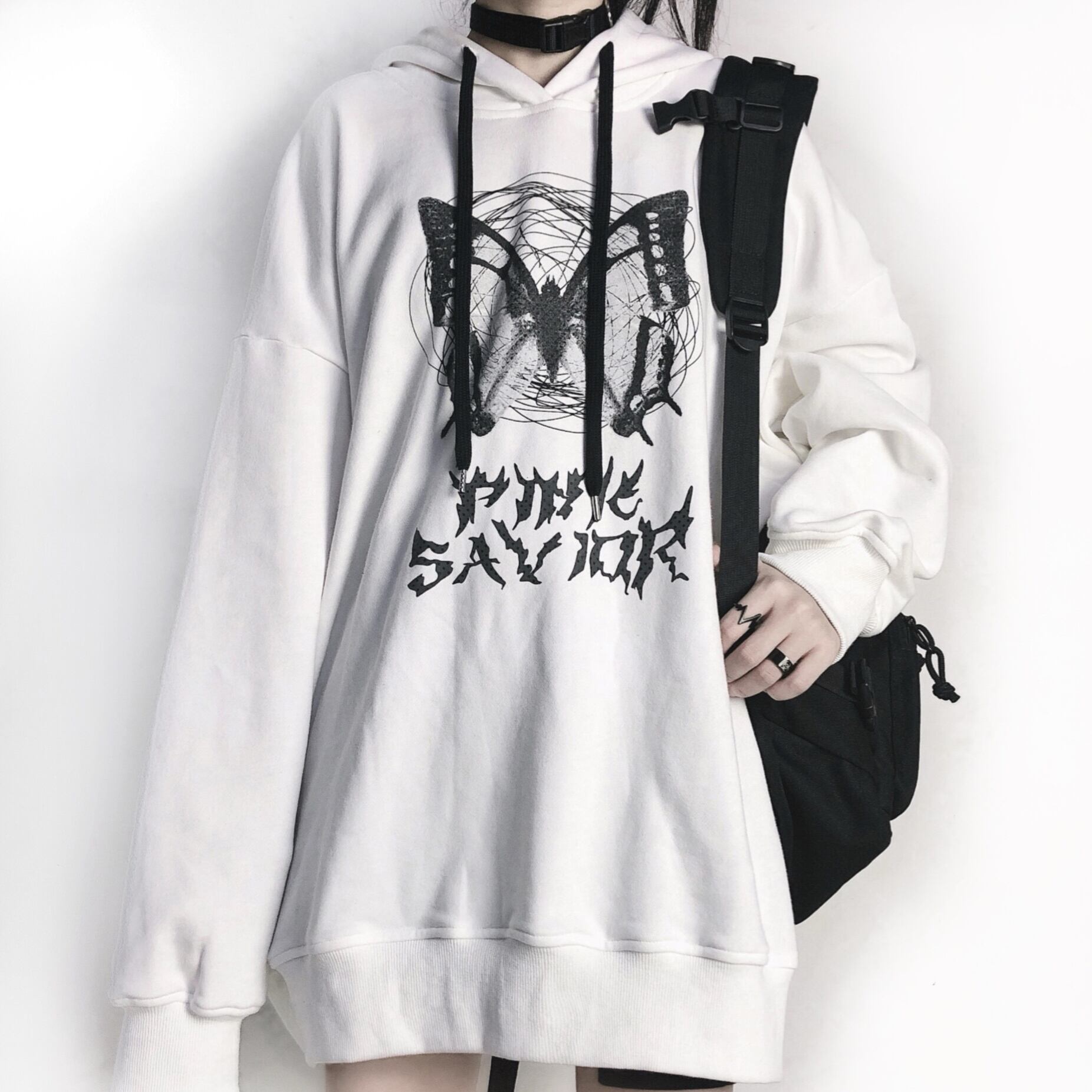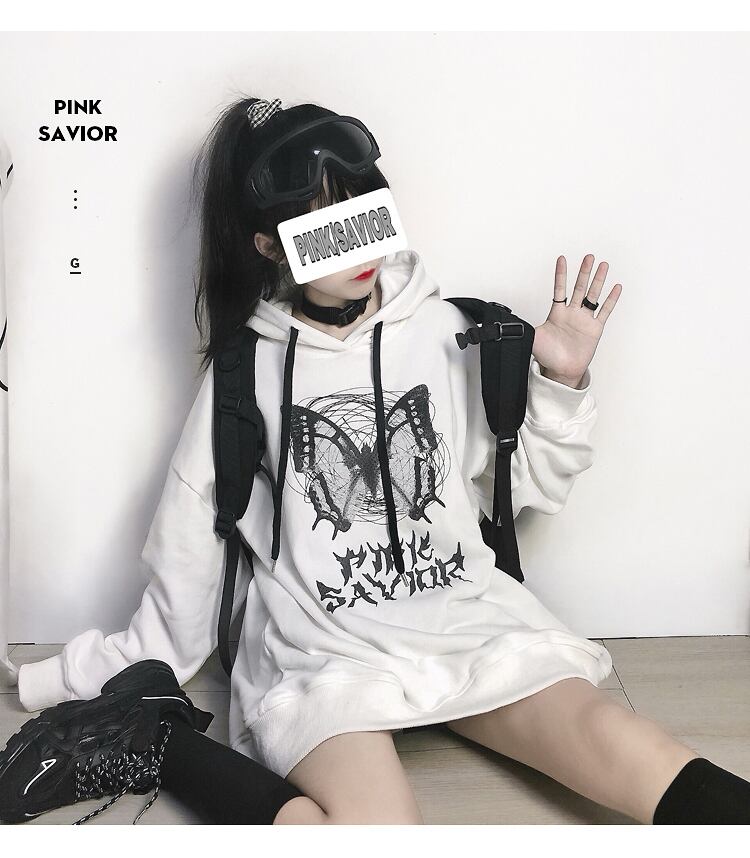pinksavior黒と白の落書きフード付きルーズカジュアルバタフライダークプリントセーター ホワイト ブラック PSTB16761451646
